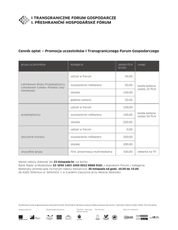 Cennik opłat — Promocja uczestników I Transgranicznego Forum Gospodarczego grupa uczestników członkowie Klubu Przedsiębiorcy, członkowie Czesko—Polskiej Izby Handlowej przedsiębiorcy kategoria udział w Forum 50,00 wystawienie rollbanera 50,00 stoisko wszystkie grupy uwagi każda kolejna osoba 25 PLN 100,00 gablota szklana 50,00 udział w Forum 100,00 wystawienie rollbanera 100,00 stoisko 200,00 udział w Forum otoczenie biznesu opłata PLN brutto każda kolejna osoba 50 PLN 0,00 wystawienie rollbanera 200,00 stoisko 200,00 film, prezentacja multimedialna 100,00 reklama na TV Wpłat należy dokonać do 23 listopada br. na konto: Bank Śląski o/Wodzisław 53 1050 1403 1000 0022 8888 9161 z dopiskiem Forum / kategoria. Materiały promocyjne na Forum należy dostarczyć 30 listopada od godz. 10.00 do 15.00 do KaSS Střelnica ul. Střelniční 1 w Czeskim Cieszynie przy Moście Wolności.