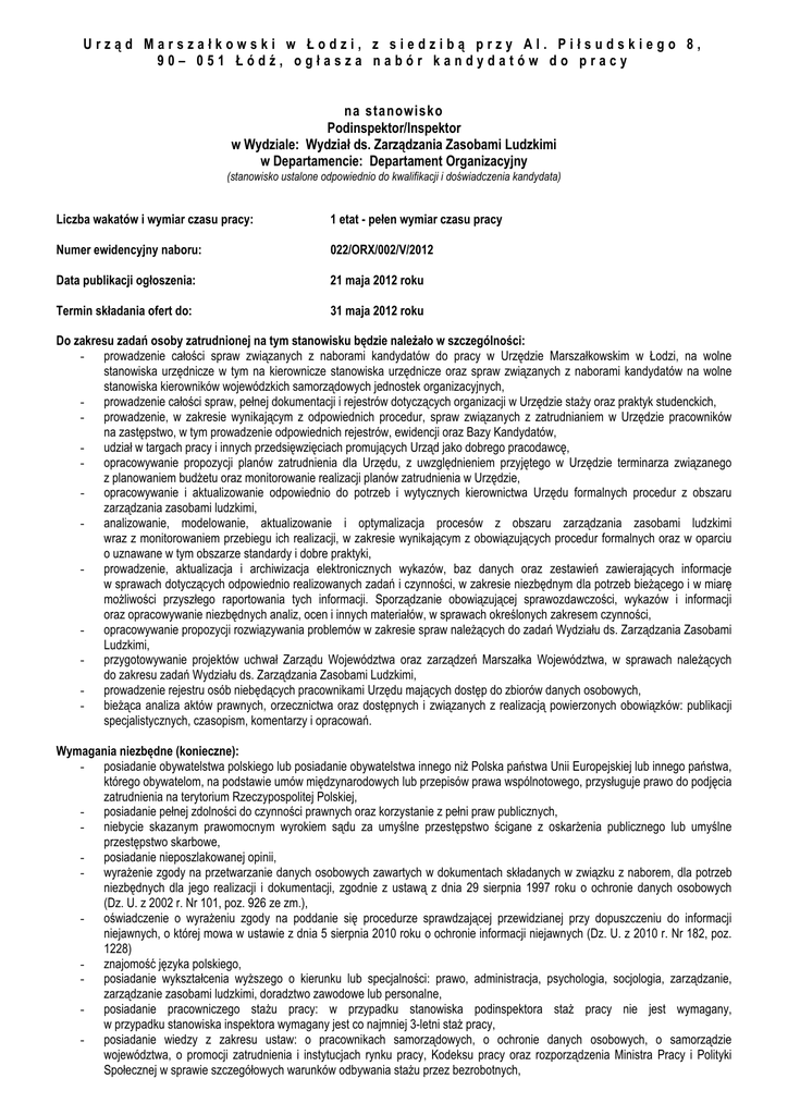 Urząd Marszałkowski w Łodzi, z siedzibą przy Al. Piłsudskiego 8, 90– 051 Łódź, ogłasza nabór kandydatów do pracy na stanowisko Podinspektor/Inspektor w Wydziale: Wydział ds. Zarządzania Zasobami Ludzkimi w Departamencie: Departament Organizacyjny (stanowisko ustalone odpowiednio do kwalifikacji i doświadczenia kandydata) Liczba wakatów i wymiar czasu pracy: 1 etat - pełen wymiar czasu pracy Numer ewidencyjny naboru: 022/ORX/002/V/2012 Data publikacji ogłoszenia: 21 maja 2012 roku Termin składania ofert do: 31 maja 2012 roku Do zakresu zadań osoby zatrudnionej na tym stanowisku będzie należało w szczególności: - prowadzenie całości spraw związanych z naborami kandydatów do pracy w Urzędzie Marszałkowskim w Łodzi, na wolne stanowiska urzędnicze w tym na kierownicze stanowiska urzędnicze oraz spraw związanych z naborami kandydatów na wolne stanowiska kierowników wojewódzkich samorządowych jednostek organizacyjnych, - prowadzenie całości spraw, pełnej dokumentacji i rejestrów dotyczących organizacji w Urzędzie staży oraz praktyk studenckich, - prowadzenie, w zakresie wynikającym z odpowiednich procedur, spraw związanych z zatrudnianiem w Urzędzie pracowników na zastępstwo, w tym prowadzenie odpowiednich rejestrów, ewidencji oraz Bazy Kandydatów, - udział w targach pracy i innych przedsięwzięciach promujących Urząd jako dobrego pracodawcę, - opracowywanie propozycji planów zatrudnienia dla Urzędu, z uwzględnieniem przyjętego w Urzędzie terminarza związanego z planowaniem budżetu oraz monitorowanie realizacji planów zatrudnienia w Urzędzie, - opracowywanie i aktualizowanie odpowiednio do potrzeb i wytycznych kierownictwa Urzędu formalnych procedur z obszaru zarządzania zasobami ludzkimi, - analizowanie, modelowanie, aktualizowanie i optymalizacja procesów z obszaru zarządzania zasobami ludzkimi wraz z monitorowaniem przebiegu ich realizacji, w zakresie wynikającym z obowiązujących procedur formalnych oraz w oparciu o uznawane w tym obszarze standardy i dobre praktyki, - prowadzenie, aktualizacja i archiwizacja elektronicznych wykazów, baz danych oraz zestawień zawierających informacje w sprawach dotyczących odpowiednio realizowanych zadań i czynności, w zakresie niezbędnym dla potrzeb bieżącego i w miarę możliwości przyszłego raportowania tych informacji. Sporządzanie obowiązującej sprawozdawczości, wykazów i informacji oraz opracowywanie niezbędnych analiz, ocen i innych materiałów, w sprawach określonych zakresem czynności, - opracowywanie propozycji rozwiązywania problemów w zakresie spraw należących do zadań Wydziału ds. Zarządzania Zasobami Ludzkimi, - przygotowywanie projektów uchwał Zarządu Województwa oraz zarządzeń Marszałka Województwa, w sprawach należących do zakresu zadań Wydziału ds. Zarządzania Zasobami Ludzkimi, - prowadzenie rejestru osób niebędących pracownikami Urzędu mających dostęp do zbiorów danych osobowych, - bieżąca analiza aktów prawnych, orzecznictwa oraz dostępnych i związanych z realizacją powierzonych obowiązków: publikacji specjalistycznych, czasopism, komentarzy i opracowań. Wymagania niezbędne (konieczne): - posiadanie obywatelstwa polskiego lub posiadanie obywatelstwa innego niż Polska państwa Unii Europejskiej lub innego państwa, którego obywatelom, na podstawie umów międzynarodowych lub przepisów prawa wspólnotowego, przysługuje prawo do podjęcia zatrudnienia na terytorium Rzeczypospolitej Polskiej, - posiadanie pełnej zdolności do czynności prawnych oraz korzystanie z pełni praw publicznych, - niebycie skazanym prawomocnym wyrokiem sądu za umyślne przestępstwo ścigane z oskarżenia publicznego lub umyślne przestępstwo skarbowe, - posiadanie nieposzlakowanej opinii, - wyrażenie zgody na przetwarzanie danych osobowych zawartych w dokumentach składanych w związku z naborem, dla potrzeb niezbędnych dla jego realizacji i dokumentacji, zgodnie z ustawą z dnia 29 sierpnia 1997 roku o ochronie danych osobowych (Dz. U. z 2002 r. Nr 101, poz. 926 ze zm.), - oświadczenie o wyrażeniu zgody na poddanie się procedurze sprawdzającej przewidzianej przy dopuszczeniu do informacji niejawnych, o której mowa w ustawie z dnia 5 sierpnia 2010 roku o ochronie informacji niejawnych (Dz. U. z 2010 r. Nr 182, poz. 1228) - znajomość języka polskiego, - posiadanie wykształcenia wyższego o kierunku lub specjalności: prawo, administracja, psychologia, socjologia, zarządzanie, zarządzanie zasobami ludzkimi, doradztwo zawodowe lub personalne, - posiadanie pracowniczego stażu pracy: w przypadku stanowiska podinspektora staż pracy nie jest wymagany, w przypadku stanowiska inspektora wymagany jest co najmniej 3-letni staż pracy, - posiadanie wiedzy z zakresu ustaw: o pracownikach samorządowych, o ochronie danych osobowych, o samorządzie województwa, o promocji zatrudnienia i instytucjach rynku pracy, Kodeksu pracy oraz rozporządzenia Ministra Pracy i Polityki Społecznej w sprawie szczegółowych warunków odbywania stażu przez bezrobotnych, - posiadanie wiedzy z zakresu zarządzania zasobami ludzkimi, w tym w szczególności dotyczącej: zagadnień związanych z adaptacją w miejscu pracy oraz metod i technik rekrutacji i selekcji, posiadanie umiejętności stosowania i korzystania z przepisów prawa powszechnie obowiązującego, sporządzania pism, dokumentów, informacji, zestawień, analiz oraz umiejętności posługiwania się programem prawniczym LEX, posiadanie bardzo dobrej znajomości i umiejętności korzystania z aplikacji biurowych typu: MS Word, Excel, Outlook, PowerPoint, posiadanie następujących kompetencji: postawa etyczna, sumienność, komunikatywność, kultura osobista, umiejętność stosowania odpowiednich przepisów, umiejętne organizowanie własnej pracy, zarządzanie informacją, nastawienie na klienta, wiedza specjalistyczna, umiejętność współpracy, umiejętność wyciągania wni