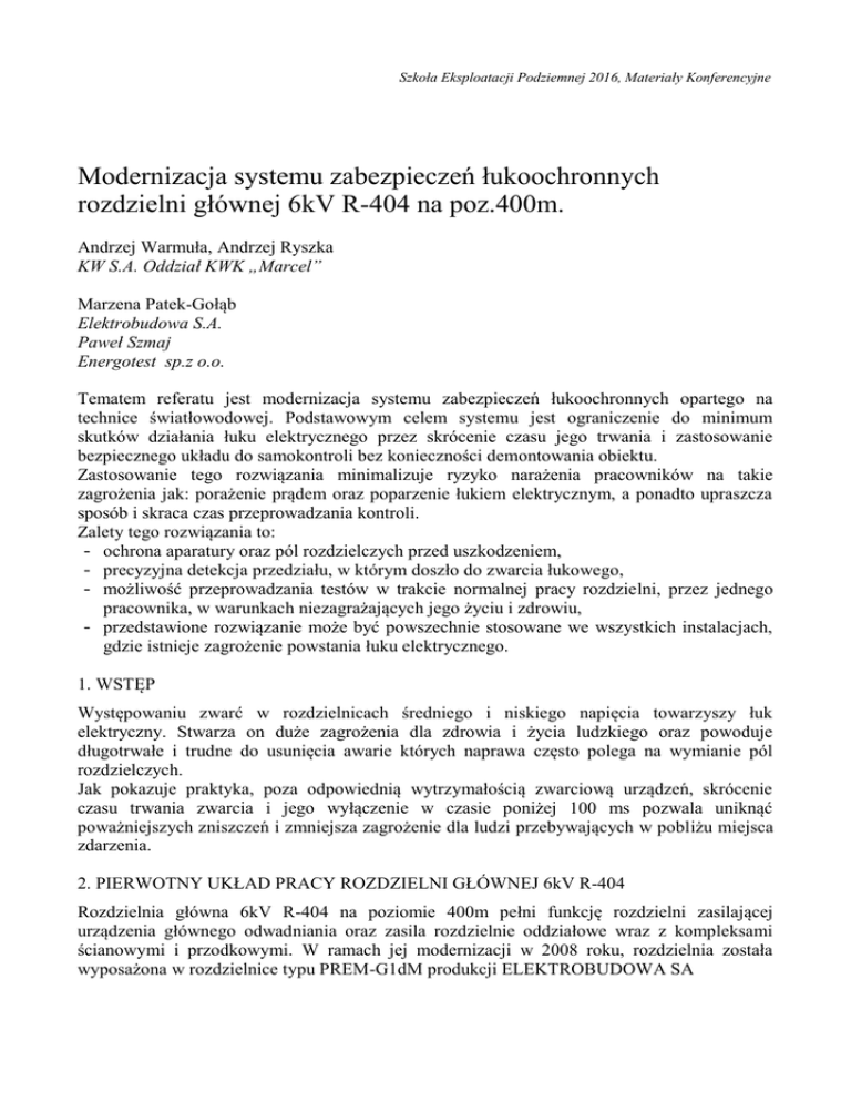 Szkoła Eksploatacji Podziemnej 2016, Materiały Konferencyjne Modernizacja systemu zabezpieczeń łukoochronnych rozdzielni głównej 6kV R-404 na poz.400m. Andrzej Warmuła, Andrzej Ryszka KW S.A. Oddział KWK „Marcel” Marzena Patek-Gołąb Elektrobudowa S.A. Paweł Szmaj Energotest sp.z o.o. Tematem referatu jest modernizacja systemu zabezpieczeń łukoochronnych opartego na technice światłowodowej. Podstawowym celem systemu jest ograniczenie do minimum skutków działania łuku elektrycznego przez skrócenie czasu jego trwania i zastosowanie bezpiecznego układu do samokontroli bez konieczności demontowania obiektu. Zastosowanie tego rozwiązania minimalizuje ryzyko narażenia pracowników na takie zagrożenia jak: porażenie prądem oraz poparzenie łukiem elektrycznym, a ponadto upraszcza sposób i skraca czas przeprowadzania kontroli. Zalety tego rozwiązania to: - ochrona aparatury oraz pól rozdzielczych przed uszkodzeniem, - precyzyjna detekcja przedziału, w którym doszło do zwarcia łukowego, - możliwość przeprowadzania testów w trakcie normalnej pracy rozdzielni, przez jednego pracownika, w warunkach niezagrażających jego życiu i zdrowiu, - przedstawione rozwiązanie może być powszechnie stosowane we wszystkich instalacjach, gdzie istnieje zagrożenie powstania łuku elektrycznego. 1. WSTĘP Występowaniu zwarć w rozdzielnicach średniego i niskiego napięcia towarzyszy łuk elektryczny. Stwarza on duże zagrożenia dla zdrowia i życia ludzkiego oraz powoduje długotrwałe i trudne do usunięcia awarie których naprawa często polega na wymianie pól rozdzielczych. Jak pokazuje praktyka, poza odpowiednią wytrzymałością zwarciową urządzeń, skrócenie czasu trwania zwarcia i jego wyłączenie w czasie poniżej 100 ms pozwala uniknąć poważniejszych zniszczeń i zmniejsza zagrożenie dla ludzi przebywających w pobliżu miejsca zdarzenia. 2. PIERWOTNY UKŁAD PRACY ROZDZIELNI GŁÓWNEJ 6kV R-404 Rozdzielnia główna 6kV R-404 na poziomie 400m pełni funkcję rozdzielni zasilającej urządzenia głównego odwadniania oraz zasila rozdzielnie oddziałowe wraz z kompleksami ścianowymi i przodkowymi. W ramach jej modernizacji w 2008 roku, rozdzielnia została wyposażona w rozdzielnice typu PREM-G1dM produkcji ELEKTROBUDOWA SA Rys. 1 Rozdzielnia główna 6kV R-404 Figure 1. Main switchgear 6kV R-404 W rozdzielnicach PREM-G1dM, poza zastosowaniem sterowników polowych, stanowiących zabezpieczenie nadmiarowoprądowe, dodatkowym zabezpieczeniem jest zabezpieczenie łukoochronne. Za pomocą klap wydmuchowych gazy połukowe z poszczególnych przedziałów skierowane są do wewnętrznego przedziału dekompresji, przez co skutki zwarcia (ciepło i ciśnienie) zostaną zatrzymane w urządzeniu, rozprężone w jego wnętrzu i mogą być skierowane w inną stronę z daleka od pracownika. Po otwarciu klap przedziału szyn zbiorczych lub członu wysuwnego, pod wpływem ciśnienia wytwarzanego przez łuk elektryczny, zamykają się zestyki łączników krańcowych działając na wyłączenie wyłącznika pola zasilającego. W przedziale przyłączowym każdego pola znajduje się czujnik ciśnienia, który przy jego wzroście pobudza przekaźnik zabezpieczenia łukowego działający na wyłączenie wyłącznika pola. Wewnętrzne klapy przedziałów z łącznikami krańcowymi Przetwornik ciśnienia A - przedział szyn zbiorczych B - przedział członu wysuwnego C - przedział przyłączowy D - przedział obwodów pomocniczych E - przedział dekompresji Rys. 2 Przekrój pola rozdzielnicy PREM-G1dM Figure 2. Cross section of PREM-G1dM switchgear 2 3. NIEDOGODNOŚCI ZWIĄZANE ZE STOSOWANIEM POPRZEDNIEGO SYSTEMU W zabezpieczeniach, reagujących na wzrost ciśnienia reakcja przekaźnika jest opóźniona o około 20 - 30 ms w związku z: - naturalnym opóźnieniem fali ciśnieniowej, jako efektu wtórnego w stosunku do zwarcia, - określonym czasem własnym zabezpieczenia. Zastosowane pierwotnie rozwiązanie, ograniczało czas zwarcia łukowego do 100ms. Przy częstotliwości sieci zasilającej wynoszącej 50Hz jest to aż 5 okresów trwania łuku elektrycznego ze wszystkimi jego skutkami. Ponadto dla zwarć łukowych doziemnych, małoprądowych i szybko wyłączonych możliwy jest brak uniesienia się klapy dekompresyjnej i brak zadziałania systemu. Dodatkowy problem stanowiło szybkie wyłączenie rozdzielni nadrzędnej, zasilającej rozdzielnię główną 6kV R-404 z powierzchni. W praktyce, wyłączenie pól zasilających na powierzchni z wykorzystaniem istniejących łącz teletechnicznych, nie było możliwe w czasie krótszym niż 100ms. Długi czas reakcji systemu spowodowany był koniecznością zastosowania dodatkowych urządzeń pośredniczących, mających na celu odseparowanie obwodów iskrobezpiecznych teletransmisyjnych od nieiskrobezpiecznych obwodów pól. Podstawowym problemem dla obsługi rozdzielni była okresowa kontrola sprawności zabezpieczenia łukoochronnego. Kontrola polegała na dotarciu do każdego z czujników, wchodzących w skład systemu, w celu jego pobudzenia i sprawdzenia poprawności działania. Przeprowadzenie ww. kontroli wymagało demontażu wszystkich pól rozdzielczych oraz skontrolowania ponad 60 czujników krańcowych i czujników depresji. Wymuszało to zatrudnienie dużej grupy pracowników w dniach wolnych od pracy. Należy nadmienić, że prace te prowadzone były w szczególnych warunkach zagrożenia życia i zdrowia ludzkiego na podstawie polecenia pisemnego. 4. OPIS WPROWADZONYCH ZMIAN W rozdzielni głównej 6kV R-404 zastosowano światłowodowe zabezpieczenie łukoochronne typu ZŁ-4, które zostało zabudowane zamiast poprzedniego systemu, bez kosztownych przeróbek pól rozdzielczych. Jako kryterium wykrycia zwarcia łukowego zabezpieczenie wykorzystuje informację o: - spadku napięcia na szynach chronionej rozdzielnicy, - pojawieniu się intensywnego promieniowania świetlnego. Zabezpieczenie pracuje w oparciu o struk