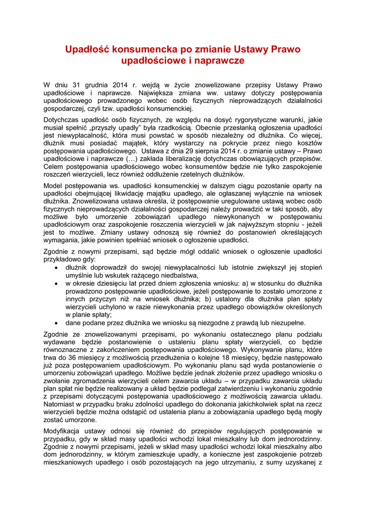 Upadłość konsumencka po zmianie Ustawy Prawo upadłościowe i naprawcze W dniu 31 grudnia 2014 r. wejdą w życie znowelizowane przepisy Ustawy Prawo upadłościowe i naprawcze. Największa zmiana ww. ustawy dotyczy postępowania upadłościowego prowadzonego wobec osób fizycznych nieprowadzących działalności gospodarczej, czyli tzw. upadłości konsumenckiej. Dotychczas upadłość osób fizycznych, ze względu na dosyć rygorystyczne warunki, jakie musiał spełnić „przyszły upadły” była rzadkością. Obecnie przesłanką ogłoszenia upadłości jest niewypłacalność, która musi powstać w sposób niezależny od dłużnika. Co więcej, dłużnik musi posiadać majątek, który wystarczy na pokrycie przez niego kosztów postępowania upadłościowego. Ustawa z dnia 29 sierpnia 2014 r. o zmianie ustawy – Prawo upadłościowe i naprawcze (…) zakłada liberalizację dotychczas obowiązujących przepisów. Celem postępowania upadłościowego wobec konsumentów będzie nie tylko zaspokojenie roszczeń wierzycieli, lecz również oddłużenie rzetelnych dłużników. Model postępowania ws. upadłości konsumenckiej w dalszym ciągu pozostanie oparty na upadłości obejmującej likwidację majątku upadłego, ale ogłaszanej wyłącznie na wniosek dłużnika. Znowelizowana ustawa określa, iż postępowanie uregulowane ustawą wobec osób fizycznych nieprowadzących działalności gospodarczej należy prowadzić w taki sposób, aby możliwe było umorzenie zobowiązań upadłego niewykonanych w postępowaniu upadłościowym oraz zaspokojenie roszczenia wierzycieli w jak najwyższym stopniu - jeżeli jest to możliwe. Zmiany ustawy odnoszą się również do postanowień określających wymagania, jakie powinien spełniać wniosek o ogłoszenie upadłości. Zgodnie z nowymi przepisami, sąd będzie mógł oddalić wniosek o ogłoszenie upadłości przykładowo gdy: dłużnik doprowadził do swojej niewypłacalności lub istotnie zwiększył jej stopień umyślnie lub wskutek rażącego niedbalstwa, w okresie dziesięciu lat przed dniem zgłoszenia wniosku: a) w stosunku do dłużnika prowadzono postępowanie upadłościowe, jeżeli postępowanie to zostało umorzone z innych przyczyn niż na wniosek dłużnika; b) ustalony dla dłużnika plan spłaty wierzycieli uchylono w razie niewykonania przez upadłego obowiązków określonych w planie spłaty; dane podane przez dłużnika we wniosku są niezgodne z prawdą lub niezupełne. Zgodnie ze znowelizowanymi przepisami, po wykonaniu ostatecznego planu podziału wydawane będzie postanowienie o ustaleniu planu spłaty wierzycieli, co będzie równoznaczne z zakończeniem postępowania upadłościowego. Wykonywanie planu, które trwa do 36 miesięcy z możliwością przedłużenia o kolejne 18 miesięcy, będzie następowało już poza postępowaniem upadłościowym. Po wykonaniu planu sąd wyda postanowienie o umorzeniu zobowiązań upadłego. Możliwe będzie jednak złożenie przez upadłego wniosku o zwołanie zgromadzenia wierzycieli celem zawarcia układu – w przypadku zawarcia układu plan spłat nie będzie realizowany a układ będzie podlegał zatwierdzeniu i wykonaniu zgodnie z przepisami dotyczącymi postępowania upadłościowego z możliwością zawarcia układu. Natomiast w przypadku braku zdolności upadłego do dokonania jakichkolwiek spłat na rzecz wierzycieli będzie można odstąpić od ustalenia planu a zobowiązania upadłego będą mogły zostać umorzone. Modyfikacja ustawy odnosi się również do przepisów regulujących postępowanie w przypadku, gdy w skład masy upadłości wchodzi lokal mieszkalny lub dom jednorodzinny. Zgodnie z nowymi przepisami, jeżeli w skład masy upadłości wchodzi lokal mieszkalny albo dom jednorodzinny, w którym zamieszkuje upadły, a konieczne jest zaspokojenie potrzeb mieszkaniowych upadłego i osób pozostających na jego utrzymaniu, z sumy uzyskanej z jego sprzedaży wydziela się upadłemu kwotę odpowiadającą przeciętnemu czynszowi najmu lokalu mieszkalnego w tej samej lub sąsiedniej miejscowości za okres od dwunastu do dwudziestu czterech miesięcy. Ww. kwota określana jest przez sędziego komisarza, na wniosek upadłego, po uwzględnieniu jego potrzeb mieszkaniowych i osób pozostających na jego utrzymaniu. Ponadto upadłość będzie możliwa nawet w przypadku, gdy dłużnik będzie miał tylko jednego wierzyciela. Obecnie takie rozwiązanie jest niemożliwe. Nowelizacja wprowadziła również niże opłaty od wniosku o ogłoszenie upadłości. Obecnie opłata stała wynosi 200 zł, natomiast po wejściu w życie zmienionych przepisów opłata taka wyniesie 30 zł. Ponadto, z uwagi na spodziewany wzrost ilości postępowań o ogłoszenie upadłości osób fizycznych nieprowadzących działalności gospodarczej, zmieniono skład sądu orzekającego w przedmiocie ogłoszenia upadłości. W przedmiocie ogłoszenia upadłości będzie orzekał sąd upadłościowy w składzie jednego sędziego. Możliwe również będzie wyznaczenie referendarza sądowego do pełnienia funkcji sędziego komisarza. Anna Hoffmann aplikant radcowski