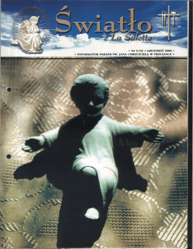 • N r 9 (9 ) • GRUDZIEŃ 2000 • • INFORM ATOR PARAFII ŚW. JANA CHRZCICIELA W TRZCIANCE • 2 Światło z La Salette n r 9 (9) grudzień 2000 AKTUALNOŚCI 11.XI. Dzieci ze scholki parafialnej i Żywego Różań ca, pod opieką s. Barbary i s. Beaty udały się z pielgrzym ką d o Górki Klasztornej. Opiekę duchową nad ta gru pą sprawował ks. Krzysztof. Dzieci modliły się u stóp Mat ki Bożej, uczestniczyły w Eu charystii, a także zwiedzały sanktuarium Maryjne. ❖ ❖❖ 26.XI. Straż Honorowa Najświętszego Serca Pana Je zusa z naszej parafii obcho dziła 43 rocznicę swojego ist nienia. Jej członkowie dzię kowali Bogu za wszystkie lata wspólną Eucharystią i adora cją Najświętszego Sakramen tu. ❖ ❖ ❖ Również tego dnia odbył się w naszej parafii dekanal- KRONIKA PARAFIALNA ny zjazd k atech etów , na którym om ów iono bieżące sprawy. ❖❖❖ 3-XII. Na Mszy św. dzie cięcej o godz. 11.00 w nie dzielę zawitał do naszej pa rafii niezwykły gość. Dzieci miały okazję spotkać się ze św. Mikołajem i otrzymać od niego upominki. Również w e wtorek o godz. 16.00 dzieci spotkały się w kościele ze świętym Mikołajem. ❖ ❖ ❖ 16.XII. Jak co miesiąc spotykamy się na wspólnej modlitwie wieczornej w in tencji Ojca św. zachęcajmy się nawzajem do tego, aby dzię kować na modlitwie za dar wielkiego Polaka. Spowiedź przed świętami Bożego Narodzenia Chrzty: Monika Stachowiak Patrycjusz Dużyja Grzegorz Michalak Przemysław Kozłowski Martyna Krajewska Jakub Łopato Krzysztof Wiśniewski Julia Powchowicz Jakub Dankiewicz Marcin Plewa Sta ły s ię d z ie ć m i B o żym i Śluby: Lachowicz Wiesław i Katarzyna Czemko Jacek Piotrowski i Alina Pawłowska Piotr Sudoł i Karolina Prankiewicz S z c z ę ś ć B o że m ło d ej p a r z e Pogrzeby: Jan Gudynowski Ewa Wojtoń Aleksandra Ciukaj Wojciech Wiedera Apolonia Jabłońska Janina Bernik W ieczny o d p o c z y n e k r a c z im d a ć P a n ie Środ a 2 0 .1 2 .2 0 0 0 r. W godzinach: 10.00-11.00 oraz 15.30-18.00. P iątek 2 2 .1 2 .2 0 0 0 r. W godzinach: 6.30-8.00 oraz 16.00.18.00. S o b o ta 23.12 .2 0 0 0 r. W godzinach: 6.30-8.00 oraz 16.00-18.00. Inform ujem y, że koszt p om n ik a Ojca Św iętego Jana Pawła II w y n ió sł 54.000 zł. Na ten cel zebraliśm y 54.111 zł. • Kancelaria parafii św. Jana Chrzciciela (od osób prywatnych, firm i wspólnot parafialnych) - 11.644 zł. • Tace, skarbonki, festyn odpustowy - 1 9 .4 8 8 zł. • Cegiełki - 22.979 zł. 90% wpływ ów z za kupu cegiełek pochodziło z naszej p a ra fii. N iech d o b r y B óg w y n a g r o d z i h o jn o ść serc . INFORMATOR PARAFII P.W. ŚW. JANA CHRZCICIELA W TRZCIANCE Redaguje: Ks. Zbigniew Wal MS - (red. nacz.) z zespołem. Adres redakcji: Parafia Św. Jana Chrzciciela, ul. Żeromskiego 39, 64-980 Trzcianka, tel. (0 67) 216-20-44 Redakcja zaprasza do współredagowania naszego informatora. Zastrzega sobie prawo wyboru i skracania artykułów. „Bóg się rodzi, moc truchleje... ” 3 Światło z La Salette nr 9 (9) grudziei'i 2000 Kochani Parafian ie! Życie nasze jest Adwentem tzn. oczekiwaniem na spotkanie z Tym, który do końca zrealizuje szczęście jakie tu na ziemi nie jest nam dane. Te coroczne Adwenty zakoń czone przyjściem Pana w Liturgii Bożonarodzeniowej wpisane są w to wielkie oczeki wanie świata na powrót do Domu Ojca. Na nadchodzące Święta życzę, by każdy z nas osobiście doświadczył obecności Boga w swoim życiu. A to spotkanie z Nim niech emanuje na codzienne spotkanie z bliźnim. Niech zatem ogarnia nas miłość, dobroć, życzliwość i prostota życia i bezgraniczne zaufanie Bogu, które wypływa z tej ogromnej tajemnicy miłości Boga do człowieka okazanej w Betlejemską Noc. A Nowy Rok 2001 będzie tym czasem, w którym pełniej odkryjemy Boga w naszym życiu. W imieniu Redakcji oraz Księży Misjonarzy Saletynów Ks. Zbigniew Wal MS Zwyczaje i obrzędy Bożego Narodzenia Czy można usłyszeć słowa pięk niejsze od tych, które głosili anioło wie pasterzom, wielbiąc Najwyższego: Chwała na wysokościach Bogu, a na ziemi pokój ludziom jego upodobania (Łk 2,14)? Czy można być bardziej wzruszonym od pasterzy, którzy w betlejem skiej grocie znaleźli „niemowlę owi nięte w pieluszki i leżące w żłobie” (Łk 2,12)? Czy m ożna przeżyć Noc bardziej cudowną i cichą od tej, w któ rej: „ukazała się łaska Boga niosąca zbawienie wszystkim ludziom (Tt 2,12) i w której nierozerwalnie związały się r a dość, pokój i miłość? Oto Syn Boży stał się człowiekiem, aby ludzie mogli stać się synami Bożymi. Boże Narodzenie... Święta pełne nadziei. Poprzedzone są one Adwen tem, czasem oczekiwania na przyjście Pana. W Kościele rzymskim adw ent zaczęto praktykować w V/VI w. Msza św. adwentowa - roraty - wprow adzo na została w Polsce przez św. Kingę w XIII w; jest ona hołdem składanym Matce Bożej za Jej udział w dziele zba wienia. Przyozdobiona świeca, zapa lona podczas tej Mszy św. symbolizu je właśnie Maryję. Początkowo Kościół obchodził Boże Narodzenie 6 stycz nia, w uroczystość Epifanii, czyli O b jawienia Pańskiego. Jednak bullą pa pieża Kaliksta II obchody świąt prze niesiono na 25 grudnia. Był to dzień państw ow y, w którym o d d aw an o cześć „Niezwyciężonemu bogu Słoń ce”. Chrześcijanie postanowili uczcić w dniu przesilenia zimowego „Świa tłość świata” - Jezusa Chrystusa i upa miętnili Jego narodziny. Jest to data umowna, bo przecież nie znamy do kładnej daty urodzin Zbawiciela. Ewangelia św. Mateusza mówi, że gdy Jezus urodził się w Betlejem, przy byli do Jerozolimy Mędrcy ze Wscho du i pytali, „gdzie jest now o narodzo ny król żydowski? Ujrzeliśmy bowiem Jego gwiazdę”. I dziś wypatrujemy na niebie tej pierwszej gwiazdki, aby za siąść do wigilijnej Wieczerzy. Zanim to jednak nastąpi, trzeba przygotować tradycyjne potrawy (12 - tyle ile jest m