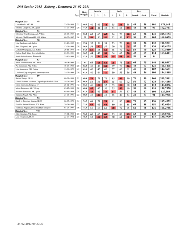 DM Senior 2013 Søborg , Denmark 23-02-2013 Body Age Weight Jerk Best 2. 3. 1. 2. 3. 40 41 43 41 44 43 55 54 58 56 58 59 63 50 65 50 67 52 74 52 76 55 55 54 55 44 51 58 57 55 47 54 59 57 60 50 54 73 70 65 64 65 65 45 40 40 68 48 43 44 68 51 46 47 71 53 46 47 43 35 71 56 50 47 43 38 68 63 55 60 53 Snatch Jerk Total Sinclair 43 43 58 56 101 99 171,645 172,3761 80 57 65 50 76 55 141 105 215,3153 160,8429 76 73 70 67 68 81 75 72 70 68 59 57 55 47 51 76 73 70 67 0 135 130 125 114 0 191,5201 185,6275 177,1059 163,6421 75 69 57 50 75 73 60 53 78 76 61 56 65 48 46 44 75 73 61 56 140 121 107 100 188,0597 161,1405 144,3661 134,1818 76 59 52 50 45 38 85 65 55 55 54 45 90 69 58 57 54 49 90 72 60 60 57 53 76 56 52 50 43 38 90 72 60 60 57 53 166 128 112 110 100 91 209,3981 164,4288 143,6056 138,7578 127,393 114,7905 71 63 58 73 68 61 81 80 70 85 84 72 88 88 75 71 63 61 85 88 75 156 151 136 187,4572 182,6434 161,2766 63 57 66 57 75 60 80 64 85 0 63 53 80 64 143 117 169,5776 139,7979 48 WeightClass Lene Østvik, VK. 49 23-09-1988 25 46,1 Kristina Laugesen, AK. Jyden 11-09-1984 29 44,9 Christina Trier Ejstrup, AK. Viking 28-04-1985 28 52,2 Victoria Obel Rosendahl, AK. Viking 08-03-1997 16 52 Line Jacobsen, AK. Jyden 21-10-1992 21 57,4 Sara Ellegaard, AK. Jyden 17-01-1993 20 56,9 Lisbeth Østergaard, AK. Jyden 20-11-1973 40 57,5 Helene Bach Kjær, Sportshøjskolen 05-06-1991 22 56,5 Jessie Sahra Larsen, Ålholm IF 21-10-1998 15 57,1 Sarah Hammelstrup, AK. Atlas 10-08-1990 23 62 Pia Simonsen, AK. Jyden 18-07-1988 25 62,8 Lisa Jørgensen, AK. Gotha 15-08-1972 41 61,6 Liselotte Kjep Nørgaard, Sportshøjskolen 31-05-1993 20 62,1 Karina Hauge, IK 99 08-09-1988 25 68,4 Ditte Elisabeth Jacobsen, Copenhagen BarBell Club 14-04-1987 26 66,4 Maya Schröder, Ringsted IF. 26-02-1971 42 66,6 Mette Pedersen, AK. Viking 03-12-1993 20 68,4 Susanne Sørensen, AK. Jyden 05-11-1984 29 67,3 Katarina Nagel, AK. Atlas 21-03-1991 22 68,4 Sarah L. Troelsen Krarup, IK 99 06-03-1979 34 74,5 Pernille Sølund Hansen, VK. Kono 28-04-1990 23 73,6 Mathilde Aagaard, Bokseklubben Limfjord 01-04-1997 16 71,4 Julie Almsten, VK. Kono 17-02-1988 25 76,4 Lise Mogensen, IK 99 23-07-1982 31 75,3 53 WeightClass 58 WeightClass 63 WeightClass 69 WeightClass 75 WeightClass WeightClass Snatch 1. 75+ 24-02-2013 09:37:39 DM Senior 2013 Søborg , Denmark 23-02-2013 Body Age Weight Daniel Kristensen, Forum VK 08-06-1997 16 53,2 Christoffer Jørgensen, AK. Jyden 21-10-1996 17 56 Thomas Hansen, VK. Kono 09-09-1995 18 53,7 Best 3. 1. 2. 3. 70 45 44 74 48 47 76 51 50 80 64 57 0 64 61 0 67 63 80 82 83 85 86 85 105 96 110 101 88 84 82 92 87 86 95 87 87 110 112 105 120 90 85 80 80 65 125 130 93 93 85 90 80 86 84 88 65 65 115 105 110 102 93 93 82 80 90 80 120 112 115 102 96 98 87 85 93 84 95 92 88 85 95 90 85 85 85 Snatch Jerk Total Sinclair 74 48 50 80 67 63 154 115 113 250,4435 145,9003 182,3697 Jacob Heiner Søndergaard, VK. Kono 15-01-1985 28 61,5 Omed Alam, Ålholm IF 20-05-1999 14 57,2 114 101 86 85 114 96 200 181 290,9313 277,8843 Kris Suckow-Breum, AK. Atlas 02-03-1995 18 68,9 Nicklas Jørgensen, AK. Jyden 04-11-1989 24 68,1 116 115 113 0 115 113 95 87 87 116 115 113 211 202 200 284,1135 274,0508 270,5665 David Havmand, AK. Gotha 02-12-1983 30 68,4 Tim Kring, IK 99 16-09-1990 23 75,2 Steffen Andersen, AK. Jyden 19-02-1986 27 75,9 148 112 105 105 102 80 155 116 110 105 105 85 160 116 112 108 0 0 130 93 90 80 84 65 155 112 112 108 102 80 285 205 202 188 186 145 363,7925 260,2797 257,0558 245,6468 246,4027 191,4163 Alexander Toulaev, Sportshøjskolen 06-01-1986 27 75,6 Christian Madsen, VK. Kono 09-01-1994 19 72,3 David Jensen, AK. Viking 30-11-1995 18 70,7 Joachim Blix, AK. Viking 27-01-1996 17 71,1 Simon Darville, Bagsværd VK. 26-06-1993 20 84,2 Alex Engell Petersen, HG Vægtløftning/Styrkeløft 07-05-1983 30 85 124 120 120 107 99 100 87 90 93 88 138 145 138 131 110 110 110 100 110 110 145 150 145 136 115 110 116 107 116 116 150 155 0 136 118 113 121 112 116 121 124 120 120 107 99 98 87 90 90 84 150 150 145 136 115 113 116 112 110 116 274 270 265 243 214 211 203 202 200 200 328,9887 322,6594 318,3726 291,2477 264,9517 253,044 244,6214 246,4748 239,9947 239,5685 Pietro Annuzzi, IK 99 28-04-1994 19 84,1 Kasper Egebo, AK. Jyden 30-11-1985 28 84,5 Jan Severinsen, AK. Jyden 10-09-1979 34 79,4 Nicolai Engtoft Mark, AK. Jyden 02-11-1988 25 84,4 Nicolai Mainz, Copenhagen BarBell Club 13-08-1988 25 83,6 Timmy Wæxfeldt, Sportshøjskolen 16-02-1989 24 81,6 Mads Thøgersø, Ringsted IF. 14-04-1984 29 84,3 Christoffer Bruun Korfitsen, CrossFit Copenhagen Weight 27-04-1992 21 84,6 97 92 93 90 98 95 90 85 92 100 96 97 97 98 95 90 91 92 110 120 115 112 112 112 115 110 100 120 125 120 118 115 112 121 115 102 125 129 123 123 116 112 121 116 102 100 96 97 97 98 95 85 85 85 125 125 120 118 116 112 115 110 0 225 221 217 215 214 207 200 195 0 259,5956 258,8797 248,2428 249,7816 245,7261 239,1771 229,6506 231,564 120 117 115 95 100 95 80 98 85 123 122 120 100 105 100 85 98 90 125 124 122 106 110 100 90 98 95 140 137 120 125 125 125 135 118 118 146 145 130 130 130 130 140 0 124 151 150 135 135 130 135 145 0 130 125 124 122 100 105 100 90 98 90 151 150 130 135 130 130 140 118 124 276 274 252 235 235 230 230 216 214 302,6519 305,0877 281,8037 262,0693 259,6117 260,088 256,5936 243,2252 234,8263 140 105 110 110 97 88 140 110 117 116 102 88 150 115 117 120 107 88 165 145 140 130 127 117 180 150 145 140 132 0 0 155 0 147 136 0 150 115 117 116 107 88 180 155 145 140 136 117 330 270 262 256 243 205 357,7547 294,9748 282,079 271,3087 264,8663 223,9624 62 WeightClass 69 WeightClass 77 WeightClass 85 WeightClass 94 WeightClass Max Hildebrandt, Sportshøjskolen 18-07-1989 24 91,6 Martin Roed, AK. Jyden 02-07-1987 26 88,6 Morten Salling Gudnitz, CrossFit Copenhagen Weightlift 09-09-1982 31 93,4 Morten Hannesbo, Sportshøjskolen 16-10-1988 25 90,2 Morten Jakobsen, AK. Jyden 09-07-1998 15 92,6 Maharai Mahendran, AK. Jyden 19-08-1982 31 91,3 Torben Troldvad, VK. Kono 25-09-1980 33 92,6 Tob