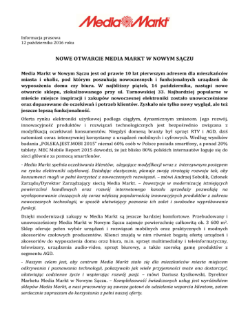 Informacja prasowa 12 października 2016 roku NOWE OTWARCIE MEDIA MARKT W NOWYM SĄCZU Media Markt w Nowym Sączu jest od prawie 10 lat pierwszym adresem dla mieszkańców miasta i okolic, pod którym poszukują nowoczesnych i funkcjonalnych urządzeń do wyposażenia domu czy biura. W najbliższy piątek, 14 października, nastąpi nowe otwarcie sklepu, zlokalizowanego przy ul. Tarnowskiej 33. Najbardziej popularne w mieście miejsce inspiracji i zakupów nowoczesnej elektroniki zostało unowocześnione oraz dopasowane do oczekiwań i potrzeb klientów. Zyskało nie tylko nowy wygląd, ale też jeszcze lepszą funkcjonalność. Oferta rynku elektroniki użytkowej podlega ciągłym, dynamicznym zmianom. Jego rozwój, innowacyjność produktów i rozwiązań technologicznych jest bezpośrednio związana z modyfikacją oczekiwań konsumentów. Niegdyś domeną branży był sprzęt RTV i AGD, dziś natomiast coraz intensywniej korzystamy z urządzeń mobilnych i cyfrowych. Według wyników badania „POLSKA.JEST.MOBI 2015” niemal 60% osób w Polsce posiada smartfony, a ponad 20% tablety. MEC Mobile Report 2015 dowodzi, że już blisko 80% polskich internautów loguje się do sieci głównie za pomocą smartfonów. - Media Markt spełnia oczekiwania klientów, ulegające modyfikacji wraz z intensywnym postępem na rynku elektroniki użytkowej. Działając elastycznie, planuje swoją strategię rozwoju tak, aby konsumenci mogli w pełni korzystać z nowoczesnych rozwiązań. – mówi Andrzej Sobolik, Członek Zarządu/Dyrektor Zarządzający siecią Media Markt. – Inwestycje w modernizację istniejących powierzchni handlowych oraz rozwój internetowego kanału sprzedaży pozwalają na wyeksponowanie cieszących się coraz większą popularnością innowacyjnych produktów z zakresu nowoczesnych technologii, w sposób ułatwiający poznanie ich zalet i swobodne wypróbowanie funkcji. Dzięki modernizacji zakupy w Media Markt są jeszcze bardziej komfortowe. Przebudowany i unowocześniony Media Markt w Nowym Sączu zajmuje powierzchnię całkowitą ok. 3 600 m2. Sklep oferuje pełen wybór urządzeń i rozwiązań mobilnych oraz praktycznych i modnych akcesoriów czołowych producentów. Klienci znajdą w nim również bogatą ofertę urządzeń i akcesoriów do wyposażenia domu oraz biura, m.in. sprzęt multimedialny i teleinformatyczny, telewizory, urządzenia audio-video, sprzęt biurowy, a także szeroką gamę produktów z segmentu AGD. - Naszym celem jest, aby centrum Media Markt stało się dla mieszkańców miasta miejscem odkrywania i poznawania technologii, pokazywało jak wiele przyjemności może ona dostarczyć, ułatwiając codzienne życie i wspierając rozwój pasji. – mówi Dariusz Łysikowski, Dyrektor Marketu Media Markt w Nowym Sączu. – Kompleksowość świadczonych usług jest wyróżnikiem sklepów Media Markt, a nasi pracownicy są zawsze gotowi do udzielenia wsparcia klientom, zatem serdecznie zapraszam do korzystania z pełni naszej oferty. Przy zakupie sprzętu można tu skorzystać z oferty ratalnej, wykupić opcję rozszerzonej ochrony produktów Gwarancja +, skorzystać z usługi pomocy informatycznej Power Service. Na miejscu można również odebrać sprzęt zamówiony w sklepie internetowym www.mediamarkt.pl. W markecie Media Markt można zostawić zużyty sprzęt elektroniczny i elektryczny, zgodny z oferowanym asortymentem, nawet jeśli nie zakupiło się nowego. Nowemu otwarciu towarzyszy ciekawa oferta najnowszych technologii ze wszystkich kategorii produktowych, np. : - Telewizor Philips LED 40” za 999,- zł; - Notebook Lenowo 100-15BID za 1499,- zł; - Chłodziarko-zamrażarka Samsung w cenie 1499,-zł; - Pralka Beko 1000 obr./min za 749,- zł; - Kuchenka mikrofalowa z grillem OK. za 169,- zł; - Odkurzacz bezworkowy Samsung za 199,- zł; - Smartfon Samsung Galacy J3 za 599,-zł; - Zewnętrzny dysk twardy Seagate EXPANSION 1TB za 199,- zł; Sieć Media Markt, będąca liderem rynku elektroniki użytkowej w Polsce, konsekwentnie realizuje strategię rozwoju wielokanałowego, zakładającą dotarcie z ofertą nowoczesnej elektroniki do jak najszerszego grona klientów. Marka posiadając obecnie 58 sklepów inwestuje w internetowy kanał sprzedaży, otwierając jednocześnie kolejne sklepy stacjonarne zarówno w dużych aglomeracjach, jak i lokalizacjach poniżej 100 000 mieszkańców. Kolejny sklep marki zostanie uruchomiony jeszcze w tym roku w Piasecznie. Informacje dodatkowe: Wioletta Batóg Rzecznik Prasowy Media Saturn Holding Polska Sp. z o. o. Tel.: 022 517 11 86 e-mail: [email protected] www.mediamarkt.pl facebook.com/MediaMarktPolska O Media Markt Sklepy Media Markt oferują najpełniejszy na rynku asortyment w zakresie elektroniki użytkowej. Można tu kupić zarówno nowinki techniczne, produkty z najwyższej półki, jak i popularny markowy sprzęt w najlepszych cenach. Nowoczesna forma prezentacji produktów ułatwia dokonanie właściwego wyboru, a o obsługę klientów dbają profesjonalnie przeszkoleni pracownicy. W celu sfinansowania zakupu można zawrzeć na miejscu umowę kredytową przy minimum formalności. Aktualnie sieć posiada 58 marketów w 48 miastach Polski.