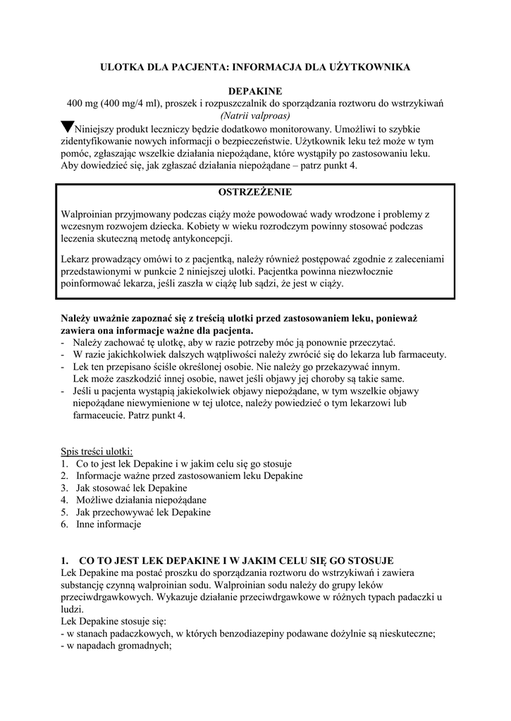 ULOTKA DLA PACJENTA: INFORMACJA DLA UŻYTKOWNIKA DEPAKINE 400 mg (400 mg/4 ml), proszek i rozpuszczalnik do sporządzania roztworu do wstrzykiwań (Natrii valproas) Niniejszy produkt leczniczy będzie dodatkowo monitorowany. Umożliwi to szybkie zidentyfikowanie nowych informacji o bezpieczeństwie. Użytkownik leku też może w tym pomóc, zgłaszając wszelkie działania niepożądane, które wystąpiły po zastosowaniu leku. Aby dowiedzieć się, jak zgłaszać działania niepożądane – patrz punkt 4. OSTRZEŻENIE Walproinian przyjmowany podczas ciąży może powodować wady wrodzone i problemy z wczesnym rozwojem dziecka. Kobiety w wieku rozrodczym powinny stosować podczas leczenia skuteczną metodę antykoncepcji. Lekarz prowadzący omówi to z pacjentką, należy również postępować zgodnie z zaleceniami przedstawionymi w punkcie 2 niniejszej ulotki. Pacjentka powinna niezwłocznie poinformować lekarza, jeśli zaszła w ciążę lub sądzi, że jest w ciąży. Należy uważnie zapoznać się z treścią ulotki przed zastosowaniem leku, ponieważ zawiera ona informacje ważne dla pacjenta. - Należy zachować tę ulotkę, aby w razie potrzeby móc ją ponownie przeczytać. - W razie jakichkolwiek dalszych wątpliwości należy zwrócić się do lekarza lub farmaceuty. - Lek ten przepisano ściśle określonej osobie. Nie należy go przekazywać innym. Lek może zaszkodzić innej osobie, nawet jeśli objawy jej choroby są takie same. - Jeśli u pacjenta wystąpią jakiekolwiek objawy niepożądane, w tym wszelkie objawy niepożądane niewymienione w tej ulotce, należy powiedzieć o tym lekarzowi lub farmaceucie. Patrz punkt 4. Spis treści ulotki: 1. Co to jest lek Depakine i w jakim celu się go stosuje 2. Informacje ważne przed zastosowaniem leku Depakine 3. Jak stosować lek Depakine 4. Możliwe działania niepożądane 5. Jak przechowywać lek Depakine 6. Inne informacje 1. CO TO JEST LEK DEPAKINE I W JAKIM CELU SIĘ GO STOSUJE Lek Depakine ma postać proszku do sporządzania roztworu do wstrzykiwań i zawiera substancję czynną walproinian sodu. Walproinian sodu należy do grupy leków przeciwdrgawkowych. Wykazuje działanie przeciwdrgawkowe w różnych typach padaczki u ludzi. Lek Depakine stosuje się: - w stanach padaczkowych, w których benzodiazepiny podawane dożylnie są nieskuteczne; - w napadach gromadnych; - w leczeniu napadów drgawkowych, kiedy doustne leczenie jest okresowo niemożliwe, ze względu na stan świadomości lub niemożność połykania, zwłaszcza jeżeli chory był uprzednio skutecznie leczony doustnie walproinianem sodu. Dotyczy to napadów uogólnionych i częściowych. - profilaktycznie w związku z zabiegami neurochirurgicznymi głowy, gdy istnieje możliwość wystąpienia napadu (-ów) padaczkowego (-ych). 2. INFORMACJE WAŻNE PRZED ZASTOSOWANIEM LEKU DEPAKINE Kiedy nie stosować leku Depakine: Nie należy stosować leku p przypadku: - nadwrażliwości na walproinian sodu lub którykolwiek składnik leku, - ostrego i przewlekłego zapalenia wątroby, - pacjentów z przebytym ciężkim zapaleniem wątroby, zwłaszcza polekowym lub pacjentów z wywiadem rodzinnym świadczącym o ciężkim zapaleniu wątroby, - porfirii, - jednoczesnego stosowania z meflochiną. Kiedy zachować szczególną ostrożność stosując lek Depakine - Przed rozpoczęciem leczenia i okresowo podczas pierwszych 6 miesięcy leczenia należy okresowo wykonywać laboratoryjne testy czynności wątroby. - W razie nagłego wystąpienia następujących objawów: osłabienie, brak apetytu, senność, nawracające wymioty i bóle brzucha, żółtaczka (zażółcenie powłok skórnych i białkówek oczu) lub nawrotu napadów padaczkowych, zwłaszcza podczas pierwszych 6 miesięcy leczenia, należy niezwłocznie poinformować o tym lekarza prowadzącego. W rzadkich przypadkach Depakine może powodować ciężkie uszkodzenia wątroby kończące się niekiedy zgonem. - Należy zachować ostrożność podczas stosowania leku Depakine u dzieci poniżej 3 lat leczonych jednocześnie innym lekiem przeciwpadaczkowym, a szczególnie z padaczką o ciężkim przebiegu, uszkodzeniem mózgu, z opóźnionym rozwojem psychomotorycznym i (lub) wrodzonymi chorobami metabolicznymi lub genetyczną chorobą zwyrodnieniową, ze względu na ryzyko wystąpienia ciężkiego uszkodzenia wątroby. - Dzieciom poniżej 3 lat walproinianu sodu nie należy podawać jednocześnie z salicylanami z powodu ryzyka toksycznego działania na wątrobę. - W razie wystąpienia ostrych bólów brzucha należy niezwłocznie poinformować o tym lekarza prowadzącego. Bardzo rzadko Depakine może powodować ciężkie zapalenie trzustki, czasami kończące się zgonem. - Walproinian nie powinien być stosowany u kobiet z padaczką planujących ciążę, poza przypadkami w których inne leczenie jest nieskuteczne lub nie jest tolerowane. Należy rozważyć korzyści z zastosowania leku w stosunku do ryzyka przed pierwszym przepisaniem leku lub kiedy kobieta leczona walproinianem planuje ciążę. Kobiety w wieku rozrodczym muszą stosować skuteczną antykoncepcję w trakcie leczenia. - Niewielka liczba osób stosujących leki przeciwpadaczkowe zawierające walproinian sodu myślała o tym, aby się skrzywdzić lub zabić. Jeśli kiedykolwiek u pacjenta pojawią się takie myśli, należy natychmiast skontaktować się z lekarzem. 2 - Przed rozpoczęciem leczenia, również przed zabiegiem operacyjnym i w przypadku siniaków lub samoistnych krwawień zaleca się wykonanie badań laboratoryjnych (badanie morfologii krwi z rozmazem, w tym ocena liczby płytek krwi, czasu krwawienia i testów krzepnięcia). - Ostrożnie stosować u pacjentów z zaburzeniem czynności nerek. Lekarz może zalecić mniejszą dawkę leku. - Lek należy stosować ostrożnie u pacjentów z układowym toczniem rumieniowatym. - Depakine należy stosować ostrożnie u pacjentów z zaburzeniami metabolicznymi, zwłaszcza z wrodzonymi niedoboram