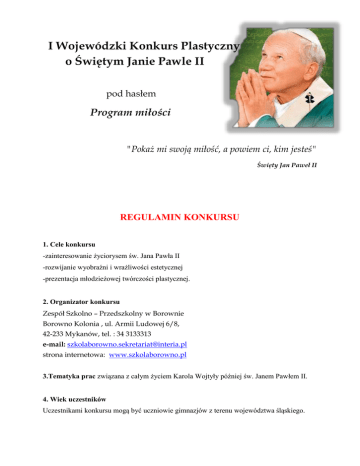 I Wojewódzki Konkurs Plastyczny o Świętym Janie Pawle II pod hasłem Program miłości "Pokaż mi swoją miłość, a powiem ci, kim jesteś" Święty Jan Paweł II REGULAMIN KONKURSU 1. Cele konkursu -zainteresowanie życiorysem św. Jana Pawła II -rozwijanie wyobraźni i wrażliwości estetycznej -prezentacja młodzieżowej twórczości plastycznej. 2. Organizator konkursu Zespół Szkolno – Przedszkolny w Borownie Borowno Kolonia , ul. Armii Ludowej 6/8, 42-233 Mykanów, tel. : 34 3133313 e-mail: [email protected] strona internetowa: www.szkolaborowno.pl 3.Tematyka prac związana z całym życiem Karola Wojtyły później św. Janem Pawłem II. 4. Wiek uczestników Uczestnikami konkursu mogą być uczniowie gimnazjów z terenu województwa śląskiego. 5. Technika- dowolna, format- A3 / 297 mm x420 mm /. Prac prosimy nie oprawiać w passe-partout 6. Każda praca powinna posiadać na odwrotnej stronie czytelną informację według wzoru: a) imię i nazwisko uczestnika b) imię i nazwisko nauczyciela c) adres i telefon placówki Prace zbiorowe nie będą uwzględniane 7. Prace płasko zapakowane / nie zrolowane / prosimy przesłać na adres : Zespół Szkolno- Przedszkolny w Borownie, Borowno Kolonia, ul, Armii Ludowej 6/8 42-233 Mykanów www.szkolaborowno.pl 8. Termin składania prac upływa 15 kwietnia 2015 r. Prace nadesłane na konkurs przechodzą na własność organizatorów i nie będą zwracane. 9. O wynikach konkursu zostaną powiadomione telefonicznie tylko te placówki, z których będą nagrodzeni laureaci konkursu. Uroczyste otwarcie wystawy połączone z wręczeniem nagród nastąpi w maju 2015 r. Dodatkowe informacje o konkursie można uzyskać w Zespole Szkolno- Przedszkolnym w Borownie - telefon 34. 313 33 13. Udział w konkursie jest równoznaczny z akceptacją Regulaminu oraz wyrażeniem zgody na przetwarzanie danych osobowych uczestnika przez Organizatorów dla celów organizacyjnych i promocyjnych Konkursu zgodnie z ustawą z dnia 29.08.1997r. o ochronie danych osobowych./Dz.U.Nr.101 z 2002r.,poz.926 z póź. zm./