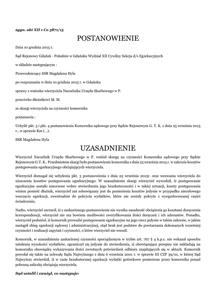sygn. akt XII 1 Co 3871/15 POSTANOWIENIE Dnia 10 grudnia 2015 r. Sąd Rejonowy Gdańsk - Południe w Gdańsku Wydział XII Cywilny Sekcja d/s Egzekucyjnych w składzie następującym : Przewodniczący SSR Magdalena Hyla po rozpoznaniu w dniu 10 grudnia 2015 r. w Gdańsku sprawy z wniosku wierzyciela Naczelnika Urzędu Skarbowego w P. przeciwko dłużnikowi M. M. ze skargi wierzyciela na czynności komornika postanawia : Uchylić pkt. 3 i pkt. 4 postanowienia Komornika sądowego przy Sądzie Rejonowym G. T. K. z dnia 25 września 2015 r., w sprawie Km (...). SSR Magdalena Hyla UZASADNIENIE Wierzyciel Naczelnik Urzędu Skarbowego w P. wniósł skargę na czynności Komornika sądowego przy Sądzie Rejonowym G.T. K.. Przedmiotem skargi było postanowienie komornika z dnia 25 września 2015 r. w zakresie kosztów postępowania egzekucyjnego obciążających wierzyciela. Wierzyciel domagał się uchylenia pkt. 3 postanowienia z dnia 25 września 2015r. oraz wezwania wierzyciela do uiszczenia kosztów postępowania egzekucyjnego. W uzasadnieniu skargi wierzyciel wywodził, iż postępowanie egzekucyjne zostało umorzone wobec stwierdzenia jego bezskuteczności i w takiej sytuacji, koszty postępowania winien ponieść dłużnik, wierzyciel zaś zobowiązany jest do poniesienia kosztów jedynie w przypadku niecelowego wszczęcia egzekucji, ewentualnie do pokrycia wydatków, które nie zostały pokryte z wyegzekwowanej części świadczenia. Nadto, wierzyciel zarzucił, iż z zaskarżonego postanowienia nie wynika zasadność obciążenia go kosztami doręczenia korespondencji, wierzyciel nie ma bowiem możliwości zweryfikowania ilości doręczeń i ich adresatów. Ponadto, wierzyciel podniósł, iż komornik prowadzi postępowanie egzekucyjne na jego rzecz jedynie w takim zakresie, w jakim nastąpił zbieg egzekucji sądowej i administracyjnej, stąd brak jest podstaw do powtarzania dokonanych wcześniej czynności i realizacji zapytań i czynności, o które wierzyciel nie wnosił. Komornik, w uzasadnieniu zaskarżonej czynności sporządzonym w trybie art. 767 § 4 k.p.c. nie wskazał sposobu ustalenia wysokości wydatków, ograniczył się jedynie do stwierdzenia, iż obowiązujące przepisy nie nakładają na komornika obowiązku wykazywania ilości zwrotnych potwierdzeń odbioru znajdujących się w aktach. Komornik powołał się także na uchwałę Sądu Najwyższego z dnia 6 września 2001 r. w sprawie III CZP 39/01, w której Sąd Najwyższy stwierdził, iż w razie bezskutecznej egzekucji wydatki gotówkowe poniesione przez komornika ponad pobraną zaliczkę obciążają wierzyciela. Sąd ustalił i zważył, co następuje: Komornik sądowy przy Sądzie Rejonowym G. T. K. prowadził, pod sygnaturą akt Km (...) postępowanie z wniosku wierzyciela Naczelnika Urzędu Skarbowego w P. przeciwko dłużnikowi M. M.. Postępowanie zostało wszczęte wskutek rozstrzygnięcia zbiegu egzekucji sądowej i administracyjnej. W aktach sprawy brak odpisu orzeczenia rozstrzygającego zbieg. Na skutek rozstrzygnięcia zbiegu – egzekucję prowadził początkowo Komornik przy Sądzie Rejonowym d. W. M. K., który, następnie, postanowieniem z dnia 17 stycznia 2014 r. przekazał sprawę Komornikowi przy Sądzie Rejonowym G., także, na skutek rozstrzygnięcia zbiegu egzekucji. Komornik przy Sądzie Rejonowym G. H. K. (obecnie, po zmianie osoby komornika komornik T. K.), po przejęciu sprawy do prowadzenia, powiadomił strony postępowania oraz Zakład Ubezpieczeń Społecznych, jako trzeciodłużnika, o przejęciu egzekucji. Nadto, komornik udzielił pisemnej odpowiedzi na pytanie wierzyciela co do podejmowanych w sprawie czynności (pisma komornika z dnia 16 września 2014 r. , 20 listopada 2014 r. i 3 grudnia 2014 r.). Pismem z dnia 24 czerwca 2015 r. komornik wysłuchał strony postępowania w trybie art. 827 k.p.c. ( w aktach Km (...) brak dowodu doręczenia wysłuchania dłużniczki), a następnie, postanowieniem z dnia 25 września 2015 r. orzekł o umorzeniu postępowania wobec stwierdzenia jego bezskuteczności (pkt. 1 zaskarżonego postanowienia). W pkt. 3 postanowienia komornik ustalił koszty postępowania na kwotę 54,96 zł, obciążył tymi kosztami dłużnika, oraz orzekł o obowiązku ich zwrotu na rzecz wierzyciela. W pkt. 4 komornik wezwał wierzyciela do uiszczenia na rzecz komornika kwoty 46,93 zł. W uzasadnieniu postanowienia wskazano, iż kwota 54,96 zł to koszty doręczania korespondencji, zaspokojone przez dłużniczkę do kwoty 8,03 zł. Na pokrycie wydatków komornik nie żądał od wierzyciela wpłacenia zaliczki. Zdaniem Sądu, skarga wierzyciela jest uzasadniona. Przede wszystkim zasadny jest zarzut skargi, dotyczący wysokości ustalonych kosztów (wydatków). Jak słusznie podniósł wierzyciel, nie da się ustalić, w oparciu o zaskarżone postanowienie, ani sposobu ustalenia wydatków przez komornika, ani ich celowości. Wprawdzie, obowiązujące przepisy, nie nakładają na komornika obowiązku szczegółowego wymienienia w orzeczeniu ilości wysłanej korespondencji, ani też podania zastosowanej stawki za każde z doręczeń, jednakże w sytuacji, gdy rozstrzygnięcie w tym zakresie zostaje objęte skargą i oczywistym jest, że rodzi wątpliwości strony kosztami obciążonej, zasadnym jest jednak sporządzenie przez komornika szczegółowego zestawienia pozwalającego zarówno stronie, jak i sądowi, na zweryfikowanie prawidłowości tych wyliczeń. Tymczasem, komornik, w uzasadnieniu zaskarżonego postanowienia sporządzonym w trybie art. 767 § 4 k.p.c., nie wskazał ilości dokonanych doręczeń, ani adresatów wysłanych przesyłek, ani nie wskazał operatora pocztowego, który doręczenia realizował, uniemożliwiając tym samym zweryfikowanie przyjętych stawek za wykonanie tych doręczeń. Z tych zatem względów, zaskarżone orzeczenie jest wadliwe. Wątpliwości budzi także zastosowana przez komornika zasada obciążenia tymi samymi kosztami jednocześ