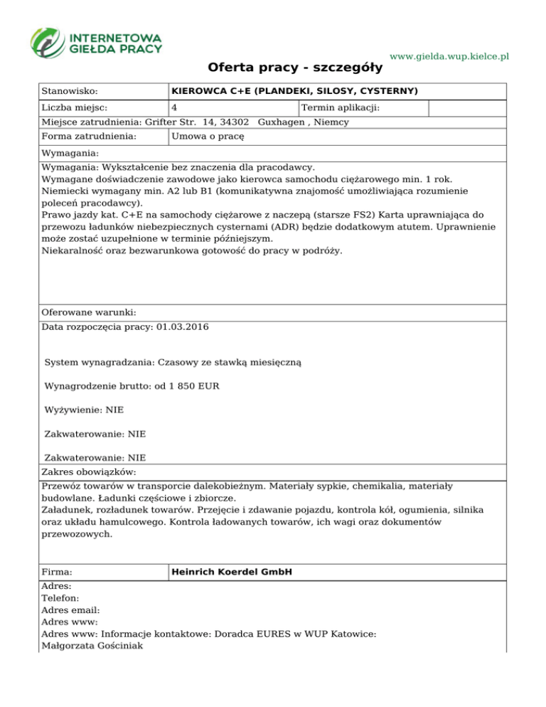 Oferta pracy - szczegóły www.gielda.wup.kielce.pl Stanowisko: KIEROWCA C+E (PLANDEKI, SILOSY, CYSTERNY) Liczba miejsc: 4 Termin aplikacji: Miejsce zatrudnienia: Grifter Str. 14, 34302 Guxhagen , Niemcy Forma zatrudnienia: Umowa o pracę Wymagania: Wymagania: Wykształcenie bez znaczenia dla pracodawcy. Wymagane doświadczenie zawodowe jako kierowca samochodu ciężarowego min. 1 rok. Niemiecki wymagany min. A2 lub B1 (komunikatywna znajomość umożliwiająca rozumienie poleceń pracodawcy). Prawo jazdy kat. C+E na samochody ciężarowe z naczepą (starsze FS2) Karta uprawniająca do przewozu ładunków niebezpiecznych cysternami (ADR) będzie dodatkowym atutem. Uprawnienie może zostać uzupełnione w terminie późniejszym. Niekaralność oraz bezwarunkowa gotowość do pracy w podróży. Oferowane warunki: Data rozpoczęcia pracy: 01.03.2016 System wynagradzania: Czasowy ze stawką miesięczną Wynagrodzenie brutto: od 1 850 EUR Wyżywienie: NIE Zakwaterowanie: NIE Zakwaterowanie: NIE Zakres obowiązków: Przewóz towarów w transporcie dalekobieżnym. Materiały sypkie, chemikalia, materiały budowlane. Ładunki częściowe i zbiorcze. Załadunek, rozładunek towarów. Przejęcie i zdawanie pojazdu, kontrola kół, ogumienia, silnika oraz układu hamulcowego. Kontrola ładowanych towarów, ich wagi oraz dokumentów przewozowych. Firma: Heinrich Koerdel GmbH Adres: Telefon: Adres email: Adres www: Adres www: Informacje kontaktowe: Doradca EURES w WUP Katowice: Małgorzata Gościniak [email protected] Język aplikacji: angielski, niemiecki Sposób aplikowania: do doradcy EURES z WUP Sposób przekazania dokumentów: Pocztą elektroniczną na adres e-mail do doradcy EURES w Wojewódzkim Urzędzie Pracy w Katowicach Wymagane dokumenty: CV wraz z koniecznymi uprawnieniami (prawo jazdy kat. C, E, zaświadczenie ADR, itp.) Uwagi: Identyfikator oferty: 10000-1137055236-S Instytucja koordynująca ofertę: Wojewódzki Urząd Pracy w Katowicach Urząd Pracy dokłada wszelkich starań, aby oferty pracy będące w zasobach urzędu, były rzetelne i wiarygodne. Ponieważ wszystkie oferty pracy pochodzą od osób trzecich Urząd Pracy zastrzega, że odpowiedzialność za ewentualne rozbieżności pomiędzy warunkami pracy zaprezentowanymi w niniejszej ofercie a warunkami zaproponowanymi przez potencjalnego pracodawcę ponosi pracodawca.