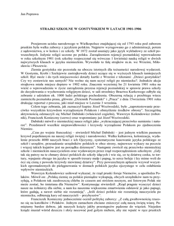 Jan Poprawa STRAJKI SZKOLNE W GOSTYŃSKIEM W LATACH 1901-1906 Przejawem ucisku narodowego w Wielkopolsce znajdującej się od 1793 roku pod zaborem pruskim była walka zaborcy z językiem polskim. Najpierw wyrugowano go z administracji, potem z sądownictwa, a w końcu i ze szkoły. W 1872 został usunięty jako język wykładowy ze szkół powszechnych. Jedynie religii uczono po polsku. Zarządzeniem rejencji poznańskiej wprowadzono w roku szkolnym 1901 (rok szkolny rozpoczynał się wówczas 1 kwietnia) naukę religii w dwóch najwyższych klasach w języku niemieckim. Wywołało to falę strajków m.in. we Wrześni, Miłosławiu i Pleszewie. Ziemia gostyńska nie pozostała na uboczu istotnych dla tożsamości narodowej wydarzeń. W Gostyniu, Krobi i Szelejewie zastrajkowały dzieci uczące się w wyższych klasach tamtejszych szkół. Być może i do tych miejscowości dotarły kartki z Wrześni z tekstami: „Dzieci gostyńskie! Czy wy zostawicie nas samych? Nie wolno się nam uczyć religii po niemiecku?. Jednakże akcja strajkowa miała miejsce dopiero w 1902 roku. Znacznie wcześniej bo 21 kwietnia 1901 roku na wieść o wprowadzeniu w życie zarządzenia prezesa rejencji poznańskiej w sprawie prawa szkoły do decydowania o wychowaniu religijnym dzieci, w sali strzelnicy Bractwa Kurkowego odbyło się zebranie z udziałem ok. 1000 ludzi polskiego pochodzenia. Obszerną relację z przebiegu wiecu zamieściła poznańska prasa, głównie „Dziennik Poznański” i „Praca” z dnia 15września 1901 roku drukując reportaż z procesu, jaki miał miejsce w Lesznie 3 września. Celem tego zebrania, jak zaznaczył kupiec Józef Woziwodzki, było „zaprotestowanie przeciwko wszystkim krzywdom wyrządzonym Polakom i obmyślenie środków obrony”. Szczególną aktywnością odznaczyli się Michał Dabiński (właściciel cegielni), Wawrzyn Kolendowicz (robotnik), Franciszek Konieczny (szewc) oraz wspomniany już Józef Woziwodzki. Dabiński mówił o niemieckiej nauce religii jako „wykraczającej przeciwko sumieniu i naturze”. Przedstawił wszelkie nieprawidłowości i krzywdy wyrządzone Polakom po zjednoczeniu Niemiec. „Czas po wojnie francuskiej – stwierdził Michał Dabiński – jest jednym wielkim pasmem krzywd popełnianym na naszej religii świętej i narodowości. Walka kulturowa, kolonizacja, wydalenie przeszło 4000 naszych braci z ich Ojczyzny, systematyczne kasowanie języka polskiego ze szkół i urzędów, przesadzanie urzędników polskich w obce strony, najnowsze wykazy na poczcie i więcej takich kujatów jest na porządku dziennym”. Następnie zwrócił się przeciwko niemieckiej szkole i niemieckim nauczycielom oraz wydawanym przez rząd rozporządzeniom szkolnym: „Gdy tak się patrzy na te chmary dzieci polskich do szkoły idących i wie się, co tę dziatwę czeka, te tortury, wpajanie obcego im języka w sposób tresury małp i papug, to serce boleje i łzy mimo woli do ócz się cisną z powodu krzywdy niewinnej dziatwy”. Przy powszechnym aplauzie wzywał wszystkich zgromadzonych do pielęgnowania w domach polskich języka ojczystego w celu osłabienia wpływów niemieckich. Wawrzyn Kolendowicz usiłował wykazać, że rząd pruski foruje Niemców, a upośledza Polaków. Mówił on: „Polską ziemię za polskie pieniądze wykupują, obcych urzędników nam tu przysyłają, a Polakom tak zazdroszczą chleba że czasem ani stróżem nocnym, ani listowym Polak nie może zostać, bo śmietana dla Niemców”. Kontynuując stwierdził: „Rząd pragnie wyuczyć dzieci nasze na żołnierzy dla siebie, a nam ku naszemu większemu zmartwieniu odstawić je jako papugi, które gadają, a nawet siebie nie rozumieją”. „Jeśli dzieci polskie nie rozumieją nauczyciela po niemiecku, odbierają kary od nauczycieli – przybyszów”. Franciszek Konieczny jednocześnie ocenił politykę zaborcy: „Z całą gwałtownością rzucono się na katolików i Polaków. Jednym zamachem chciano zniszczyć całą naszą świętą wiarę. Pamiętamy bardzo dobrze, jak naszych księży jakby przestępców pędzono do więzień. Niejeden ksiądz musiał wśród deszczu i słoty nocować pod gołym niebem, aby nie wpaść w ręce pruskich żandarmów”. O rozporządzeniach i zamiarach rządu Konieczny powiedział: „Krew ścina się w żyłach, pięści zaciskają mimo woli, patrząc na niesprawiedliwość nam wyrządzaną. Język nasz wyrzucono z urzędów, z sądów, a wreszcie ze szkół”. Wypowiedź Franciszka Koniecznego przerwał gwałtownie komisarz policyjny Augustini z Poznania, który uznał, że wiec ten ma na celu podburzanie ludności polskiej do wystąpień antyniemieckich. Swój udział w tym zgromadzeniu miał wg oskarżyciela, proboszcz gostyński ks. Emil Jackowski, który mówcom podał główne tezy wystąpień oraz dał do rozdania uczniowi szewskiemu Buszewiczowi broszury wzywające do walki o prawo do wychowania dzieci w duchu narodowym i katolickim. Sąd Okręgowy w Lesznie uniewinnił oskarżonych, nie znajdując w przemówieniach nic podburzającego ani wykraczającego przeciwko rządowi. Stwierdził natomiast, że sam wiec miał charakter uspokajający i wyjaśniający zaistniałą sytuację. Wyrok taki oskarżeni uzyskali głównie dzięki postawie zeznających świadków oraz płomiennej mowie mecenasa Adama Wolińskiego, adwokata z Poznania. W 1902 roku uczennice szkoły dla dziewcząt oraz uczniowie wyższych klas 6-klasowej szkoły elementarnej (obecnie Szkoła Podstawowa Nr 1 w Gostyniu) podjęli akcję strajkową. Polegała ona na zwróceniu otrzymanych od władz kuratoryjnych bezpłatnych podręczników niemieckich do nauki religii. Protestem kierowali Józef Woziwodzki i Franciszek Konieczny. Pewnego dnia po rozpoczęciu lekcji religii na katedrze nauczyciela Adolfa Schilli pojawiły się trzy stosy podręczników. Zarówno nauczyciel, jak i powiadomione przez niego władze szkolne, rozpoczęły szykany wobec strajkujących uczn