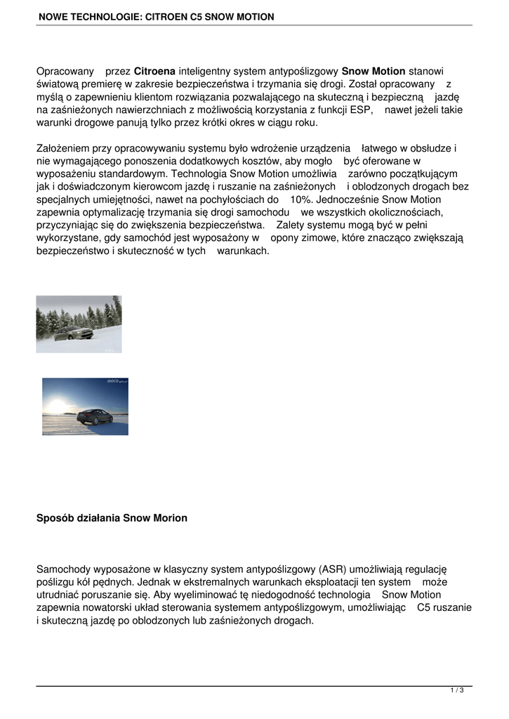 NOWE TECHNOLOGIE: CITROEN C5 SNOW MOTION Opracowany przez Citroena inteligentny system antypoślizgowy Snow Motion stanowi światową premierę w zakresie bezpieczeństwa i trzymania się drogi. Został opracowany z myślą o zapewnieniu klientom rozwiązania pozwalającego na skuteczną i bezpieczną jazdę na zaśnieżonych nawierzchniach z możliwością korzystania z funkcji ESP, nawet jeżeli takie warunki drogowe panują tylko przez krótki okres w ciągu roku. Założeniem przy opracowywaniu systemu było wdrożenie urządzenia łatwego w obsłudze i nie wymagającego ponoszenia dodatkowych kosztów, aby mogło być oferowane w wyposażeniu standardowym. Technologia Snow Motion umożliwia zarówno początkującym jak i doświadczonym kierowcom jazdę i ruszanie na zaśnieżonych i oblodzonych drogach bez specjalnych umiejętności, nawet na pochyłościach do 10%. Jednocześnie Snow Motion zapewnia optymalizację trzymania się drogi samochodu we wszystkich okolicznościach, przyczyniając się do zwiększenia bezpieczeństwa. Zalety systemu mogą być w pełni wykorzystane, gdy samochód jest wyposażony w opony zimowe, które znacząco zwiększają bezpieczeństwo i skuteczność w tych warunkach. Sposób działania Snow Morion Samochody wyposażone w klasyczny system antypoślizgowy (ASR) umożliwiają regulację poślizgu kół pędnych. Jednak w ekstremalnych warunkach eksploatacji ten system może utrudniać poruszanie się. Aby wyeliminować tę niedogodność technologia Snow Motion zapewnia nowatorski układ sterowania systemem antypoślizgowym, umożliwiając C5 ruszanie i skuteczną jazdę po oblodzonych lub zaśnieżonych drogach. 1/3 NOWE TECHNOLOGIE: CITROEN C5 SNOW MOTION Działanie Snow Motion przebiega w trzech fazach: Faza I: rozpoznanie stylu jazdy kierowcy (przyspieszenie, kąt kół) i analiza warunków zewnętrznych (kąt nachylenia drogi, przyczepność), Faza II: wprowadzenie parametrów jazdy wybranych przez kierowcę, porównanie z rzeczywistymi warunkami nawierzchni i komputerowe obliczenie wartości zadanych, które są przekazywane do systemu kontrolnego silnika i układu hamulcowego, Faza III: kontrola i ocena odchylenia między wartościami zadanymi i reakcją samochodu w celu dokonania korekty umożliwiającej optymalne dostosowanie parametrów jazdy wybranych przez kierowcę do rzeczywistych uwarunkowań . Ruch samochodu dzieli się na dwa odrębne etapy: ruszanie i jazdę. Ruszanie: etap ruszania jest aktywny do osiągnięcia prędkości około 4 km/h i charakteryzuje się zróżnicowanym, naprzemiennym sterowaniem dwóch kół jezdnych. Ten etap jest aktywowany jeżeli jest to niezbędne, w zależności od warunków, możliwej do osiągnięcia przyczepności i przyspieszenia samochodu. Jazda: ten etap jest aktywowany: a) po etapie ruszania, gdy pojazd osiąga prędkość powyżej progu określonego w zależności od nachylenia drogi, parametrów wybranych przez kierowcę i możliwej do osiągnięcia przyczepności. b) bezpośrednio, gdy etap ruszania nie został uruchomiony. System dąży do znalezienia optymalnego punktu działania kół w zależności od jazdy wybranych przez kierowcę i istniejących warunków przyczepności. parametrów Inne zalety Snow Morion Zarówno na mokrej jak i na suchej nawierzchni Snow Motion umożliwia specjalny rozkład momentu na łuku między dwoma kołami pędnymi. To rozwiązanie pozwala na optymalne wykorzystanie przyczepności, aby 2/3 NOWE TECHNOLOGIE: CITROEN C5 SNOW MOTION osiągnąć jak najlepszą sterowność. W przypadku dużych sił odśrodkowych i gdy samochód nie jest podsterowny, wartość zadanej, regulacyjnej prędkości przekazywanej do systemu kontrolnego silnika odpowiada prędkości wzorcowej koła zewnętrznego. Nie występuje gwałtowne "szarpnięcie" silnikiem jak to ma miejsce w przypadku tradycyjnego układu ASR. Jeżeli samochód jest podsterowny, przy obliczaniu prędkości wzorcowej system uwzględnia stopniowo prędkość koła zewnętrznego, kontrolując podsterowność poprzez odpowiednie oddziaływanie na system kontrolny silnika. Materiały źródłowe: Citroen Polska (25.02.2009) 3/3