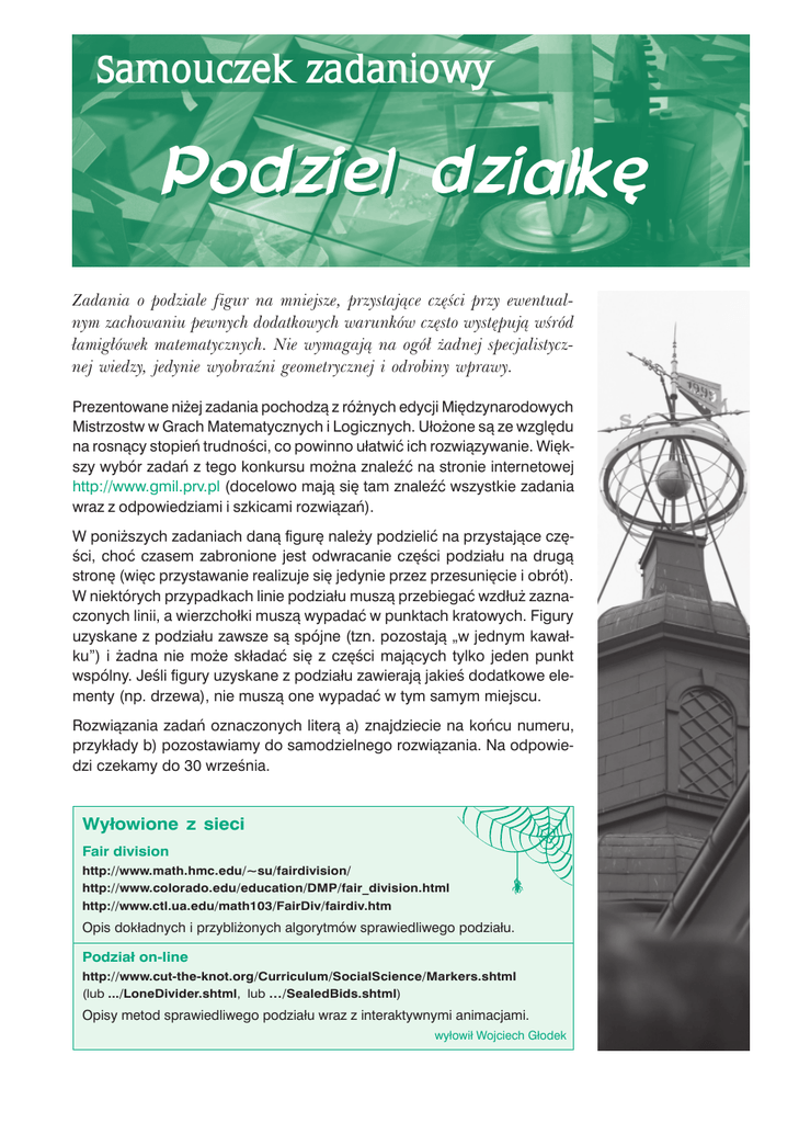 Samouczek zadaniowy Samouczek zadaniowy Podziel dzia³kê Zadania o podziale figur na mniejsze, przystaj¹ce czêœci przy ewentualnym zachowaniu pewnych dodatkowych warunków czêsto wystêpuj¹ wœród ³amig³ówek matematycznych. Nie wymagaj¹ na ogó³ ¿adnej specjalistycznej wiedzy, jedynie wyobraŸni geometrycznej i odrobiny wprawy. Prezentowane ni¿ej zadania pochodz¹ z ró¿nych edycji Miêdzynarodowych Mistrzostw w Grach Matematycznych i Logicznych. U³o¿one s¹ ze wzglêdu na rosn¹cy stopieñ trudnoœci, co powinno u³atwiæ ich rozwi¹zywanie. Wiêkszy wybór zadañ z tego konkursu mo¿na znaleŸæ na stronie internetowej http://www.gmil.prv.pl (docelowo maj¹ siê tam znaleŸæ wszystkie zadania wraz z odpowiedziami i szkicami rozwi¹zañ). W poni¿szych zadaniach dan¹ figurê nale¿y podzieliæ na przystaj¹ce czêœci, choæ czasem zabronione jest odwracanie czêœci podzia³u na drug¹ stronê (wiêc przystawanie realizuje siê jedynie przez przesuniêcie i obrót). W niektórych przypadkach linie podzia³u musz¹ przebiegaæ wzd³u¿ zaznaczonych linii, a wierzcho³ki musz¹ wypadaæ w punktach kratowych. Figury uzyskane z podzia³u zawsze s¹ spójne (tzn. pozostaj¹ „w jednym kawa³ku”) i ¿adna nie mo¿e sk³adaæ siê z czêœci maj¹cych tylko jeden punkt wspólny. Jeœli figury uzyskane z podzia³u zawieraj¹ jakieœ dodatkowe elementy (np. drzewa), nie musz¹ one wypadaæ w tym samym miejscu. Rozwi¹zania zadañ oznaczonych liter¹ a) znajdziecie na koñcu numeru, przyk³ady b) pozostawiamy do samodzielnego rozwi¹zania. Na odpowiedzi czekamy do 30 wrzeœnia. Wy³owione z sieci Fair division http://www.math.hmc.edu/~su/fairdivision/ http://www.colorado.edu/education/DMP/fair_division.html http://www.ctl.ua.edu/math103/FairDiv/fairdiv.htm Opis dok³adnych i przybli¿onych algorytmów sprawiedliwego podzia³u. Podzia³ on-line http://www.cut-the-knot.org/Curriculum/SocialScience/Markers.shtml (lub .../LoneDivider.shtml, lub …/SealedBids.shtml) Opisy metod sprawiedliwego podzia³u wraz z interaktywnymi animacjami. wy³owi³ Wojciech G³odek 17 18 Samouczek zadaniowy 1a. Fina³ miêdzynarodowy 1998 1b. Fina³ krajowy 2001 Ojciec Izydor – w³aœciciel parceli z rysunku – zamierza j¹ podzieliæ pomiêdzy trzech synów w taki sposób, aby wszystkie czêœci by³y przystaj¹cymi wielok¹tami z³o¿onymi z ca³ych kratek. Zaznacz ten podzia³. Ojciec Izydor podzieli³ teren z rysunku na piêæ dzia³ek maj¹cych kszta³t przystaj¹cych wielok¹tów z³o¿onych z ca³ych kratek. Zaznacz ten podzia³. 2a. 2b. Fina³ miêdzynarodowy 1999 Fina³ miêdzynarodowy 1996 Stary Szulej, zwany Figowcem, posiada³ dzia³kê obsadzon¹ drzewami figowymi (na rysunku drzewa zaznaczono kropkami). Po jego œmierci trzeba by³o podzieliæ ten teren miêdzy szeœcioro dzieci. Zadanie nie by³o ³atwe, bo ka¿de za¿¹da³o parceli tego samego kszta³tu co pozosta³e oraz posiadaj¹cej drzewo figowe. Pomó¿ notariuszowi dokonaæ podzia³u. Posiad³oœæ magnata Gorliwca ma kszta³t kwadratu podzielonego na 25 jednakowych sektorów. Roœnie tam piêæ wspania³ych cedrów libañskich, na planie zaznaczonych kropkami. Magnat ma cztery córki i pragnie podzieliæ miêdzy nie swoj¹ posiad³oœæ, zostawiaj¹c jedn¹ parcelê sobie. Wszystkie dzia³ki maj¹ mieæ jednakow¹ powierzchniê oraz: ka¿da dzia³ka ma sk³adaæ siê z ca³ych kratek i zawieraæ cedr, dzia³ki córek maj¹ byæ przystaj¹ce, dzia³ka Gorliwca ma mieæ inny kszta³t ni¿ dzia³ki córek, dzia³ki córek maj¹ przylegaæ przynajmniej jednym bokiem kratki do czêœci ojca oraz do dzia³ek dwóch sióstr. Jak dokonaæ podzia³u spe³niaj¹cego powy¿sze warunki? 3a. 3b. Lista treningowa – Bobowicko 1997 Kwadratow¹ dzia³kê podziel na cztery czêœci jednakowego kszta³tu i wielkoœci tak aby: ka¿da czêœæ z³o¿ona by³a z ca³ych kratek, ka¿da czêœæ zawiera³a kratkê z klonem (kropka bia³a) i dêbem (kropka czarna). Pó³fina³ krajowy 2002 Na dzia³ce starego Tomasza roœnie 5 jab³oni i 5 grusz. Podzieli³ on ten teren miêdzy swoich piêciu synów. Ka¿dy z nich otrzyma³ parcelê w kszta³cie przystaj¹cego wielok¹ta z jedn¹ grusz¹ i jedn¹ jab³oni¹. Zaznacz podzia³ na rysunku. Samouczek zadaniowy 4a. Fina³ krajowy 2004 4b. 19 Pó³fina³ krajowy 2001 Figurê z rysunku podziel na trzy przystaj¹ce wielok¹ty daj¹ce siê na³o¿yæ jedynie przez przesuwanie i obracanie. Magda zaprosi³a na imieniny dwie przyjació³ki, które przynios³y w prezencie nietypowy placek z polew¹ miodow¹. Jak podzieliæ go na trzy czêœci tego samego kszta³tu i takiej samej powierzchni? Ze wzglêdu na polewê czêœci te nie mog¹ byæ odwracane. 5a. 5b. Etap korespondencyjny 1999 Fina³ miêdzynarodowy 1998 Figurê z rysunku podziel na szeœæ przystaj¹cych czêœci. Walenty otrzyma³ na urodziny du¿y piernik. Na przyjêcie zaprosi³ piêciu przyjació³ i po namyœle uda³o mu siê podzieliæ piernik na szeœæ porcji o jednakowej powierzchni i kszta³cie. Jak to zrobi³? 6a. 6b. Fina³ krajowy 1997 Fina³ krajowy 1995 Plac pokazany na rysunku podziel na cztery przystaj¹ce parcele. Podziel figurê z rysunku na cztery przystaj¹ce czêœci. 7a. Dzia³ka ma kszta³t wzorowany na symbolach Yin-Yang. Podziel j¹ na dwie przystaj¹ce czêœci. 7b. Podziel dzia³kê na trzy przystaj¹ce czêœci. Wybór i opracowanie: Piotr Kryszkiewicz, Milicz