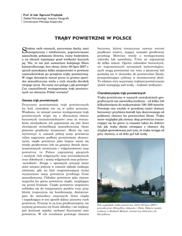 Prof. dr hab. Rajmund Przybylak Zakład Klimatologii, Instytut Geografii Uniwersytet Miko∏aja Kopernika TRÑBY POWIETRZNE W POLSCE iedem osób rannych, pozrywane dachy, sieci energetyczne i telefoniczne, poprzewracane samochody, połamane drzewa, ruiny budynków, a na ulicach topniejàcy grad wielkoÊci kurzych jaj. Nie, to nie jest scenariusz kolejnego filmu katastroficznego, lecz obraz, który 20 lipca 2007 r. ujrzeli mieszkaƒcy kilku miejscowoÊci w powiecie cz´stochowskim po przejÊciu tràby powietrznej. W ciàgu dziesi´ciu minut przez to groêne zjawisko atmosferyczne wielu z nich straciło dorobek swojego ˝ycia. Na czym ono polega i jak powstaje? Czy cz´stotliwoÊç wyst´powania tràb powietrznych na obszarze Polski wzrasta? Geneza tràb powietrznych Przyczyny powstawania tràb powietrznych na kuli ziemskiej nie sà w pełni poznane. Wiadomo, ˝e niemal zawsze wyst´powanie tràb powietrznych wià˝e si´ z obecnoÊcià chmur burzowych (cumulonimbusów) oraz ˝e warunkiem niezb´dnym ich pojawienia si´ jest du˝a chwiejnoÊç stratyfikacji atmosferycznej (du˝e pionowe gradienty termiczne). Mo˝e si´ ona wytworzyç w ramach jednej masy powietrza (silne nagrzanie podło˝a promieniami słonecznymi, ciepłe powietrze jako l˝ejsze unosi si´ wtedy gwałtownie) lub na granicy dwóch skontrastowanych termicznie i wilgotnoÊciowo mas powietrza (w Polsce najcz´Êciej goràcych i suchych (lub wilgotnych) mas zwrotnikowych oraz chłodnych i mniej wilgotnych mas polarno-morskich). Druga z opisanych sytuacji mo˝e mieç miejsce jedynie w ramach układu niskiego ciÊnienia, gdy na linii rozgraniczajàcej wy˝ej wymienione masy powietrza przebiega front atmosferyczny. Chłodne powietrze jako ci´˝sze wypycha ku górze powietrze ciepłe, znajdujàce si´ przed frontem. Ciepłe powietrze stopniowo ochładza si´ do temperatury punktu rosy, przy której rozpoczyna si´ kondensacja, dostarczajàca do atmosfery znacznych iloÊci ciepła i nap´dzajàca w ten sposób dalszy pionowy ruch powietrza. Procesy te sà tym gwałtowniejsze, im szybciej przesuwa si´ front chłodny i im wi´kszy jest kontrast mi´dzy cechami fizycznymi mas powietrza. W ich rezultacie powstaje chmura burzowa, której towarzyszy zawsze wzrost pr´dkoÊci wiatru, majàcy czasami gwałtowny przebieg. Mówimy wtedy o wyst´powaniu szkwału lub nawałnicy. Trwa on najcz´Êciej do kilku minut. Oprócz szkwałów burzowych, we wspomnianych sytuacjach meteorologicznych mogà powstawaç te˝ wiry o pionowej lub pochyłej osi w stosunku do powierzchni Ziemi, przypominajàce cyklony w miniaturowej skali. Te właÊnie wiry nazywamy tràbami powietrznymi (je˝eli wyst´pujà nad wodà – tràbami wodnymi). Charakterystyka tràb powietrznych Tràba powietrzna w naszych szerokoÊciach geograficznych ma niewielkà Êrednic´ – od kilku lub kilkudziesi´ciu do maksymalnie 100–200 metrów. Powstaje ona zwykle w przedniej cz´Êci chmury burzowej i przybiera kształt leja skierowanego od podstawy chmury ku powierzchni Ziemi. Tràba mo˝e wyglàdaç jak ciemny słup powietrza rozszerzajàcy si´ ku górze (a czasami tak˝e ku dołowi) lub jak tràba słonia zwisajàca z chmury. Jej wyglàd spowodowany jest tym, ˝e tràba wciàga od góry chmur´, a od dołu pył lub wod´. MICHAŁ GŁÓWCZY¡SKI/AGENCJA GAZETA S Tak wyglàdała tràba powietrzna, która 20 lipca 2007 r. przeszła przez Skrzydlów, Adamów i Huby. Zdj´cie zostało zrobione w Rzekach Małych, niemal trzy kilometry od Skrzydlowa. Tràby powietrzne w Polsce wem wielkich pr´dkoÊci wiatru rozwija si´ te˝ siła odÊrodkowa, na skutek której masy powietrza rozpływajà si´ na boki i wyrzucajà porwane przez unoszàcy si´ wir przedmioty. Obszar i cz´stoÊç wyst´powania tràb powietrznych Tràby powietrzne wyst´pujà na wszystkich obszarach, na których mogà byç spełnione warunki meteorologiczne opisane powy˝ej. W Europie tràby powietrzne spotykane sà a˝ do szerokoÊci geograficznej 60oN. Wyst´pujà one tutaj jednak niezmiernie rzadko, głównie w lecie, w godzinach popołudniowych. Przyczynà tego jest fakt, ˝e na kontynencie europejskim niezbyt cz´sto dochodzi do zetkni´cia si´ zwrotnikowych mas powietrza z masami polarnymi lub arktycznymi. Ma to zwiàzek z niemal równole˝nikowym przebiegiem głównych pasm górskich (m.in. Pirenejów, Alp i Karpat), które skutecznie blokujà przepływ mas powietrza z południa. W Polsce w ciàgu roku wyst´puje przeci´tnie od 1 do 4 tràb powietrznych. Najcz´Êciej odnotowywane sà one w południowej i wschodniej cz´Êci naszego kraju. Natomiast w ostatnich 30 latach nie wystàpiły one w ogóle na Pojezierzu Pomorskim (z wyjàtkiem jego wschodniej cz´Êci i Niziny Szczeciƒskiej) oraz na wybrze˝u Bałtyku (z wyjàtkiem Półwyspu Helskiego i jego najbli˝szej okolicy, gdzie dopiero w ostatnich latach po raz pierwszy zanotowano tego typu zjawisko). JAKUB JARZÑBEK/WWW.CLEARSHOT.PL Tràba powietrzna przesuwa si´ z niezbyt du˝à pr´dkoÊcià, wynoszàcà około 30–40 km/h, czyli z takà samà, z którà przemieszcza si´ chmura burzowa. Najcz´Êciej trwa od kilku do kilkunastu minut, ale czasami mo˝e utrzymywaç si´ dłu˝ej, nawet do kilkudziesi´ciu minut. W obr´bie wiru, który w naszej strefie geograficznej obraca si´ najcz´Êciej niezgodnie z ruchem wskazówek zegara, unoszàc si´ jednoczeÊnie do góry, wyst´pujà olbrzymie gradienty ciÊnienia, dochodzàce do 100–200 hPa/100 m (ich przeci´tne wartoÊci w atmosferze wynoszà 2–3 hPa/100 km). W rezultacie we wn´trzu tràb powietrznych powstaje wiatr o ogromnej pr´dkoÊci: od 50 do 100 m/s (180–360 km/h) lub wi´kszej. Analiza zniszczeƒ pozostawianych po przejÊciu tràby powietrznej dowodzi, ˝e bardzo du˝e sà równie˝ pr´dkoÊci pràdów wst´pujàcych. Spadek ciÊnienia atmosferycznego podczas przejÊcia tràby jest tak du˝y i szybki, ˝e nie jest ono w stanie wyrównaç si´ z ciÊnieniem panujàcym wewnàtrz budynkó