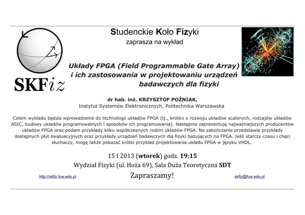 Studenckie Koło Fizyki zaprasza na wykład Układy FPGA (Field Programmable Gate Array) i ich zastosowania w projektowaniu urządzeń badawczych dla fizyki dr hab. inż. KRZYSZTOF POŹNIAK, Instytut Systemów Elektronicznych, Politechnika Warszawska Celem wykładu będzie wprowadzenie do technologii układów FPGA (tj., krótko o rozwoju układów scalonych, rodzajów układów ASIC, budowy układów programowalnych i sposobów ich programowania). Następnie zaprezentuję najważniejszych producentów układów FPGA oraz podam przykłady kilku współczesnych rodzin układów FPGA. Na zakończenie przedstawię przykłady dostępnych płyt ewaluacyjnych oraz przykłady urządzeń badawczych dla fizyki bazujących na FPGA. Jeśli starczy czasu i chęci słuchaczy, mogę także pokazać krótki przykład projektowania układu FPGA w języku VHDL. 15 I 2013 (wtorek) godz. 19:15 Wydział Fizyki (ul. Hoża 69), Sala Duża Teoretyczna SDT http://skfiz.fuw.edu.pl Zapraszamy! [email protected]