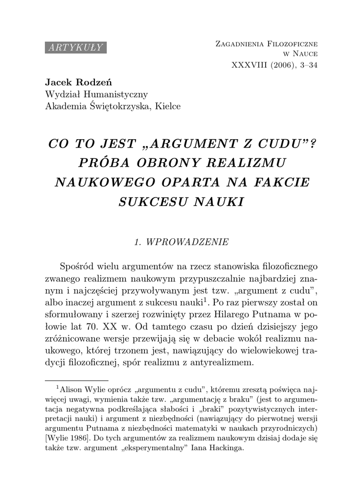 Zagadnienia Filozoficzne w Nauce XXXVIII (2006), 3–34 ARTYKUŁY Jacek Rodzeń Wydział Humanistyczny Akademia Świętokrzyska, Kielce CO TO JEST „ARGUMENT Z CUDU”? PRÓBA OBRONY REALIZMU NAUKOWEGO OPARTA NA FAKCIE SUKCESU NAUKI 1. WPROWADZENIE Spośród wielu argumentów na rzecz stanowiska filozoficznego zwanego realizmem naukowym przypuszczalnie najbardziej znanym i najczęściej przywoływanym jest tzw. „argument z cudu”, albo inaczej argument z sukcesu nauki1 . Po raz pierwszy został on sformułowany i szerzej rozwinięty przez Hilarego Putnama w połowie lat 70. XX w. Od tamtego czasu po dzień dzisiejszy jego zróżnicowane wersje przewijają się w debacie wokół realizmu naukowego, której trzonem jest, nawiązujący do wielowiekowej tradycji filozoficznej, spór realizmu z antyrealizmem. 1 Alison Wylie oprócz „argumentu z cudu”, któremu zresztą poświęca najwięcej uwagi, wymienia także tzw. „argumentację z braku” (jest to argumentacja negatywna podkreślająca słabości i „braki” pozytywistycznych interpretacji nauki) i argument z niezbędności (nawiązujący do pierwotnej wersji argumentu Putnama z niezbędności matematyki w naukach przyrodniczych) [Wylie 1986]. Do tych argumentów za realizmem naukowym dzisiaj dodaje się także tzw. argument „eksperymentalny” Iana Hackinga. 4 Jacek Rodzeń Nawiązując do pierwotnego Putnamowskiego sformułowania „argumentu z cudu” można powiedzieć, że składa się on niejako z dwóch składowych — sloganowej i ściśle argumentacyjnej. Zgodnie z pierwszą składową, sukcesy nauki pozostawałyby czymś „cudownym”, gdybyśmy ich nie wyjaśnili przez odwołanie się do tezy realizmu naukowego, to znaczy stanowiska filozoficznego przypisującego kwalifikację prawdziwości teoriom naukowym oraz niepuste odniesienie przedmiotowe postulowanym w tych teoriach terminom teoretycznym. Z kolei składowa ściśle argumentacyjna wyraża się w stwierdzeniu, iż tak sformułowana teza realizmu naukowego jest najlepszym, jeśli nie jedynym filozoficznym wyjaśnieniem faktu sukcesu nauki. Aby uprzedzić możliwe nieporozumienia związane z występującym w nazwie argumentu słowem „cud”, należy od razu wyjaśnić, że nie posiada ono jakichkolwiek konotacji teologicznych. „Argument z cudu” pojawił się w kontekście debaty filozoficznej wokół realizmu naukowego, jaka zrodziła się w okresie schyłku empiryzmu logicznego w połowie XX w.2 Argument z sukcesu nauki miał od tego czasu służyć jako rodzaj obrony stanowiska realizmu naukowego, zwłaszcza wobec wciąż żywych neopozytywistycznych i instrumentalistycznych interpretacji nauki. Według zwolenników realizmu, odwołujących się do pojęcia prawdziwości teorii oraz istnienia postulowanych przez nie bytów, tylko taka interpretacja lub wyjaśnienie sukcesów nauki sprawia, że nie jawią się one nam jako coś cudownego, czyli zasadniczo niewyjaśnialnego. Natomiast wyjaśnienia typu pozytywistycznego lub instrumentalistycznego, choć również usiłują zmierzyć się z faktem sukcesu nauki, to jednak pozostawiają z nim jakieś zasadnicze irrationale. 2 Schyłek empiryzmu logicznego i szersze otwarcie się filozofów na problematykę metafizyczną w nauce jest rodzajem inspiracji typu filozoficznego. Można również mówić o inspiracji płynącej z samego faktu dynamicznie rozwijającej się nauki wraz z techniką w okresie powojennym w latach 50. i 60., który stanowił najbardziej „namacalny” przejaw sukcesu nauki (por. także [Fine 1998]). Co to jest „argument z cudu”?... 5 Choć Putnam w swojej argumentacji na rzecz realizmu naukowego posługiwał się terminem „cud”, nazwa „argument z cudu” (miracle argument) po raz pierwszy została ukuta przez Jamesa Roberta Browna w roku 1982 [Brown 1982, 232]. Z czasem, wydaje się, że głównie za przyczyną jednego z czołowych obecnych obrońców realizmu naukowego Stathisa Psillosa, pojawiła się również nieco inna nazwa argumentu z sukcesu nauki — argument „z braku cudu” (no miracle argument i związany z tym, obecnie bardzo popularny skrót NMA, por. [Psillos 1999]). Nawet filozofowie niemieckojęzyczni zdążyli już ukuć własną kalkę dla angielskiej nazwy — „Wunderargument” (zob. np. [Carrier 2001, 28]). W aktualnej debacie wokół realizmu naukowego argument z sukcesu nauki pojawia się także pod jeszcze inną nazwą, ukutą z kolei przez Basa van Fraassena — „ostatecznego argumentu za realizmem naukowym” (ultimate argument for scientific realism) [van Fraassen 1980, 39]. Niniejszy artykuł ma na celu przede wszystkim przybliżyć filozofię argumentacji z sukcesu nauki na rzecz realizmu, zwaną „argumentem z cudu”, jaka zarysowała się zwłaszcza w jego pierwotnych wersjach, jak również w opiniach jej krytyków. Nie ma on natomiast ambicji wszechstronnej prezentacji „kondycji” tego argumentu w wielowątkowym i już dość skomplikowanym aktualnym kontekście debaty wokół realizmu naukowego. Jak się okazuje „argument z cudu” ma także swoje historyczne antycypacje, sięgające czasów powstania nowożytnych nauk przyrodniczych. Dlatego w drugim paragrafie w skrócie zostaną przytoczone wybrane przykłady takiej argumentacji. Z kolei w trzecim paragrafie zostaną przedstawione trzy klasyczne współczesne wersje „argumentu z cudu”: proto–argument J.J.C. Smarta, „kanoniczny” argument wczesnego H. Putnama i argument wyrafinowany R.N. Boyda. W czwartym zostaną omówione „głosy krytyczne” wobec tego rodzaju argumentacji ze strony trzech antyrealistycznie zorientowanych „mistrzów podejrzeń”: B.C. van 6 Jacek Rodzeń Fraassena, L. Laudana i A. Fine’a3 . W ostatnim, piątym paragrafie, zostanie m.in. poddana pod rozwagę propozycja szerszego uwzględnienia w „argumentacji z cudu” form lub przejawów sukcesu nauki, zarówno tych lepiej poznanych, jak sukces nowych predykcji i sukces unifikacyjny ora