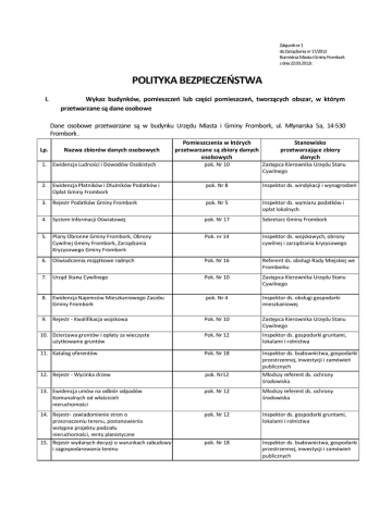 Załącznik nr 1 do Zarządzenia nr 17/2012 Burmistrza Miasta i Gminy Frombork z dnia 22.03.2012r. POLITYKA BEZPIECZEŃSTWA I. Wykaz budynków, pomieszczeń lub części pomieszczeń, tworzących obszar, w którym przetwarzane są dane osobowe Dane osobowe przetwarzane są w budynku Urzędu Miasta i Gminy Frombork, ul. Młynarska 5a, 14-530 Frombork . Lp. Nazwa zbiorów danych osobowych Pomieszczenia w których przetwarzane są zbiory danych osobowych Stanowisko przetwarzające zbiory danych 1. Ewidencja Ludności i Dowodów Osobistych pok. Nr 10 Zastępca Kierownika Urzędu Stanu Cywilnego 2. Ewidencja Płatników i Dłużników Podatków i Opłat Gminy Frombork pok. Nr 8 Inspektor ds. windykacji i wynagrodzeń 3. Rejestr Podatków Gminy Frombork pok. Nr 5 Inspektor ds. wymiaru podatków i opłat lokalnych 4. System Informacji Oświatowej pok. Nr 17 Sekretarz Gminy Frombork 5. Plany Obronne Gminy Frombork, Obrony Cywilnej Gminy Frombork, Zarządzania Kryzysowego Gminy Frombork Pok. nr 14 Inspektor ds. wojskowych, obrony cywilnej i zarządzania kryzysowego 6. Oświadczenia majątkowe radnych Pok. Nr 16 Referent ds. obsługi Rady Miejskiej we Fromborku 7. Urząd Stanu Cywilnego Pok. Nr 10 Zastępca Kierownika Urzędu Stanu Cywilnego 8. Ewidencja Najemców Mieszkaniowego Zasobu Gminy Frombork pok. Nr 4 Inspektor ds. obsługi gospodarki mieszkaniowej 9. Rejestr - Kwalifikacja wojskowa Pok. Nr 10 Zastępca Kierownika Urzędu Stanu Cywilnego 10. Dzierżawa gruntów i opłaty za wieczyste użytkowanie gruntów Pok. Nr 12 Inspektor ds. gospodarki gruntami, lokalami i rolnictwa 11. Katalog oferentów Pok. Nr 18 12. Rejestr - Wycinka drzew pok. Nr12 Inspektor ds. budownictwa, gospodarki przestrzennej, inwestycji i zamówień publicznych Młodszy referent ds. ochrony środowiska 13. Ewidencja umów na odbiór odpadów Komunalnych od właścicieli nieruchomości pok. Nr 12 Młodszy referent ds. ochrony środowiska 14. Rejestr- zawiadomienie stron o przeznaczeniu terenu, postanowienia wstępne projektu podziału nieruchomości, renty planistyczne 15. Rejestr wydanych decyzji o warunkach zabudowy i zagospodarowania terenu pok. Nr 12 Inspektor ds. gospodarki gruntami, lokalami i rolnictwa pok. Nr 18 Inspektor ds. budownictwa, gospodarki przestrzennej, inwestycji i zamówień publicznych Polityka Bezpieczeństwa UMiG Frombork II. Lp. Wykaz zbiorów danych osobowych wraz ze wskazaniem programów zastosowanych do przetwarzania tych danych Nazwa zbiorów danych osobowych Pomieszczenia w których przetwarzane są zbiory danych osobowych Oprogramowanie/wersja 1. Ewidencja Ludności i Dowodów Osobistych pok. Nr 10 PUMA/Moduł EL/03.061 2. Ewidencja Płatników i Dłużników Podatków i Opłat Gminy Frombork pok. Nr 8 Płatnik/ 8.01.001 3. Rejestr Podatków Gminy Frombork pok. Nr 5 GRAVIS/Podatki/2006.04 4. System Informacji Oświatowej pok. Nr 17 SIO/3.12.0 5. Plany Obronne Gminy Frombork, Obrony Cywilnej Gminy Frombork, Zarządzania Kryzysowego Gminy Frombork Pok. nr 14 Word/2002 6. Oświadczenia majątkowe radnych Pok. Nr 16 Word/2002 7. Urząd Stanu Cywilnego Pok. Nr 10 PUMA/Moduł USC/03.061 8. Ewidencja Najemców Mieszkaniowego Zasobu Gminy Frombork pok. Nr 4 GRAVIS/Czynsz/2007.05 9. Rejestr - Kwalifikacja wojskowa Pok. Nr 10 PUMA/Moduł EL/03.061 10. Dzierżawa gruntów i opłaty za wieczyste użytkowanie gruntów Pok. Nr 12 Word/2002 11. Katalog oferentów Pok. Nr 18 Word/2002 12. Rejestr - Wycinka drzew pok. Nr12 Word/2002 13. Ewidencja umów na odbiór odpadów Komunalnych od właścicieli nieruchomości pok. Nr 12 Word/2002 14. Rejestr- zawiadomienie stron o przeznaczeniu terenu, postanowienia wstępne projektu podziału nieruchomości, renty planistyczne 15. Rejestr wydanych decyzji o warunkach zabudowy i zagospodarowania terenu pok. Nr 12 Word/2002 pok. Nr 18 Word/2002 2 Polityka Bezpieczeństwa UMiG Frombork III. Opis struktury zbiorów danych osobowych wskazujących zawartość poszczególnych pól informacyjnych i powiązania pomiędzy nimi: 1. Zbiór danych: „Ewidencja Ludności i Dowodów Osobistych” zawiera następujące pola: - Imiona i nazwiska - Imiona i nazwiska rodowe rodziców - Nazwisko rodowe - Data urodzenia - Miejsce urodzenia - Numer PESEL - Kolor oczu - Wzrost w cm - Płeć - Adres zamieszkania - Rodzaj zameldowania - Kod pocztowy - Posiadany dotychczasowy dokument tożsamości (seria, nr, nazwa i siedziba wystawcy) - Przyczyna wystawienia dowodu - Data i przyczyna utraty - Dane osobowe (nazwiska i imiona, nazwisko rodowe i z poprzedniego małżeństwa, imiona rodziców, data urodzenia, miejsce urodzenia, akta urodzenia, data i nr USC) - Dane osobowe archiwalne (nazwiska i imiona, nazwisko rodowe i z poprzedniego małżeństwa) - Adres zamieszkania lub pobytu stałego oraz data zameldowania - Adres czasowy oraz czas pobytu czasowego - Archiwalne adresy zamieszkania lub pobytu stałego oraz data zameldowania - Dokument tożsamości (rodzaj dokumentu, seria i numer dowodu, wystawca dokumentu, rysopis: wzrost, kolor oczu, znaki szczególne) - Numer ewidencyjny PESEL - USC i nr aktu urodzenia - Stan cywilny (imię i nazwisko współ małżonka, nazwisko rodowe i nazwisko z poprzedniego małżeństwa, data zawarcia małżeństwa, USC i numer aktu małżeństwa) - Data wydania i wydający dokument tożsamości - Stan cywilny archiwalny (imię i nazwisko współmałżonka, nazwisko rodowe i nazwisko z poprzedniego małżeństwa, data zawarcia małżeństwa, USC i numer aktu małżeństwa - Archiwalne dokumenty tożsamości - Obowiązek wojskowy (czy podlega obowiązkowi, nazwa i nr wojskowego dokumentu tożsamości, stopień wojskowy) - Data zgonu, USC i numer aktu zgonu - Imiona i nazwiska rodowe - Narodowość - Obywatelstwo (data zmiany, podstawa prawna) - Adnotacje o rozwodzie 3 Polityka Bezpieczeństwa UMiG Frombork 2. Zbiór danych „Ewidencja Płatników i Dłużników Podatków i Opłat Gminy Frombork” zawiera następujące pola: - Nazwiska i imiona - Imiona rodziców 