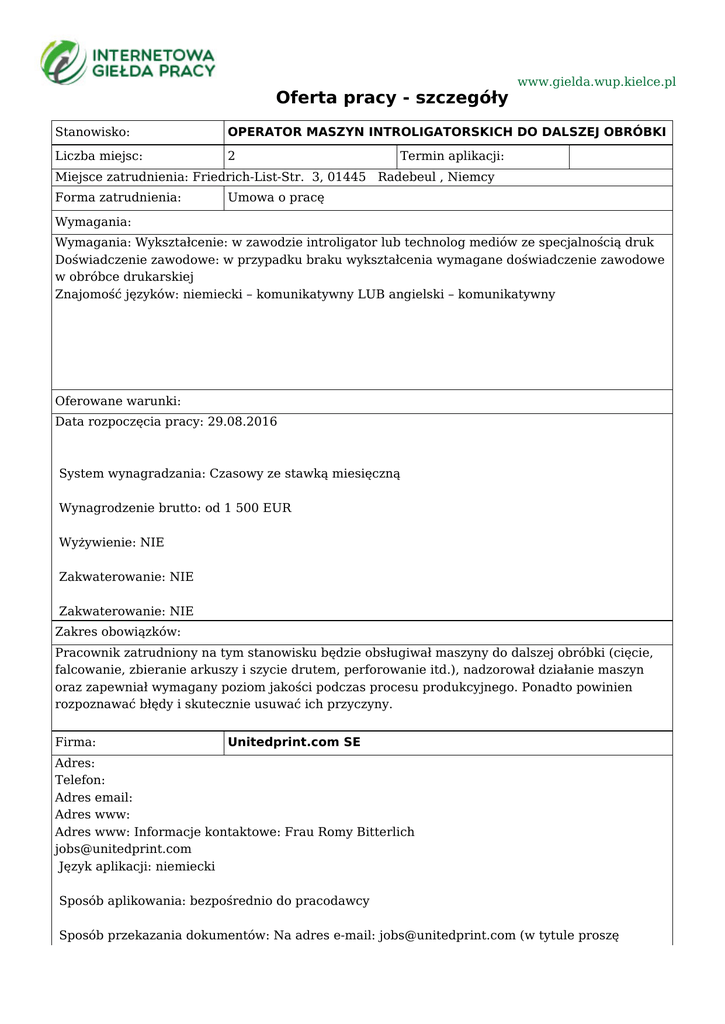 Oferta pracy - szczegóły www.gielda.wup.kielce.pl Stanowisko: OPERATOR MASZYN INTROLIGATORSKICH DO DALSZEJ OBRÓBKI Liczba miejsc: 2 Termin aplikacji: Miejsce zatrudnienia: Friedrich-List-Str. 3, 01445 Radebeul , Niemcy Forma zatrudnienia: Umowa o pracę Wymagania: Wymagania: Wykształcenie: w zawodzie introligator lub technolog mediów ze specjalnością druk Doświadczenie zawodowe: w przypadku braku wykształcenia wymagane doświadczenie zawodowe w obróbce drukarskiej Znajomość języków: niemiecki – komunikatywny LUB angielski – komunikatywny Oferowane warunki: Data rozpoczęcia pracy: 29.08.2016 System wynagradzania: Czasowy ze stawką miesięczną Wynagrodzenie brutto: od 1 500 EUR Wyżywienie: NIE Zakwaterowanie: NIE Zakwaterowanie: NIE Zakres obowiązków: Pracownik zatrudniony na tym stanowisku będzie obsługiwał maszyny do dalszej obróbki (cięcie, falcowanie, zbieranie arkuszy i szycie drutem, perforowanie itd.), nadzorował działanie maszyn oraz zapewniał wymagany poziom jakości podczas procesu produkcyjnego. Ponadto powinien rozpoznawać błędy i skutecznie usuwać ich przyczyny. Firma: Unitedprint.com SE Adres: Telefon: Adres email: Adres www: Adres www: Informacje kontaktowe: Frau Romy Bitterlich [email protected] Język aplikacji: niemiecki Sposób aplikowania: bezpośrednio do pracodawcy Sposób przekazania dokumentów: Na adres e-mail: [email protected] (w tytule proszę wpisać: „Maschinenführer Weiterverarbeitung“) lub pocztą tradycyjną na adres firmy: Unitedprint.com SE Frau Romy Bitterlich Friedrich-List-Str. 3 01445 Radebeul Saksonia Niemcy Wymagane dokumenty: Szczegółowo opisane CV w j. niemieckim z podaniem najwcześniejszego możliwego terminu rozpoczęcia pracy Uwagi: Identyfikator oferty: 10000-1143133778-S Instytucja koordynująca ofertę: Dolnośląski Wojewódzki Urząd Pracy Filia we Wrocławiu Urząd Pracy dokłada wszelkich starań, aby oferty pracy będące w zasobach urzędu, były rzetelne i wiarygodne. Ponieważ wszystkie oferty pracy pochodzą od osób trzecich Urząd Pracy zastrzega, że odpowiedzialność za ewentualne rozbieżności pomiędzy warunkami pracy zaprezentowanymi w niniejszej ofercie a warunkami zaproponowanymi przez potencjalnego pracodawcę ponosi pracodawca.