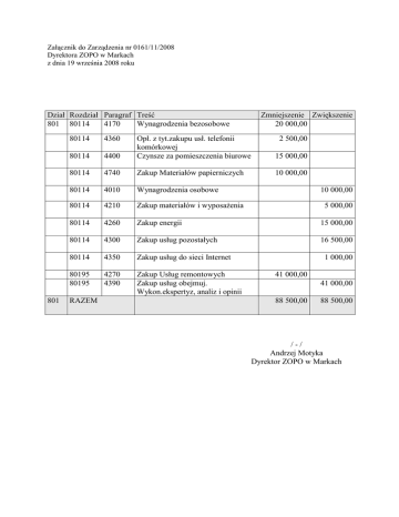 Załącznik do Zarządzenia nr 0161/11/2008 Dyrektora ZOPO w Markach z dnia 19 września 2008 roku Dział Rozdział Paragraf Treść 801 80114 4170 Wynagrodzenia bezosobowe 801 80114 4360 80114 Zmniejszenie Zwiększenie 20 000,00 4400 Opł. z tyt.zakupu usł. telefonii komórkowej Czynsze za pomieszczenia biurowe 15 000,00 80114 4740 Zakup Materiałów papierniczych 10 000,00 80114 4010 Wynagrodzenia osobowe 80114 4210 Zakup materiałów i wyposaŜenia 80114 4260 Zakup energii 15 000,00 80114 4300 Zakup usług pozostałych 16 500,00 80114 4350 Zakup usług do sieci Internet 80195 80195 4270 4390 Zakup Usług remontowych Zakup usług obejmuj. Wykon.ekspertyz, analiz i opinii RAZEM 2 500,00 10 000,00 5 000,00 1 000,00 41 000,00 41 000,00 88 500,00 88 500,00 /-/ Andrzej Motyka Dyrektor ZOPO w Markach