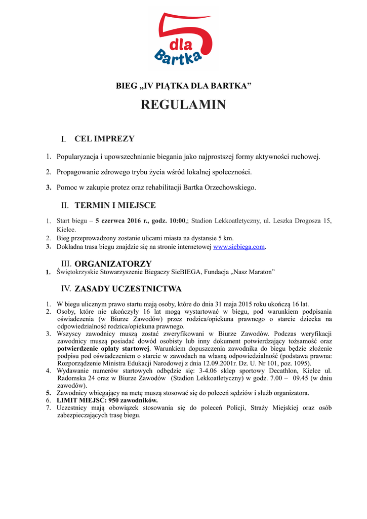 BIEG „IV PIĄTKA DLA BARTKA” REGULAMIN I. CEL IMPREZY 1. Popularyzacja i upowszechnianie biegania jako najprostszej formy aktywności ruchowej. 2. Propagowanie zdrowego trybu życia wśród lokalnej społeczności. 3. Pomoc w zakupie protez oraz rehabilitacji Bartka Orzechowskiego. II. TERMIN I MIEJSCE 1. Start biegu – 5 czerwca 2016 r., godz. 10:00,; Stadion Lekkoatletyczny, ul. Leszka Drogosza 15, Kielce. 2. Bieg przeprowadzony zostanie ulicami miasta na dystansie 5 km. 3. Dokładna trasa biegu znajdzie się na stronie internetowej www.siebiega.com. III. ORGANIZATORZY 1. Świętokrzyskie Stowarzyszenie Biegaczy SieBIEGA, Fundacja „Nasz Maraton” IV. ZASADY UCZESTNICTWA 1. W biegu ulicznym prawo startu mają osoby, które do dnia 31 maja 2015 roku ukończą 16 lat. 2. Osoby, które nie ukończyły 16 lat mogą wystartować w biegu, pod warunkiem podpisania oświadczenia (w Biurze Zawodów) przez rodzica/opiekuna prawnego o starcie dziecka na odpowiedzialność rodzica/opiekuna prawnego. 3. Wszyscy zawodnicy muszą zostać zweryfikowani w Biurze Zawodów. Podczas weryfikacji zawodnicy muszą posiadać dowód osobisty lub inny dokument potwierdzający tożsamość oraz potwierdzenie opłaty startowej. Warunkiem dopuszczenia zawodnika do biegu będzie złożenie podpisu pod oświadczeniem o starcie w zawodach na własną odpowiedzialność (podstawa prawna: Rozporządzenie Ministra Edukacji Narodowej z dnia 12.09.2001r. Dz. U. Nr 101, poz. 1095). 4. Wydawanie numerów startowych odbędzie się: 3-4.06 sklep sportowy Decathlon, Kielce ul. Radomska 24 oraz w Biurze Zawodów (Stadion Lekkoatletyczny) w godz. 7.00 – 09.45 (w dniu zawodów). 5. Zawodnicy wbiegający na metę muszą stosować się do poleceń sędziów i służb organizatora. 6. LIMIT MIEJSC: 950 zawodników. 7. Uczestnicy mają obowiązek stosowania się do poleceń Policji, Straży Miejskiej oraz osób zabezpieczających trasę biegu. V. ZGŁOSZENIA 1. Zgłoszenia dokonywane są drogą elektroniczną poprzez wypełnienie formularza zamieszczonego na stronie www.siebiega.com. 2. Zgłoszenia elektroniczne przyjmowane są do 2 czerwca 2016r. ww. stronie, lub do wyczerpania limitu uczestników (950 osób). 3. Opłatę startową w wysokości minimum 10 zł należy wpłacać przelewem na konto bankowe: Fundacja „Nasz Maraton” Bank BGŻ BNP Paribas: 21203000451110000004240470 wpłaty tytułem: Orzechowski Bartłomiej - darowizna na pomoc i ochronę zdrowia w terminie do 02 czerwca 2016r. 4. Nie ma możliwości przeniesienia opłaty startowej na innego uczestnika, a w przypadku rezygnacji z uczestnictwa w biegu, opłata startowa nie podlega zwrotowi. VI. NAGRODY 1. Impreza ma charakter rekreacyjno-charytatywny. 2. Dla najlepszych zawodników przewidziano drobne upominki. VII.ZASADY FINANSOWANIA 1. Zawodnicy startują na własny koszt. 2. Koszty organizacyjne pokrywają organizatorzy i sponsorzy. 3. Opłata startowa min. 10 zł. VIII.POSTANOWIENIA KOŃCOWE 1. Wszystkich uczestników Biegu obowiązuje niniejszy Regulamin. 2. Organizator i wszystkie osoby z nim współpracujące, a także osoby związane z prowadzeniem i organizacją biegu nie ponoszą odpowiedzialności względem uczestników za szkody osobowe, rzeczowe i majątkowe, które wystąpią przed, w trakcie lub po biegu. 3. Uczestnik startuje na własną odpowiedzialność. 4. Organizator nie bierze odpowiedzialności za skutki działań niezgodnych z Regulaminem, jak również za zdarzenia losowe, których nie da się przewidzieć. 5. Odpowiedzialność organizatora wygasa wraz z zakończeniem biegu na stadionie lekkoatletycznym. 6. Ostateczna interpretacja niniejszego Regulaminu należy do organizatora.