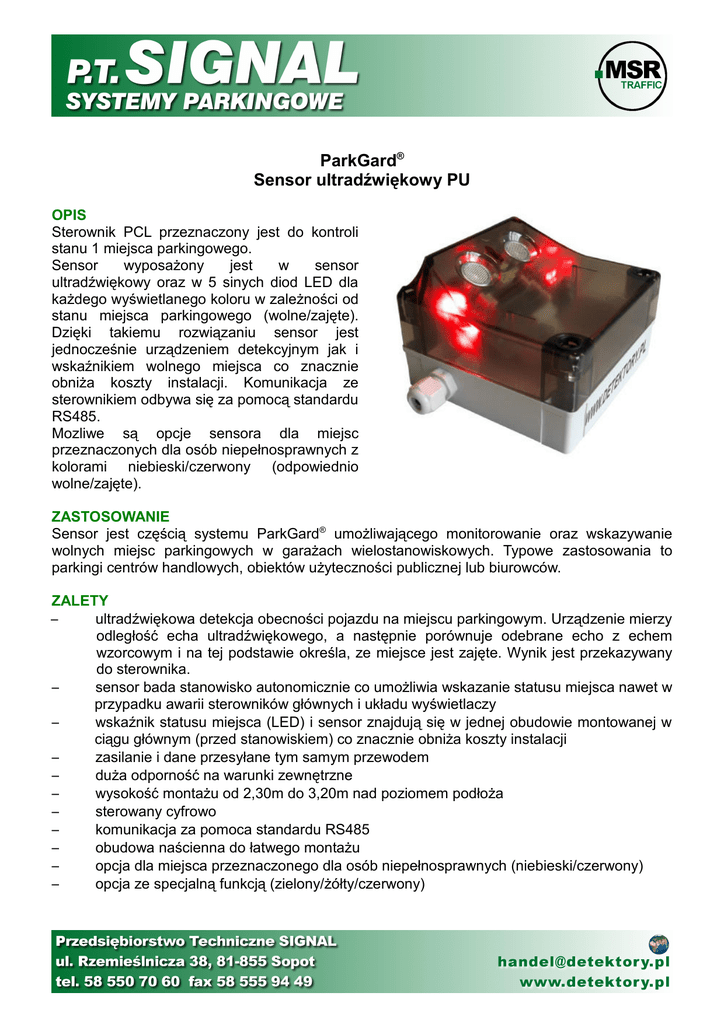 ParkGard® Sensor ultradźwiękowy PU OPIS Sterownik PCL przeznaczony jest do kontroli stanu 1 miejsca parkingowego. Sensor wyposażony jest w sensor ultradźwiękowy oraz w 5 sinych diod LED dla każdego wyświetlanego koloru w zależności od stanu miejsca parkingowego (wolne/zajęte). Dzięki takiemu rozwiązaniu sensor jest jednocześnie urządzeniem detekcyjnym jak i wskaźnikiem wolnego miejsca co znacznie obniża koszty instalacji. Komunikacja ze sterownikiem odbywa się za pomocą standardu RS485. Mozliwe są opcje sensora dla miejsc przeznaczonych dla osób niepełnosprawnych z kolorami niebieski/czerwony (odpowiednio wolne/zajęte). ZASTOSOWANIE Sensor jest częścią systemu ParkGard® umożliwającego monitorowanie oraz wskazywanie wolnych miejsc parkingowych w garażach wielostanowiskowych. Typowe zastosowania to parkingi centrów handlowych, obiektów użyteczności publicznej lub biurowców. ZALETY – ultradźwiękowa detekcja obecności pojazdu na miejscu parkingowym. Urządzenie mierzy odległość echa ultradźwiękowego, a następnie porównuje odebrane echo z echem wzorcowym i na tej podstawie określa, ze miejsce jest zajęte. Wynik jest przekazywany do sterownika. – sensor bada stanowisko autonomicznie co umożliwia wskazanie statusu miejsca nawet w przypadku awarii sterowników głównych i układu wyświetlaczy – wskaźnik statusu miejsca (LED) i sensor znajdują się w jednej obudowie montowanej w ciągu głównym (przed stanowiskiem) co znacznie obniża koszty instalacji – zasilanie i dane przesyłane tym samym przewodem – duża odporność na warunki zewnętrzne – wysokość montażu od 2,30m do 3,20m nad poziomem podłoża – sterowany cyfrowo – komunikacja za pomoca standardu RS485 – obudowa naścienna do łatwego montażu – opcja dla miejsca przeznaczonego dla osób niepełnosprawnych (niebieski/czerwony) – opcja ze specjalną funkcją (zielony/żółty/czerwony) DANE TECHNICZNE ELEKTRYCZNE Zasilanie Zużycie prądu (bez opcji dodatkowych) 24 VDC Sensor 5mA, LED 20mA, średnio 0,8W SENSOR Metoda pomiaru Częstotliwość Szerokość pasma Kąt padania Ultradźwiękowy pomiar odległości 41 kHz <1 kHz 30o KOMUNIKACJA Rodzaj komunikacji Przewód Cyfrowa RS485 2 przewodowa (>0.5mm2) asynchroniczna 19200 J-YY 2x2x0.8" WIZUALIZACJA Wyświetlacz optyczny statusu (LED) Natężenie światła Zielony = wolne / czerwony = zajęte (standard) >5Cd (na kolor) ZAKRESY PRACY i PRZECHOWYWANIA Wilgotność 0-95% RH Temperatura pracy -20oC - +70oC Temperatura przechowywania -20oC – 85oC Czas przechowywania Bez ograniczeń CECHY FIZYCZNE Obudowa Kolor Wymiary obudowy Przepust kablowy Waga Stopień ochrony Rodzaj instalacji Tworzywo sztuczne jasno szary 100 x 100 x 70 mm (W x H x D) bez dławnic PG7 (7mm) ok. 0,5kg IP43 (wewnątrz pomieszczeń) naścienna GWARANCJA 24 miesiące na urządzenie OZNACZENIA KODOWE PRODUKTU PU-02-4-01XX 0 1 2 Kolory wyświetlacza zielony/czerwony (standard) Kolory wyświetlacza zielony/żółty/czerwony Kolory wyświetlacza niebieski/czerwony (dla miejsca przeznaczonego dla osób niepełnosprawnych 0 1 2 wejścia kablowe po obu stronach obudowy (standard) wejśca kablowe od spodu obudowy Przykład: PU-02-04-0100 Sensor PU z wyświetlaczem zielony/czerwony i wejściami kablowymi po obu stronach obudowy Wszelkie prawa autorskie zastrzeżone. Niniejsza karta katalogowa nie może być powielana, dystrybuowana ani modyfikowana w żaden sposób ani przy wykorzystaniu jakichkolwiek środków bez zgody P.T.SIGNAL. Treść karty katalogowej oraz parametry urządzenia mogą być zmienione bez uprzedzenia.