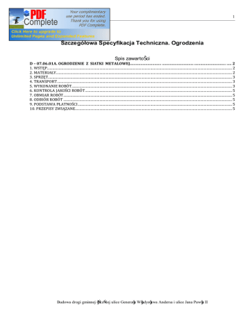 1 Szczegółowa Specyfikacja Techniczna. Ogrodzenia Spis zawartości D – 07.06.01A. OGRODZENIE Z SIATKI METALOWEJ................................ ................................ ................................ ..... 2 1. WSTĘP............................................................................................................................................................................................................ 2 2. MATERIAŁY.................................................................................................................................................................................................. 2 3. SPRZĘT........................................................................................................................................................................................................... 3 4. TRANSPORT ................................................................................................................................................................................................. 3 5. WYKONANIE ROBÓT................................................................................................................................................................................. 3 6. KONTROLA JAKOŚCI ROBÓT .................................................................................................................................................................. 5 7. OBMIAR ROBÓT .......................................................................................................................................................................................... 5 8. ODBIÓR ROBÓT .......................................................................................................................................................................................... 5 9. PODSTAWA PŁATNOŚCI .......................................................................................................................................................................... 5 10. PRZEPISY ZWIĄZANE............................................................................................................................................................................. 5 Budowa drogi gminnej łączącej ulice Generała Władysława Andersa i ulice Jana Pawła II 2 D – 07.06.01A. OGRODZENIE Z SIATKI METALOWEJ 1. WSTĘP 1.1.-1.3. Przedmiot i zakres ST Przedmiotem niniejszej specyfikacji technicznej SST są wymagania dotyczące wykonania i odbioru robót związanych z wykonaniem ogrodzenia z siatki metalowej wokół parkingu w ramach realizacji projektu „Budowa drogi gminnej łączącej ulice Generała Władysława Andersa i ulice Jana Pawła II” Ustalenia zawarte w niniejszej specyfikacji dotyczą zasad prowadzenia robót związanych z wykonaniem i odbiorem ogrodzenia z siatki metalowej plecionej ślimakowej na linkach stalowych, ze słupkami z rur stalowych i kompletnymi bramami lub furtkami. 1.4. Określenia podstawowe 1.4.1. Ogrodzenie posesji przydrożnej - przegroda fizyczna, chroniąca przed przedostawaniem się niepożądanych intruzów (np. ludzi, zwierząt lub pojazdów) na posesję położoną w pobliżu drogi. 1.4.2. Siatka metalowa - siatka wykonana z drutu, pleciona, zgrzewana, skręcana oraz kombinowana, o różnych wielkościach oczek. 1.4.3. Siatka pleciona ślimakowa - siatka o oczkach kwadratowych, pleciona z płaskich spiral wykonanych z drutu okrągłego. 1.4.4. Stalowa linka usztywniająca - równomiernie skręcone splotki z drutu okrągłego, tworzące linę stalową. 1.4.5. Pozostałe określenia podstawowe są zgodne z obowiązującymi, odpowiednimi polskimi normami i z definicjami podanymi w OST D-M-00.00.00 „Wymagania ogólne” [1] pkt 1.4. 2. MATERIAŁY 2.1. Ogólne wymagania dotyczące materiałów Ogólne wymagania dotyczące materiałów, ich pozyskiwania i składowania, podano w OST D-M-00.00.00 „Wymagania ogólne” [1] pkt 2. 2.2. Materiały do wykonania robót 2.2.1. Zgodność materiałów z dokumentacją projektową Materiały do wykonania robót powinny być zgodne z ustaleniami dokumentacji projektowej lub SST. Na podstawie tych ustaleń lub wskazań Inżyniera należy przyjąć: – rodzaj siatki, np. siatkę metalową plecioną ślimakową, – wysokość siatki (zwykle 1,5 m), – wymiar boku oczka siatki, np. 60 mm, – rodzaj słupków, np. z rur stalowych, oraz ich średnicę, np. 51 ÷ 101 mm, – rodzaj usztywnienia ogrodzenia, np. stalowymi linkami z ich średnicą (np. 2,5 ÷ 5 mm). Niniejsza ST omawia wykonanie siatki metalowej plecionej ślimakowej ze słupkami z rur stalowych okrągłych, usztywnionej stalowymi linkami. 2.2.2. Metalowa siatka pleciona ślimakowa Siatka pleciona ślimakowa (przykład: załącznik, rys. 1) powinna odpowiadać wymaganiom określonym przez OST D-07.06.01 [3]. Długość dostarczanej przez producenta siatki, zwiniętej w rolkę, powinna wynosić od 10 do 25 m. Odchyłki długości nie powinny przekraczać ± 0,1 m dla wielkości boku oczka 30 oraz ± 0,2 m dla siatek wielkości boku oczka od 40 do 70. Powierzchnia siatki powinna być gładka, bez załamań, wybrzuszeń i wgnieceń. Spirala powinna być wykonana z jednego odcinka drutu. Splecenie siatki powinno być przeprowadzone przez połączenie spirali wszystkimi zwojami. Końce spirali z obydwu stron powinny być równo obcięte w odległości co najmniej 30% wymiaru boku oczka. Siatki w rolkach należy przechowywać w pozycji pionowej w pomieszczeniach suchych, z dala od materiałów działających korodująco. Drut w siatce powinien być okrągły, powlekany PCV. Dopuszcza się pokrywanie drutu innymi powłokami, pod warunkiem zaakceptowania przez Inżyniera. Wytrzymałość drutu na rozciąganie powinna wynosić co najmniej 588 MPa (dopuszcza się wytrzymałość od 412 do 588 MPa pod warunkiem akceptacji przez Inżyniera). Dopuszcza się inne rodzaje siatek, np. siatkę zwijaną 