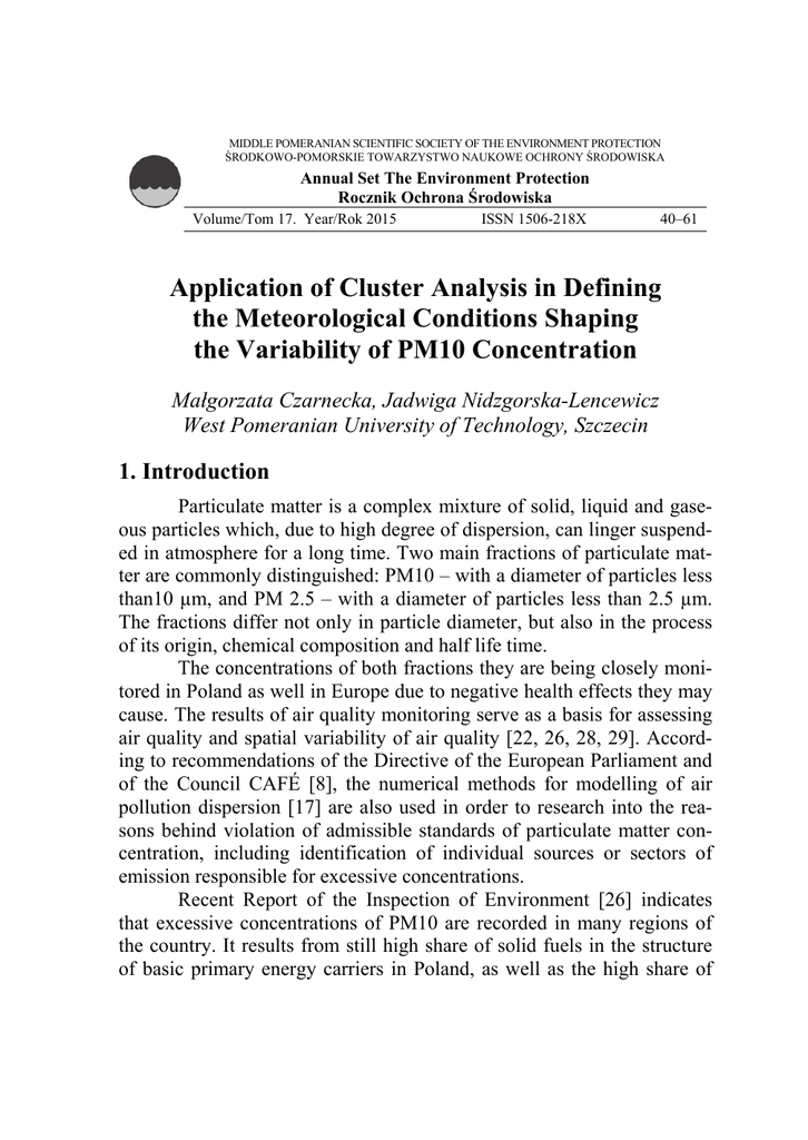 MIDDLE POMERANIAN SCIENTIFIC SOCIETY OF THE ENVIRONMENT PROTECTION ŚRODKOWO-POMORSKIE TOWARZYSTWO NAUKOWE OCHRONY ŚRODOWISKA Annual Set The Environment Protection Rocznik Ochrona Środowiska Volume/Tom 17. Year/Rok 2015 ISSN 1506-218X 40–61 Application of Cluster Analysis in Defining the Meteorological Conditions Shaping the Variability of PM10 Concentration Małgorzata Czarnecka, Jadwiga Nidzgorska-Lencewicz West Pomeranian University of Technology, Szczecin 1. Introduction Particulate matter is a complex mixture of solid, liquid and gaseous particles which, due to high degree of dispersion, can linger suspended in atmosphere for a long time. Two main fractions of particulate matter are commonly distinguished: PM10 – with a diameter of particles less than10 µm, and PM 2.5 – with a diameter of particles less than 2.5 µm. The fractions differ not only in particle diameter, but also in the process of its origin, chemical composition and half life time. The concentrations of both fractions they are being closely monitored in Poland as well in Europe due to negative health effects they may cause. The results of air quality monitoring serve as a basis for assessing air quality and spatial variability of air quality [22, 26, 28, 29]. According to recommendations of the Directive of the European Parliament and of the Council CAFÉ [8], the numerical methods for modelling of air pollution dispersion [17] are also used in order to research into the reasons behind violation of admissible standards of particulate matter concentration, including identification of individual sources or sectors of emission responsible for excessive concentrations. Recent Report of the Inspection of Environment [26] indicates that excessive concentrations of PM10 are recorded in many regions of the country. It results from still high share of solid fuels in the structure of basic primary energy carriers in Poland, as well as the high share of Application of Cluster Analysis in Defining the Meteorological… 41 ground level emission. Because of better ventilation conditions in the northern and central part of Poland smog episodes are not problematic yet in the southern part of Poland, particularly in not-easily ventilated basins and well-developed river valleys, smog episodes occur with greater frequency [25]. Apart from emission, air quality is additionally determined by meteorological factors [4, 7, 18, 27, 31]. The effect of weather can be seen in the formation of the dispersion of pollutants and in the rate of disposition. The level of pollutants dispersion depends on, among other things, the dynamics of air movement which is governed by anemometric conditions and thermal stratification within the atmospheric boundary layer. Concentration is also determined by the types of air mass [12] and type of circulation – as has been demonstrated in Małopolska and Górny Śląsk [19, 20, 30]. Precipitation also plays a significant role in the shaping of aerosanitary conditions. According to Czarnecka and NidzgorskaLencewicz [5], in the period of 2005–2007, mean concentration of PM10 particulate matter recorded in a series of hours and days with precipitation were, depending on a season and day, by 10–35% smaller than concentrations recorded before the precipitation occurred. The research on the relationship between air quality and meteorological conditions makes use of various statistical methods such as: correlation, regression, cluster analysis and principal components analysis [4, 6, 9, 11, 16, 23, 31, 33]. The aim of the present paper is to single out the set of meteorological elements which affect the variability of PM10 concentration in the area of Tricity agglomeration in six winter seasons from 2004/2005 to 2009/2010, with the use of cluster analysis. Only PM10 fraction is taken into consideration in this paper as the obligatory monitoring of PM2.5 particulate matter, as regulated by the Directive 2008/50/WE [8] of 21 May 2008, was introduced in Poland as late as at the beginning of 2010. 2. Materials and methods Maritime industry is the basis for development but also the main source of pollution in Tricity. The metropolitan area is polluted by shipbuilding industry comprising seven shipyards, including the two largest located in Gdańsk and Gdynia, as well as seaports with ongoing produc- 42 Małgorzata Czarnecka, Jadwiga Nidzgorska-Lencewicz tion and services business. Air quality is additionally greatly affected by electrochemical and petrochemical plants, as well as food industry. Additionally, as in every metropolitan area, road transport and power and heat facilities represent important sources of air pollution. The materials used in this study comprise measurements of immission and basic meteorological elements including air temperature, relative humidity, atmospheric pressure as well as wind speed and direction recorded during the calendar winters (December–February) in the period of 2004/2005–2009/2010. Data was obtained from five automatic air quality measuring stations located in the Tricity agglomeration and was provided by the Agency of Regional Air Quality Monitoring in the Gdańsk Metropolitan Area (ARMAAG). The locations of the measuring stations are shown in Fig. 5. Detailed information regarding the methodology of the measurements and elaboration of data is given at http://armaag.gda.pl/. The project of the ARMAAG monitoring network was developed under supervision of Jerzy Trapp, PhD. from the University of Gdańsk and based on longstanding research on meteorological conditions, population density and data on emission from point and surface sources. Monet software obtained by courtesy of the Politecnico di Milano and positively assessed by the Institute of Environmental Protection [34] was used in the project. All the stations located in five districts of Tricity are defined as urban background stations. However, two of them (Gdańsk Wrzeszcz and Gdynia Pogórze) are located in r