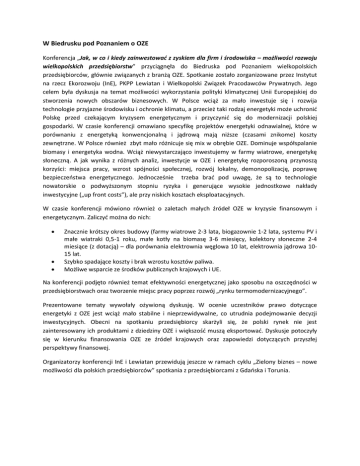 W Biedrusku pod Poznaniem o OZE Konferencja „Jak, w co i kiedy zainwestować z zyskiem dla firm i środowiska – możliwości rozwoju wielkopolskich przedsiębiorstw” przyciągnęła do Biedruska pod Poznaniem wielkopolskich przedsiębiorców, głównie związanych z branżą OZE. Spotkanie zostało zorganizowane przez Instytut na rzecz Ekorozwoju (InE), PKPP Lewiatan i Wielkopolski Związek Pracodawców Prywatnych. Jego celem była dyskusja na temat możliwości wykorzystania polityki klimatycznej Unii Europejskiej do stworzenia nowych obszarów biznesowych. W Polsce wciąż za mało inwestuje się i rozwija technologie przyjazne środowisku i ochronie klimatu, a przecież taki rodzaj energetyki może uchronić Polskę przed czekającym kryzysem energetycznym i przyczynić się do modernizacji polskiej gospodarki. W czasie konferencji omawiano specyfikę projektów energetyki odnawialnej, które w porównaniu z energetyką konwencjonalną i jądrową mają niższe (czasami znikome) koszty zewnętrzne. W Polsce również zbyt mało różnicuje się mix w obrębie OZE. Dominuje współspalanie biomasy i energetyka wodna. Wciąż niewystarczająco inwestujemy w farmy wiatrowe, energetykę słoneczną. A jak wynika z różnych analiz, inwestycje w OZE i energetykę rozporoszoną przynoszą korzyści: miejsca pracy, wzrost spójności społecznej, rozwój lokalny, demonopolizację, poprawę bezpieczeństwa energetycznego. Jednocześnie trzeba brać pod uwagę, że są to technologie nowatorskie o podwyższonym stopniu ryzyka i generujące wysokie jednostkowe nakłady inwestycyjne („up front costs”), ale przy niskich kosztach eksploatacyjnych. W czasie konferencji mówiono również o zaletach małych źródeł OZE w kryzysie finansowym i energetycznym. Zaliczyć można do nich: Znacznie krótszy okres budowy (farmy wiatrowe 2-3 lata, biogazownie 1-2 lata, systemu PV i małe wiatraki 0,5-1 roku, małe kotły na biomasę 3-6 miesięcy, kolektory słoneczne 2-4 miesiące (z dotacją) – dla porównania elektrownia węglowa 10 lat, elektrownia jądrowa 1015 lat. Szybko spadające koszty i brak wzrostu kosztów paliwa. Możliwe wsparcie ze środków publicznych krajowych i UE. Na konferencji podjęto również temat efektywności energetycznej jako sposobu na oszczędności w przedsiębiorstwach oraz tworzenie miejsc pracy poprzez rozwój „rynku termomodernizacyjnego”. Prezentowane tematy wywołały ożywioną dyskusję. W ocenie uczestników prawo dotyczące energetyki z OZE jest wciąż mało stabilne i nieprzewidywalne, co utrudnia podejmowanie decyzji inwestycyjnych. Obecni na spotkaniu przedsiębiorcy skarżyli się, że polski rynek nie jest zainteresowany ich produktami z dziedziny OZE i większość muszą eksportować. Dyskusje potoczyły się w kierunku finansowania OZE ze źródeł krajowych oraz zapowiedzi dotyczących przyszłej perspektywy finansowej. Organizatorzy konferencji InE i Lewiatan przewidują jeszcze w ramach cyklu „Zielony biznes – nowe możliwości dla polskich przedsiębiorców” spotkania z przedsiębiorcami z Gdańska i Torunia.