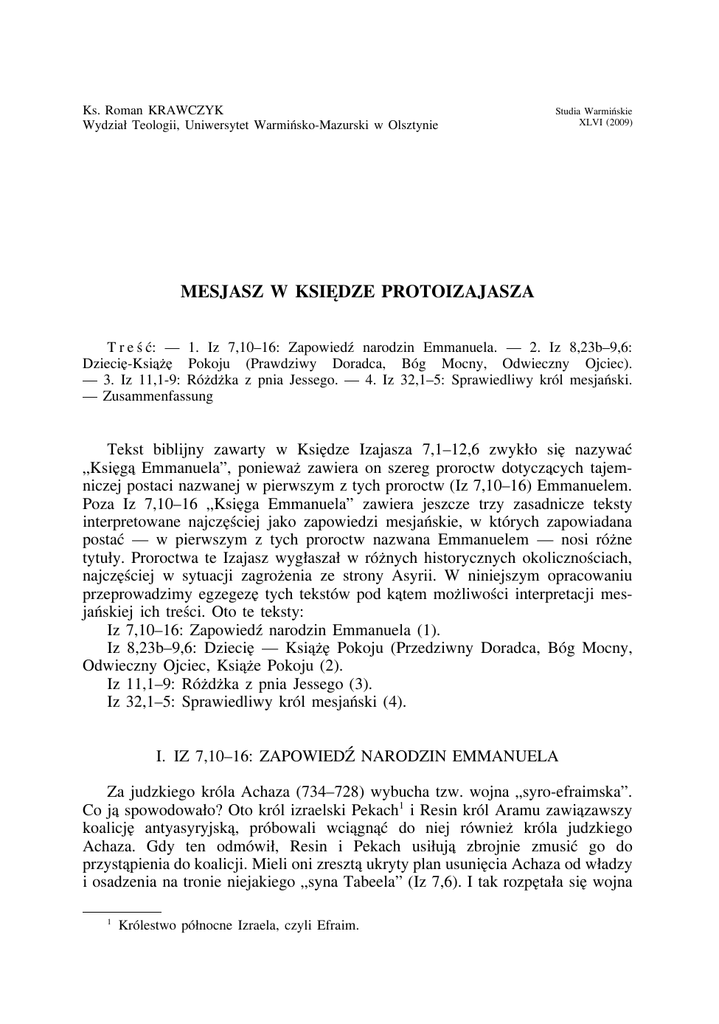 Ks. Roman KRAWCZYK Wydział Teologii, Uniwersytet Warmińsko-Mazurski w Olsztynie Studia Warmińskie XLVI (2009) MESJASZ W KSIEDZE PROTOIZAJASZA T r e ś ć: — 1. Iz 7,10–16: Zapowiedź narodzin Emmanuela. — 2. Iz 8,23b–9,6: Dziecie-Ksiaz e Pokoju (Prawdziwy Doradca, Bóg Mocny, Odwieczny Ojciec). — 3. Iz 11,1-9: Róz dz ka z pnia Jessego. — 4. Iz 32,1–5: Sprawiedliwy król mesjański. — Zusammenfassung Tekst biblijny zawarty w Ksiedze Izajasza 7,1–12,6 zwykło sie nazywać „Ksiega Emmanuela”, poniewaz zawiera on szereg proroctw dotyczacych tajemniczej postaci nazwanej w pierwszym z tych proroctw (Iz 7,10–16) Emmanuelem. Poza Iz 7,10–16 „Ksiega Emmanuela” zawiera jeszcze trzy zasadnicze teksty interpretowane najcześciej jako zapowiedzi mesjańskie, w których zapowiadana postać — w pierwszym z tych proroctw nazwana Emmanuelem — nosi róz ne tytuły. Proroctwa te Izajasz wygłaszał w róz nych historycznych okolicznościach, najcześciej w sytuacji zagroz enia ze strony Asyrii. W niniejszym opracowaniu przeprowadzimy egzegeze tych tekstów pod katem moz liwości interpretacji mesjańskiej ich treści. Oto te teksty: Iz 7,10–16: Zapowiedź narodzin Emmanuela (1). Iz 8,23b–9,6: Dziecie — Ksiaz e Pokoju (Przedziwny Doradca, Bóg Mocny, Odwieczny Ojciec, Ksiaz e Pokoju (2). Iz 11,1–9: Róz dz ka z pnia Jessego (3). Iz 32,1–5: Sprawiedliwy król mesjański (4). I. IZ 7,10–16: ZAPOWIEDŹ NARODZIN EMMANUELA Za judzkiego króla Achaza (734–728) wybucha tzw. wojna „syro-efraimska”. Co ja spowodowało? Oto król izraelski Pekach1 i Resin król Aramu zawiazawszy koalicje antyasyryjska, próbowali wciagnać do niej równiez króla judzkiego Achaza. Gdy ten odmówił, Resin i Pekach usiłuja zbrojnie zmusić go do przystapienia do koalicji. Mieli oni zreszta ukryty plan usuniecia Achaza od władzy i osadzenia na tronie niejakiego „syna Tabeela” (Iz 7,6). I tak rozpetała sie wojna 1 Królestwo północne Izraela, czyli Efraim. 32 KS. ROMAN KRAWCZYK (por. 2 Krl 16,5–9). Wtedy do przeraz onego króla Achaza zwraca sie Izajasz. Prorok był zorientowany, z e Achaz potajemnie z ywił plany zwiazania sie z Asyria, mimo iz wiedział, z e zwiazanie sie z Asyria groziło wpływami bałwochwalczymi. W takim oto kontekście historycznym Izajasz wygłasza swoje proroctwo zawarte w Iz 7,10–16. Najpierw do Achaza zwrócił sie jednak sam Jahwe: Tak mówi Jahwe do Achaza: Proś Jahwe, twego Boga o znak dla siebie, czy to z głebin otchłani, czy z wysokości przestworzy (w. 10–11). Prorok doskonale wiedział, z e Achaz jest pełen obaw, co wiecej, z e potajemnie myśli o wezwaniu na pomoc Asyrie, dowiadujemy sie o tym z 2 Krl 15,7: Wtedy Achaz wysłał posłów do króla asyryjskiego Tiglat-Pilesera ze słowami: Jestem twoim sługa i twoim synem. Przyjdź i wybaw mnie z reki króla Aramu i z reki króla asyryjskiego, którzy staneli przeciw mnie. Izajasz róznymi słowami starał sie odwieść Achaza od tego zamiaru (Uwazaj, badź spokojny, nie bój sie. Niech twoje serce nie słabnie z powodu tych dwóch oto niedopałków dymiacych głowni: Iz 7,4) — ale na próz no. Chcac wiec królowi ułatwić podjecie decyzji wycofania sie z niebezpiecznego zamiaru, proponuje, by poprosił o jakikolwiek znak od Boga, który przekona go, z e Jahwe jest z nim i z jego królestwem. Nadzwyczajność proponowanego znaku (z głebin otchłani, z wysokości przestworzy) podkreśla wszechmoc Boga; chodzi o znaki, które w owych czasach nie podlegały władzy człowieka. A zatem — Bogu moz na zaufać w kaz dych okolicznościach. Lecz Achaz odpowiedział: Nie bede prosił ani wystawiał Jahwe na próbe (w. 12). Wezwanie Izajasza, by król zaufał Jahwe, nie spotkało sie ze zrozumieniem. Achaz uprzejmie odrzuca propozycje (Nie bede... wystawiał Jahwe na próbe), poniewaz nie chce zrezygnować z własnych planów. Ponadto wiemy, z e Achaz nie nalez ał do wiernych wyznawców Jahwe — popierał kult pogański, a nawet własnego syna spalił w ofierze Molochowi (2 Krl 16,3). Wykretna odpowiedź króla wywołała oburzenie proroka: Wtedy rzekł (Izajasz): Posłuchajcie wiec domu Dawida! Czyz wam jeszcze mało, ze naprzykrzacie sie ludziom, iz naprzykrzacie sie takze mojemu Bogu? (w. 13). Prorok wyrzuca królowi i jego dworzanom, z e gnebiono lud zmuszajac go do płacenia podatków i świadczeń na rzecz dworu (naprzykrzacie sie ludziom). Jeszcze gorsze jest to, z e naprzykrzaja sie Bogu — utrudniaja ludowi kult Boga Jahwe — w światyni (2 Krl 16,10–14). Prorok daje królowi do zrozumienia, z e Jahwe nie jest juz jego Bogiem: podczas bowiem gdy w w. 11 uznawał Jahwe za Boga Achaza (Jahwe, twego Boga), to teraz wrecz stwierdza, z e Jahwe nie jest juz jego Bogiem (mojemu Bogu). Jahwe proponował królowi wybór znaku (Proś Jahwe, twego Boga o znak; w. 10), poniewaz jednak ten z propozycji nie chce skorzystać, Jahwe sam da mu znak. Jahwe zwraca sie do niego jako reprezentanta całej dynastii Dawidowej MESJASZ W KSIEDZE PROTOIZAJASZA 33 (Domu Dawida), co podkreśla doniosłość znaku — oredzia, które za chwile bedzie wygłoszone. Dlatego Pan sam da wam znak: Oto panna pocznie i porodzi syna i nazwie go imieniem Emmanuel (w. 14). Wyraz enia uz yte w tym wierszu wskazuja, z e dokona sie szczególne, nadzwyczajne, wrecz cudowne wydarzenie zdziałane przez Boga na potwierdzenie Jego słów. Pierwsze słowo proroctwa: Dlatego (hebr. lākēn) w tekstach biblijnych stoi albo na poczatku gróźb (Iz 1,24; 8,7; 2 Krl 19,32 i inne) albo odwrotnie: na poczatku obietnic (Iz 10,24; Jr 16,14). W naszym wyraz eniu słowo to zdaje sie mieć sens zarówno pozytywny, jak i negatywny, jest zarówno obietnica, jak i groźba, ale kontekst sugeruje, z e dominuje sens pozytywny. Obietnica jest to proroctwo dlatego, z e zapowiada narodziny Emmanuela, to jest „Boga z nami”; imie to jest wiec zapowiedzia, z e Jahwe bedzie nadal, z Dawidem i państwem judzkim jako opiekun.2 Ale proroctwo
