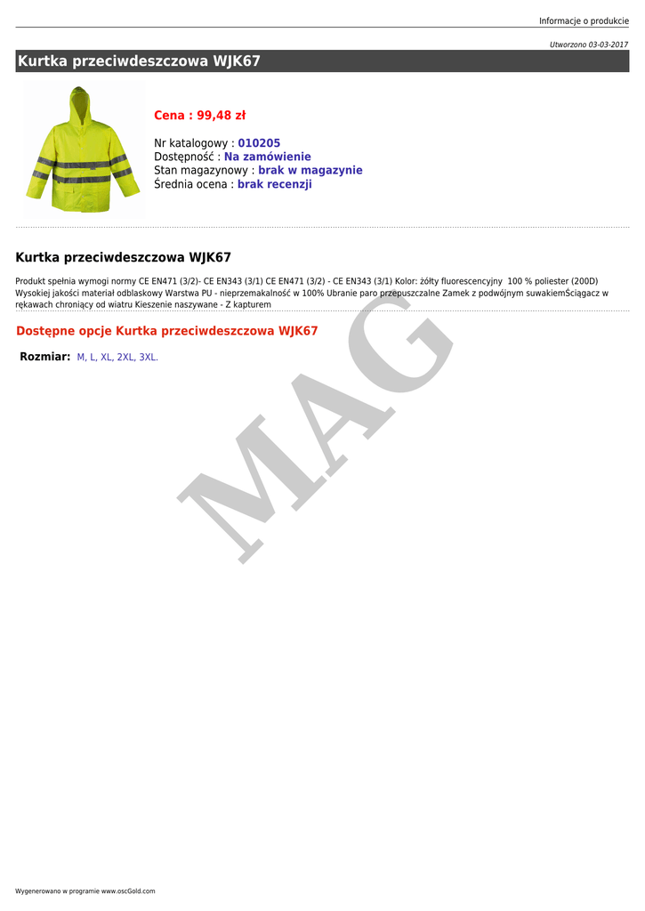 Informacje o produkcie Utworzono 03-03-2017 Kurtka przeciwdeszczowa WJK67 Cena : 99,48 zł Nr katalogowy : 010205 Dostępność : Na zamówienie Stan magazynowy : brak w magazynie Średnia ocena : brak recenzji Kurtka przeciwdeszczowa WJK67 Produkt spełnia wymogi normy CE EN471 (3/2)- CE EN343 (3/1) CE EN471 (3/2) - CE EN343 (3/1) Kolor: żółty fluorescencyjny 100 % poliester (200D) Wysokiej jakości materiał odblaskowy Warstwa PU - nieprzemakalność w 100% Ubranie paro przepuszczalne Zamek z podwójnym suwakiemŚciągacz w rękawach chroniący od wiatru Kieszenie naszywane - Z kapturem M Rozmiar: M, L, XL, 2XL, 3XL. AG Dostępne opcje Kurtka przeciwdeszczowa WJK67 Wygenerowano w programie www.oscGold.com