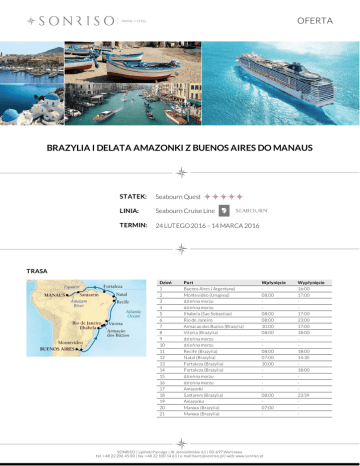 OFERTA BRAZYLIA I DELATA AMAZONKI Z BUENOS AIRES DO MANAUS STATEK: Seabourn Quest LINIA: Seabourn Cruise Line TERMIN: 24 LUTEGO 2016 – 14 MARCA 2016 TRASA Dzień 1 2 3 4 5 6 7 8 9 10 11 12 13 14 15 16 17 18 19 20 21 Port Buenos Aires ( Argentyna) Montevideo (Urugwaj) dzień na morzu dzień na morzu Ilhabela (Sao Sebastiao) Rio de Janeiro Armacao dos Buzios (Brazylia) Vitoria (Brazylia) dzień na morzu dzień na morzu Recife (Brazylia) Natal (Brazylia) Fortaleza (Brazylia) Fortaleza (Brazylia) dzień na morzu dzień na morzu Amazonki Santarem (Brazylia) Amazonka Manaus (Brazylia) Manaus (Brazylia) Wpłynięcie 08:00 08:00 08:00 10:00 08:00 08:00 07:00 10:00 08:00 07:00 - SONRISO | Lipiński Passage | Al. Jero zo limskie 61 | 00-697 Warszawa tel. +48 22 206 45 00 | fax. +48 22 100 14 61 | e-mail: biuro @so nriso .pl | web: www.so nriso .pl Wypłynięcie 16:00 17:00 17:00 23:00 17:00 18:00 18:00 14:30 18:00 23:59 - OFERTA CENA Typ kabiny Cena z osobę Seabourn Suite od 8 999 EUR Veranda Suite od 9 999 EUR Penthouse Suite od 16 999 EUR CENA ZAWIERA DOTATKOWE OPŁATY zakwaterowanie w 2-os. apartamencie wybranej kategorii pełne wyżywienie: 3 posiłki, przekąski między posiłakmi, bufet o północy open bar: wybrane wina i szampany, alkohole premium, różnorodne kawy i herbaty, wody mineralne butelkowane, napoje bezalkoholowe oraz soki dostępne w barach i restauracjach korzystanie z minibaru w apartamencie serwis bagażowy podczas wejścia i zejścia ze statku obsługa kamerdynerska 24 godzinny serwis kabinowy korzystanie z urządzeń sportowo-rekreacyjnych dostępnych na pokładzie (baseny, jacuzzi, boiska sportowe, kluby dla dzieci i młodzieży itp.) udział we wszystkich imprezach organizowanych na pokładzie (przedstawienia, pokazy, aukcje, animacje i inne) opłaty serwisowe (napiwki) dla obsługi statku obowiązkowe opłaty portowe dojazd/przelot do portu rozpoczęcia i zakończenia rejsu transfery (lotnisko - port - lotnisko) ewentualne noclegi przed lub po rejsie wycieczki fakultatywne korzystanie z usług typu: SPA, salon piękności, pralnia itp. wydatki osobiste tj. zakupy w butikach, internet, kasyno itp. obowiązkowe ubezpieczenie turystyczne koszt wymaganych wiz ewentualna opłata paliwowa (linia w momencie wzrotu cen ropy zastrzega sobie prawo do dodania oplaty paliwowej do każdej rezerwacji) Na życzenie świadczymy dodatkowo usługi: rezerwacje hotelowe na całym świecie rezerwacje biletów lotniczych, trasferów oraz parkingu w porcie rezerwacje wycieczek fakultatywnych i innych atrakcji SONRISO | Lipiński Passage | Al. Jero zo limskie 61 | 00-697 Warszawa tel. +48 22 206 45 00 | fax. +48 22 100 14 61 | e-mail: biuro @so nriso .pl | web: www.so nriso .pl