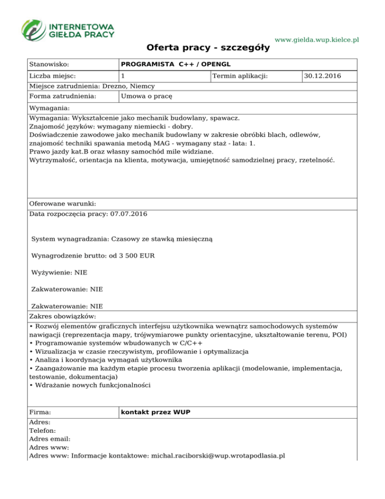 Oferta pracy - szczegóły Stanowisko: PROGRAMISTA C++ / OPENGL Liczba miejsc: 1 www.gielda.wup.kielce.pl Termin aplikacji: 30.12.2016 Miejsce zatrudnienia: Drezno, Niemcy Forma zatrudnienia: Umowa o pracę Wymagania: Wymagania: Wykształcenie jako mechanik budowlany, spawacz. Znajomość języków: wymagany niemiecki - dobry. Doświadczenie zawodowe jako mechanik budowlany w zakresie obróbki blach, odlewów, znajomość techniki spawania metodą MAG - wymagany staż - lata: 1. Prawo jazdy kat.B oraz własny samochód mile widziane. Wytrzymałość, orientacja na klienta, motywacja, umiejętność samodzielnej pracy, rzetelność. Oferowane warunki: Data rozpoczęcia pracy: 07.07.2016 System wynagradzania: Czasowy ze stawką miesięczną Wynagrodzenie brutto: od 3 500 EUR Wyżywienie: NIE Zakwaterowanie: NIE Zakwaterowanie: NIE Zakres obowiązków: • Rozwój elementów graficznych interfejsu użytkownika wewnątrz samochodowych systemów nawigacji (reprezentacja mapy, trójwymiarowe punkty orientacyjne, ukształtowanie terenu, POI) • Programowanie systemów wbudowanych w C/C++ • Wizualizacja w czasie rzeczywistym, profilowanie i optymalizacja • Analiza i koordynacja wymagań użytkownika • Zaangażowanie ma każdym etapie procesu tworzenia aplikacji (modelowanie, implementacja, testowanie, dokumentacja) • Wdrażanie nowych funkcjonalności Firma: kontakt przez WUP Adres: Telefon: Adres email: Adres www: Adres www: Informacje kontaktowe: [email protected] Język aplikacji: niemiecki, angielski Sposób aplikowania: do doradcy EURES z WUP Sposób przekazania dokumentów: email Wymagane dokumenty: CV z odręcznie podpisaną zgodą na przetwarzanie danych osobowych , list motywacyjny , ksero/skan dyplomów potwierdzających kwalifikacje oraz referencje (o ile są) Uwagi: Identyfikator oferty: 10000-1141090204-S Instytucja koordynująca ofertę: Wojewódzki Urząd Pracy w Białymstoku Urząd Pracy dokłada wszelkich starań, aby oferty pracy będące w zasobach urzędu, były rzetelne i wiarygodne. Ponieważ wszystkie oferty pracy pochodzą od osób trzecich Urząd Pracy zastrzega, że odpowiedzialność za ewentualne rozbieżności pomiędzy warunkami pracy zaprezentowanymi w niniejszej ofercie a warunkami zaproponowanymi przez potencjalnego pracodawcę ponosi pracodawca.