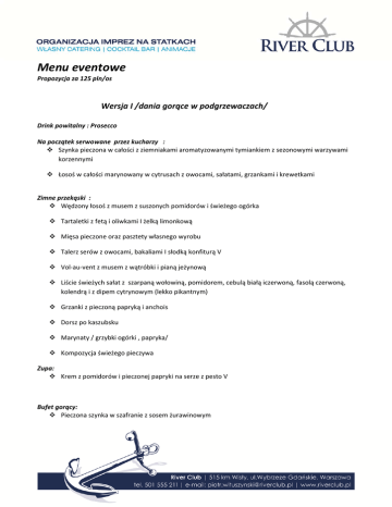 Menu eventowe Propozycja za 125 pln/os Wersja I /dania gorące w podgrzewaczach/ Drink powitalny : Prosecco Na początek serwowane przez kucharzy : Szynka pieczona w całości z ziemniakami aromatyzowanymi tymiankiem z sezonowymi warzywami korzennymi Łosoś w całości marynowany w cytrusach z owocami, sałatami, grzankami i krewetkami Zimne przekąski : Wędzony łosoś z musem z suszonych pomidorów i świeżego ogórka Tartaletki z fetą i oliwkami I żelką limonkową Mięsa pieczone oraz pasztety własnego wyrobu Talerz serów z owocami, bakaliami I słodką konfiturą V Vol‐au‐vent z musem z wątróbki i pianą jeżynową Liście świeżych sałat z szarpaną wołowiną, pomidorem, cebulą białą iczerwoną, fasolą czerwoną, kolendrą i z dipem cytrynowym (lekko pikantnym) Grzanki z pieczoną papryką i anchois Dorsz po kaszubsku Marynaty / grzybki ogórki , papryka/ Kompozycja świeżego pieczywa Zupa: Krem z pomidorów i pieczonej papryki na serze z pesto V Bufet gorący: Pieczona szynka w szafranie z sosem żurawinowym Filet z dorsza marynowany w pesto w cieście francuskim Dodatki do dań Zapiekane puree ziemniaczano‐pietruszkowe V Biały I dziki ryż smażony z groszkiem V Liście świeżych sałat z vinegrette klasycznym/czosnkowym/miodowo‐pomarańczowym V Bufet słodki Babeczki z musami i świeżymi owocami Sernik warszawski z białą czekoladą Muffinki na słodko z konfiturą owocową Wersja II /dania gorące z rusztu / Drink powitalny : Prosecco Na początek serwowane przez kucharzy : Szynka pieczona w całości z ziemniakami aromatyzowanymi tymiankiem z sezonowymi warzywami korzennymi Łosoś w całości marynowany w cytrusach z owocami, sałatami, grzankami i krewetkami Zimne przekąski : Mięsa pieczone oraz pasztety własnego wyrobu Talerz serów z owocami, bakaliami I słodką konfiturą V Śledzie na galaretce z czerwonej cebuli Świeże sezonowe warzywa z dipem serowym lub bazyliowym V Ryby wędzone z sosem cytrynowym oraz pieczonymi rozmarynowymi warzywami Pieczone szparagi w boczku z dipem z mango Mieszane sałaty z szarpaną wołowiną, pomidorem, cebulą białą iczerwoną, fasolą czerwoną, kolendrą i z dipem cytrynowym (lekko pikantnym) Grillowane ogórki z serkiem fromage I kurczakiem Marynaty / grzybki ogórki , papryka/ Kompozycja świeżego pieczywa Zupa: Krem z pomidorów i pieczonej papryki na serze z pesto V Bufet słodki : Domowa szarlotka Klasyczne browni Tarta cytrynowa z syropem z pomarańczy Dania z rusztu / 2 porcje/os /: Olbrzymi szaszłyk przekładany warzywami I wieprzowiną Kiełbaski białe i wędzone Kurczak marynowana ala lemon chicken Dzwonek łososia z rusztu marynowanego w świeżym koprze Karkówka marynowana czosnkiem, rozmarynem Żeberka marynowane w coli I piwie Kofta jagnięca Cebula faszerowana kaszanką Ziemniaki marynowane w świeżych ziołach Grillowane warzywa V Do dań z rusztu podamy sosy oraz pieczywo. W każdej wersji do ceny należy doliczyć 10% za osbsługę oraz 8%vat . Minimalna liczba Gości dla powyższego menu to 35 osób. W każdej wersji istnieje możliwość dodania przekąsek koktajlowych serwowanych przez kelnerów razem z drinkiem powitalnym 4szt/os w cenie 30pln.