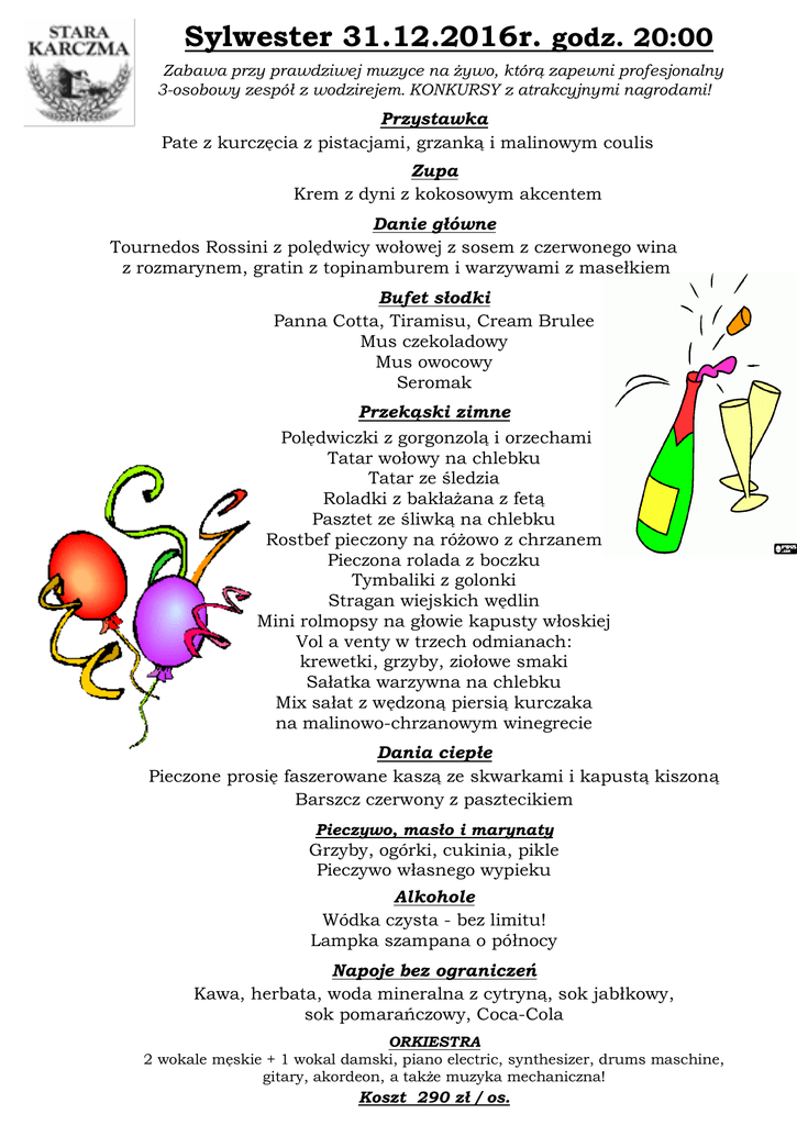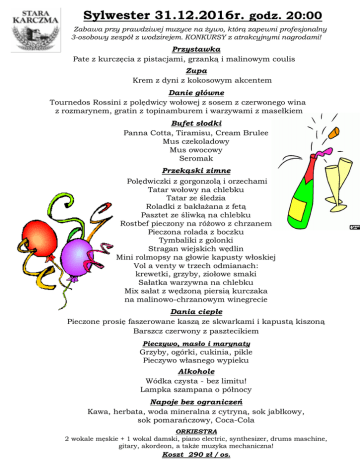 Sylwester 31.12.2016r. godz. 20:00 Zabawa przy prawdziwej muzyce na żywo, którą zapewni profesjonalny 3-osobowy zespół z wodzirejem. KONKURSY z atrakcyjnymi nagrodami! Przystawka Pate z kurczęcia z pistacjami, grzanką i malinowym coulis Zupa Krem z dyni z kokosowym akcentem Danie główne Tournedos Rossini z polędwicy wołowej z sosem z czerwonego wina z rozmarynem, gratin z topinamburem i warzywami z masełkiem Bufet słodki Panna Cotta, Tiramisu, Cream Brulee Mus czekoladowy Mus owocowy Seromak Przekąski zimne Polędwiczki z gorgonzolą i orzechami Tatar wołowy na chlebku Tatar ze śledzia Roladki z bakłażana z fetą Pasztet ze śliwką na chlebku Rostbef pieczony na różowo z chrzanem Pieczona rolada z boczku Tymbaliki z golonki Stragan wiejskich wędlin Mini rolmopsy na głowie kapusty włoskiej Vol a venty w trzech odmianach: krewetki, grzyby, ziołowe smaki Sałatka warzywna na chlebku Mix sałat z wędzoną piersią kurczaka na malinowo-chrzanowym winegrecie Dania ciepłe Pieczone prosię faszerowane kaszą ze skwarkami i kapustą kiszoną Barszcz czerwony z pasztecikiem Pieczywo, masło i marynaty Grzyby, ogórki, cukinia, pikle Pieczywo własnego wypieku Alkohole Wódka czysta - bez limitu! Lampka szampana o północy Napoje bez ograniczeń Kawa, herbata, woda mineralna z cytryną, sok jabłkowy, sok pomarańczowy, Coca-Cola ORKIESTRA 2 wokale męskie + 1 wokal damski, piano electric, synthesizer, drums maschine, gitary, akordeon, a także muzyka mechaniczna! Koszt 290 zł / os.