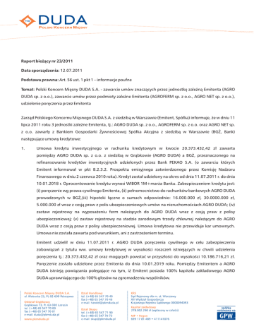 Raport bieżący nr 23/2011 Data sporządzenia: 12.07.2011 Podstawa prawna: Art. 56 ust. 1 pkt 1 – informacje poufne Temat: Polski Koncern Mięsny DUDA S.A. - zawarcie umów znaczących przez jednostkę zależną Emitenta (AGRO DUDA sp. z o.o.), zawarcie umów przez podmioty zależne Emitenta (AGROFERM sp. z o.o., AGRO NET sp. z o.o.), udzielenie poręczenia przez Emitenta Zarząd Polskiego Koncernu Mięsnego DUDA S.A. z siedzibą w Warszawie (Emitent, Spółka) informuje, że w dniu 11 lipca 2011 roku 3 jednostki zależne Emitenta, tj.: AGRO DUDA sp. z o.o., AGROFERM sp. z o.o. oraz AGRO NET sp. z o.o. zawarły z Bankiem Gospodarki Żywnościowej Spółka Akcyjna z siedzibą w Warszawie (BGŻ, Bank) następujące umowy kredytowe: 1. Umowa kredytu inwestycyjnego w rachunku kredytowym w kwocie 20.373.432,42 zł zawarta pomiędzy AGRO DUDA sp. z o.o. z siedzibą w Grąbkowie (AGRO DUDA) a BGŻ, przeznaczonego na refinansowanie kredytów inwestycyjnych udzielonych przez Bank PEKAO S.A. (o zawarciu których Emitent informował w pkt 8.2.3.2. Prospektu emisyjnego zatwierdzonego przez Komisję Nadzoru Finansowego w dniu 2 czerwca 2010 roku). Kredyt został udzielony na okres od dnia 11.07.2011 r. do dnia 10.01.2018 r. Oprocentowanie kredytu wynosi WIBOR 1M+marża Banku. Zabezpieczeniem kredytu jest: (i) poręczenie wg prawa cywilnego Emitenta, (ii) pełnomocnictwo do rachunków bankowych AGRO DUDA prowadzonych w BGŻ,(iii) hipoteki łączne o sumach odpowiednio: 16.000.000 zł, 30.0000.000 zł, 5.000.000 zł wraz z cesją praw z polis ubezpieczeniowych umów na nieruchomościach AGRO DUDA; (iv) zastaw rejestrowy na wyposażeniu ferm należących do AGRO DUDA wraz z cesją praw z polisy ubezpieczeniowej; (v) zastaw rejestrowy na stadzie zarodowym trzody chlewnej należącym do AGRO DUDA wraz z cesją praw z polisy ubezpieczeniowej. Umowa kredytowa nie przewiduje kar umownych. Umowa nie została zawarta pod warunkiem, ani z zastrzeżeniem terminu. Emitent udzielił w dniu 11.07.2011 r. AGRO DUDA poręczenia cywilnego w celu zabezpieczenia zobowiązań z tytułu ww. umowy kredytowej w wysokości roszczeń istniejących w chwili udzielenia poręczenia tj.: 20.373.432,42 zł oraz mogących powstać w przyszłości do wysokości 10.186.716,21 zł. Poręczenie zostało udzielone przez Emitenta do dnia 10.01.2019 roku. Pomiędzy Emitentem a AGRO DUDA istnieją powiązania polegające na tym, iż Emitent posiada 100% kapitału zakładowego AGRO DUDA uprawniającego do 100% głosów na zgromadzeniu wspólników. 2. Umowa kredytu obrotowego w rachunku bieżącym do kwoty 18.300.000 zł zawarta pomiędzy AGRO DUDA a BGŻ na okres 12 miesięcy, z przeznaczeniem na finansowanie działalności bieżącej od dnia 11.07.2011, z zastrzeżeniem, że kredyt nie może być wykorzystany do sfinansowania opcji Buy Back umowy restrukturyzacyjnej (Układ naprawczy z dnia 24 lipca 2009 pomiędzy PKM DUDA S.A. a wierzycielami). Oprocentowanie kredytu wynosi WIBOR 1M+marża Banku. Zabezpieczeniem kredytu jest: (i) poręczenie wg prawa cywilnego Emitenta, (ii) pełnomocnictwo do rachunków bankowych AGRO DUDA prowadzonych w BGŻ,(iii) hipoteki o sumach odpowiednio: 16.000.000 zł, 30.0000.000 zł, wraz z cesją praw z polis ubezpieczeniowych umów na nieruchomościach AGRO DUDA. Umowa kredytowa nie przewiduje kar umownych. Umowa nie została zawarta pod warunkiem, ani z zastrzeżeniem terminu. Emitent udzielił w dniu 11.07.2011 r. AGRO DUDA poręczenia cywilnego w celu zabezpieczenia zobowiązań z tytułu ww. umowy kredytowej w wysokości roszczeń istniejących w chwili udzielenia poręczenia tj.: 18.300.000 zł oraz mogących powstać w przyszłości do wysokości 9.150.000 zł. Poręczenie zostało udzielone przez Emitenta do dnia 10.07.2013 roku. Pomiędzy Emitentem a AGRO DUDA istnieją powiązania polegające na tym, iż Emitent posiada 100% kapitału zakładowego AGRO DUDA uprawniającego do 100% głosów na zgromadzeniu wspólników. Umowy kredytowe wskazane w pkt. 1 i 2 powyżej zostały uznane za znaczące ze względu na fakt, że ich łączna wartość przekracza 10% kapitałów własnych Emitenta. 3. Umowa kredytu inwestycyjnego w rachunku kredytowym w kwocie 13.235.200 zł zawarta pomiędzy AGROFERM sp. z o.o. z siedzibą w Grąbkowie (AGROFERM) a BGŻ, przeznaczonego na refinansowanie kredytów inwestycyjnych udzielonych przez Bank PEKAO S.A. (o zawarciu których Emitent informował w pkt 8.2.3.2. Prospektu emisyjnego zatwierdzonego przez Komisję Nadzoru Finansowego w dniu 2 czerwca 2010 roku). Kredyt został udzielony na okres od dnia 11.07.2011 r. do dnia 10.01.2018 r. Oprocentowanie kredytu wynosi WIBOR 1M+marża Banku. Zabezpieczeniem kredytu jest: (i) poręczenie wg prawa cywilnego Emitenta, (ii) pełnomocnictwo do rachunków bankowych AGROFERM prowadzonych w BGŻ,(iii) hipoteka łączna o sumie 25.000.000 zł wraz z cesją praw z polis ubezpieczeniowych umów na nieruchomości AGROFERM. Umowa kredytowa nie przewiduje kar umownych. Umowa nie została zawarta pod warunkiem, ani z zastrzeżeniem terminu. Emitent udzielił w dniu 11.07.2011 r. AGROFERM poręczenia cywilnego w celu zabezpieczenia zobowiązań z tytułu ww. umowy kredytowej w wysokości roszczeń istniejących w chwili udzielenia poręczenia tj.: 13.235.200 zł oraz mogących powstać w przyszłości do wysokości 6.617.600 zł. Poręczenie zostało udzielone przez Emitenta do dnia 10.01.2019 roku. Pomiędzy Emitentem a AGROFERM istnieją powiązania polegające na tym, iż Emitent posiada 100% kapitału zakładowego AGROFERM uprawniającego do 100% głosów na zgromadzeniu wspólników. 4. Umowa kredytu obrotowego w rachunku bieżącym do kwoty 3.300.000 zł zawarta pomiędzy AGROFERM a BGŻ na okres 12 miesięcy z przeznaczeniem na finansowanie działalności bieżącej od dnia 11.07.2011, z zastrzeżeniem, że kredyt nie może być wykorzystany do sfinansowania opcji Buy Back umowy restrukturyzacyjnej (Układ naprawczy z dnia 24 lipc