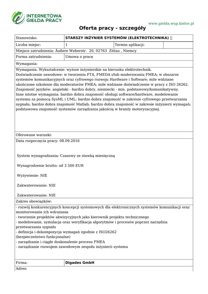 Oferta pracy - szczegóły www.gielda.wup.kielce.pl Stanowisko: STARSZY INŻYNIER SYSTEMÓW (ELEKTROTECHNIKA) Liczba miejsc: 1 Termin aplikacji: Miejsce zatrudnienia: Äußere Weberstr. 20, 02763 Zittau , Niemcy Forma zatrudnienia: Umowa o pracę Wymagania: Wymagania: Wykształcenie: wyższe inżynierskie na kierunku elektrotechnik. Doświadczenie zawodowe: w tworzeniu FTA, FMEDA i/lub moderowaniu FMEA; w obszarze systemów komunikacyjnych oraz cyfrowego rozwoju Hardware i Software; mile widziane ukończone szkolenie dla moderatorów FMEA; mile widziane doświadczenie w pracy z ISO 26262. Znajomość języków: angielski - bardzo dobry, niemiecki - min. podstawowy/komunikatywny. Inne istotne wymagania: bardzo dobra znajomość obsługi software/hardware, modelowanie systemu za pomocą SysML i UML; bardzo dobra znajomość w zakresie cyfrowego przetwarzania sygnału; bardzo dobra znajomość Matlab; bardzo dobra znajomość w zakresie inżynierii wymagań; podstawowa znajomość systemów zarządzania jakością w branży motoryzacyjnej. Oferowane warunki: Data rozpoczęcia pracy: 08.09.2016 System wynagradzania: Czasowy ze stawką miesięczną Wynagrodzenie brutto: od 3 500 EUR Wyżywienie: NIE Zakwaterowanie: NIE Zakwaterowanie: NIE Zakres obowiązków: - rozwój konkurencyjnych koncepcji systemowych dla elektronicznych systemów komunikacji oraz monitorowanie ich wdrażania - tworzenie projektów akwizycyjnych jako kierownik projektu technicznego - modelowanie, symulacja oraz weryfikacja algorytmów i procesów poprzez narzędzia przetwarzania sygnału - definicja i dekompozycja wymagań zgodnie z ISO26262 (bezpieczeństwo funkcjonalne) - zarządzanie i ciągłe doskonalenie procesu FMEA - zarządzanie rozwojem zawodowym zespołu inżynierii systemu Firma: Adres: Digades GmbH Telefon: Adres email: Adres www: Adres www: Informacje kontaktowe: Pani Anja Fey 0049 358 357 757 10 Język aplikacji: niemiecki Sposób aplikowania: bezpośrednio do pracodawcy Sposób przekazania dokumentów: Na adres e-mail: [email protected] W tytule proszę wpisać: „Senior Systemingenieur/-in” Wymagane dokumenty: CV, kserokopie dyplomów, świadectw Uwagi: Identyfikator oferty: 10000-1138244581-S Instytucja koordynująca ofertę: Dolnośląski Wojewódzki Urząd Pracy Filia we Wrocławiu Urząd Pracy dokłada wszelkich starań, aby oferty pracy będące w zasobach urzędu, były rzetelne i wiarygodne. Ponieważ wszystkie oferty pracy pochodzą od osób trzecich Urząd Pracy zastrzega, że odpowiedzialność za ewentualne rozbieżności pomiędzy warunkami pracy zaprezentowanymi w niniejszej ofercie a warunkami zaproponowanymi przez potencjalnego pracodawcę ponosi pracodawca.