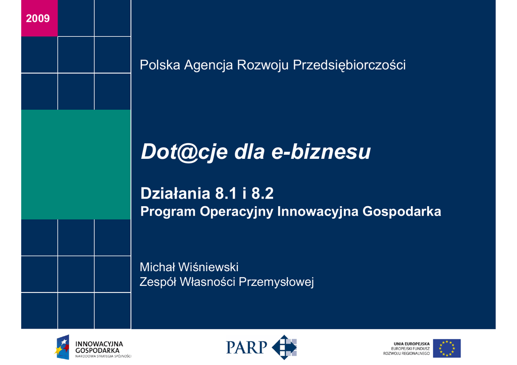 2009 2009 Polska Agencja Rozwoju Przedsiębiorczości Dot@cje dla e-biznesu Działania 8.1 i 8.2 Program Operacyjny Innowacyjna Gospodarka Michał Wiśniewski Zespół Własności Przemysłowej Środki na wsparcie e-biznesu w ramach Programu Operacyjnego Innowacyjna Gospodarka 8. Oś Priorytetowa: Społeczeństwo informacyjne – zwiększanie innowacyjności gospodarki Działanie 8.1: Wspieranie działalności gospodarczej w dziedzinie gospodarki elektronicznej Alokacja na lata 2007 - 2013 to € 385 635 294,00. Działanie 8.2: Wspieranie wdrażania elektronicznego biznesu typu B2B Alokacja na lata 2007 - 2013 to € 460 817 882,00. 2 Działanie 8.1 PO IG – dla kogo ? mikro- i małe firmy prowadzące działalność gospodarczą nie dłużej niż 1 rok od dnia rejestracji z różnych branż, o różnych specjalnościach, niekoniecznie posiadający wiedzę i zasoby IT z pomysłem na rokujący sukces e-biznes oparty na modelu świadczenia e-usługi liczą się nowe pomysły, zapełnianie istniejących nisz i potrzeb – a nie klonowanie znanych modeli 3 Działanie 8.1 PO IG – definicja e-usługi Przez e-usługę* należy rozumieć usługę świadczoną: w sposób zautomatyzowany przez użycie technologii informacyjnych, za pomocą systemów teleinformatycznych w publicznych sieciach telekomunikacyjnych, na indywidualne żądanie usługobiorcy, bez jednoczesnej obecności stron w tej samej lokalizacji. *Szczegółową definicję e-uslugi zawiera rozporządzenie Ministra Rozwoju Regionalnego z dnia 13 sierpnia 2008 r. w sprawie udzielania przez Polską Agencję Rozwoju Przedsiębiorczości pomocy finansowej na wspieranie tworzenia i rozwoju gospodarki elektronicznej w ramach Programu Operacyjnego Innowacyjna Gospodarka, 2007-2013 (Dz. U. Nr 153, poz. 956 z późn. zm.) 4 Działanie 8.1 PO IG – na co? Usługi informatyczne, techniczne, doradcze, itp. Środki trwałe, wartości niematerialne i prawne Wynagrodzenia, szkolenia pracowników Inne usługi eksperckie (np. księgowe, prawne) Najem i eksploatacja pomieszczeń inne koszty ogólne (Internet, mat. biurowe, itp) Promocja biznesu i projektu 5 Działanie 8.1 PO IG – ile dla firmy? Max: równowartość 200 000 euro Max: refundacja 85% wartości projektu Wydatki kwalifikowane: od 20 tys. do 1 mln zł Finansowanie do 24 miesięcy działalności Jedna dotacja na jedną firmę! 6 Działanie 8.1 PO IG – jak się przygotować ? rzetelnie opisany model biznesowy (kto płaci?) określenie grup docelowych rzetelnie opisana konstrukcja e-usługi rzetelnie przewidziane wydatki uzasadnienie rentowności, rzetelne prognozy wskaźniki (przemyślane zobowiązania) strategia promocji e-biznesu wizja biznesu na następne 3 lata (trwałość) 7 W działaniu 8.1 PO IG wsparciu nie podlegają projekty mające na celu: obrót handlowy produktami (e-handel produktami, także cyfrowymi !!!), świadczenie usług poczty elektronicznej, świadczenie usług związanych z hostingiem (konta WWW); świadczenie usług związanych z rejestracją i utrzymaniem domen internetowych. 8 Działanie 8.2 PO IG – idea przewodnia wdrażanie w firmach najnowocześniejszych technologii informatyczno-komunikacyjnych (ICT), umożliwiających podejmowanie współpracy z bardziej zaawansowanymi technologicznie firmami lub skuteczniejsze konkurowanie z przedsiębiorstwami opierającymi swój biznes na tego rodzaju technologiach, zarówno na terenie Polski jak i za granicą. 9 Działanie 8.2 PO IG – dla kogo ? mikro-, małe i średnie firmy (MSP) posiadające umowy o współpracy z co najmniej 2 innymi firmami, planujące rozpoczęcie lub rozwój współpracy biznesowej w oparciu o rozwiązania elektroniczne, w celu umożliwienia automatyzacji wymiany informacji między systemami informatycznymi współpracujących przedsiębiorstw (automatyzacja procesów biznesowych) 10 Działanie 8.2 PO IG – typowy projekt MSP producent (wnioskodawca) dostawcy, podwykonawcy dystrybutorzy klienci, odbiorcy ostateczni 11 Działanie 8.2 PO IG – na co? Środki trwałe, wartości niematerialne i prawne !!! Usługi informatyczne, techniczne, wdrożeniowe Wynagrodzenia, szkolenia specjalistyczne pracowników Informacja o udziale środków UE Inne niezbędne usługi doradcze, eksperckie, itp.* * zwłaszcza w zakresie re-inżynierii procesów biznesowych, reorganizacji przedsiębiorstw, wydzielania funkcji, wydzielania zadań oraz tworzenia wirtualnych przedsiębiorstw 12 Działanie 8.2 PO IG – ile na projekt? Dotacja od 20 tys. do 2 mln zł na projekt Max 70% na nową inwestycję (pomoc regionalna) 50% - usługi doradcze i eksperckie 85% - wynagrodzenia i promocja Max 45% - szkolenia pracowników 13 Konkursy ogłoszone w 2008 r. Działanie Termin konkursu Wartość alokacji na konkurs (od - do) 8.1 15.09.2008 - 26.09.2008 123 646 000,00 zł 8.2 15.09.2008 - 15.10.2008 73 876 000,00 zł Konkursy rozpoczynające się w 2009 r. Działanie Termin konkursu Wartość alokacji na konkurs (od - do) 8.1 02.03.2009 - 05.03.2009 140 901 760,00 zł 31.08.2009 - 14.09.2009 € 64 268 823,50 8.1 8.2 09.03.2009 - 03.04.2009 168 345 600,00 zł 15.06.2009 - 03.07.2009 € 38 402 235,25 8.2 05.10.2009 - 23.10.2009 € 38 402 235,25 8.2 Pomimo przekroczenia alokacji, wszystkie wnioski, które pozytywnie przejdą ocenę merytoryczną, będą rekomendowane do dofinansowania. 14 Liczba i wartość wniosków złożonych w 2008 roku. województwo dolnośląskie kujawsko-pomorskie lubelskie lubuskie łódzkie małopolskie mazowieckie opolskie podkarpackie podlaskie pomorskie śląskie świętokrzyskie warmińsko-mazurskie wielkopolskie zachodniopomorskie suma działanie 8.1 działanie 8.2 liczba wniosków wartość wniosków liczba wniosków wartość wniosków 34 13 296 933,65 zł 20 7 409 903,88 zł 12 5 060 669,50 zł 11 7 963 136,23 zł 9 2 831 836,42 zł 11 3 497 415,16 zł 5 964 499,00 zł 4 2 215 465,00 zł 18 5 765 553,69 zł 12 5 863 163,40 zł 60 26 557 602,99 zł 23 101 866,49 zł 50 72 806 905,32 zł 30 19