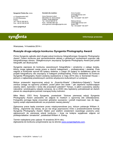 Syngenta Polska Sp. z o.o. Kontakt dla mediów: ul. Powązkowska 44C 01-979 Warszawa Polska Tel: +48 22 326 06 01 Fax: +48 22 326 06 99 Anna Gancarz-Luboń Menedżer ds. Komunikacji Polska i Kraje Bałtyckie Tel. +48 22 326 05 75 Kom. +48 692 468 152 [email protected] www.syngenta.pl Anna Cusden [email protected] Sutton PR Tel. +44 (0)207 183 3577 Melissa Emery [email protected] Sutton PR Tel. +44 (0)207 183 3577 Informacja prasowa Warszawa, 14 kwietnia 2014 r. Ruszyła druga edycja konkursu Syngenta Photography Award Firma Syngenta ogłosiła start drugiej edycji konkursu fotograficznego Syngenta Photography Award. Celem konkursu jest sprowokowanie debaty o globalnych wyzwaniach poprzez siłę fotograficznego obrazu. Ubiegłorocznym zwycięzcą Syngenta Photography Award jest polski fotografik Jan Brykczyński. Syngenta zaprasza do konkursu zawodowych fotografików i amatorów z całego świata, którzy mogą zgłaszać swoje prace w dwóch kategoriach – profesjonalnej i otwartej. Pula nagród w konkursie wynosi 65 tysięcy dolarów, z czego 25 tysięcy to dodatkowy grant na projekt fotograficzny dla zwycięzcy w kategorii profesjonalnej. Prace nadesłane na konkurs Syngenta Photography Award zostaną wystawione w maju 2015 roku w Somerset House – jednym z najbardziej prestiżowych centrów artystyczno-kulturalnych w Londynie. Motyw przewodni tegorocznej edycji to „Scarcity-Waste” („Niedobory-Odpady”). Temat zwraca uwagę na ogromny problem, przed jakim stoi świat – jak zapewnić wystarczające zasoby ziemi, żywności i wody dla przyszłych pokoleń? Tempo, w jakim zużywamy zasoby naturalne i produkujemy odpady oznacza, że w 2030 roku będziemy potrzebowali aż dwóch planet do zaspokojenia potrzeb rosnącej liczby ludności. Mike Mack, CEO firmy Syngenta, powiedział: “Sukces pierwszej edycji Syngenta Photography Award udowodnił, że zdjęcie to medium o ogromnej sile oddziaływania. Fotografia pomaga lepiej zrozumieć globalne wyzwania i potrafi inspirować nas do tego, byśmy wzięli odpowiedzialność za przyszłość naszej planety”. Zgłoszone prace będą oceniane przez międzynarodowe jury, którym pokieruje William A. Ewing. „Ogromnie się cieszę, że po raz drugi poproszono mnie o przewodniczenie komisji Syngenta Photography Award. Byłem pod wielkim wrażeniem wysokiego poziomu prac zgłoszonych do pierwszej edycji konkursu i liczę na kolejne wyjątkowe zdjęcia od profesjonalistów i amatorów”, powiedział William A. Ewing. Termin nadsyłania prac upływa 15 września 2014 roku. Zgłoszenia do konkursu przyjmowane są na stronie www.syngentaphoto.com. Syngenta – 14.04.2014 / strona 1 z 2 Kategoria profesjonalna (Professional Commission) przeznaczona jest dla osób, które większość swoich dochodów czerpią z fotografii. Zawodowi fotograficy mogą składać od 5 do 10 prac oraz propozycję wykonania projektu fotograficznego powiązanego z tematem „Scarcity-Waste” („Niedobory-Odpady”). Kategoria otwarta (Open Competition) przeznaczona jest zarówno dla osób zawodowo zajmujących się fotografią, jak i dla amatorów. W ramach tej kategorii można nadesłać od jednej do trzech prac nawiązujących do motywu „Scarcity-Waste” („Niedobory-Odpady”). Ogłoszenie zwycięzców Syngenta Photography Award odbędzie się podczas uroczystej ceremonii w marcu 2015 roku. Jury konkursu Syngenta Photography Award: William A. Ewing (Przewodniczący) – kurator, fotografik, dyrektor projektów w Thames & Hudson Publishing (Kanada) Iatã Cannabrava – fotografik (Brazylia) Stephen Dunbar-Johnson – prezes International New York Times (Wielka Brytania) Ekaterina Inozemtseva – główny kurator w Muzeum Sztuk Multimedialnych (Rosja) Marcus Lyon – fotografik (Wielka Brytania) Mike Mack – prezes zarządu firmy Syngenta (Stany Zjednoczone) Liu Heung Shing – fotografik i fotoedytor (Chiny) Doradcy w kategorii otwartej: Simon Roberts – fotografik (Wielka Brytania) Malu Halasa – redaktor (Jordania / Filipiny) *** Syngenta Photography Award to konkurs fotograficzny, którego pierwsza edycja ogłoszona została w 2012 roku. Fotograficy z całego świata nadesłali wówczas 2500 prac nawiązujących do tematu „Rural-Urban” („Wieś-Miasto”). W konkursie zwyciężył polski fotografik Jan Brykczyński. Wystawa poświęcona pierwszej edycji Syngenta Photography Award dostępna jest na stronie http://ruralurban.syngentaphoto.com Syngenta jest jedną z wiodących na świecie firm, zatrudniającą w ponad 90 krajach przeszło 28 tysięcy pracowników oddanych wspólnemu celowi: Uwalniamy potencjał roślin. Dzięki światowej klasy badaniom naukowym, globalnemu zasięgowi i zaangażowaniu na rzecz naszych klientów, pomagamy zwiększyć wysokość plonów, chronić środowisko naturalne oraz wpływać na poprawę zdrowia i jakości życia. Więcej informacji o firmie dostępnych jest na stronie www.syngenta.com. Syngenta – 14.04.2014 / strona 2 z 2