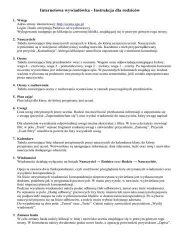 Internetowa wywiadówka - Instrukcja dla rodziców 1. Wstęp Adres strony internetowej: http://ocena.zgo.pl Login i hasło otrzymają Państwo od wychowawcy. Wylogowanie następuje po kliknięciu czerwonej kłódki, znajdującej się w prawym górnym rogu strony. 2. Nauczyciele Tabela zawierająca listę nauczycieli uczących w klasie, do której uczęszcza uczeń. Nauczyciele wymienieni są w kolejności alfabetycznej według nazwisk. Każdemu z nich przyporządkowany jest przycisk „Konsultacje”, którego kliknięcie umożliwia zapoznanie się z terminem konsultacji. 3. Oceny Tabela zawierająca listę przedmiotów wraz z ocenami. Wagom ocen odpowiadają następujące kolory: waga 4 – czerwony, waga 3 – pomarańczowy, waga 2 – zielony, waga 1 – czarny. Po najechaniu kursorem na ocenę wyświetlana jest informacja zawierająca opis. W pozostałych kolumnach znajdują się: średnia ważona wyliczona na podstawie otrzymanych ocen oraz ocena semestralna, jeśli została zaproponowana przez nauczyciela. 4. Oceny z zachowania Tabela zawierająca oceny z zachowania wystawione w ramach poszczególnych przedmiotów. 5. Plan zajęć Plan lekcji dla klasy, do której przypisany jest uczeń. 6. Uwagi Lista uwag otrzymanych przez ucznia. Rodzic ma możliwość przekazania informacji o zapoznaniu się z uwagą (przycisk „Zapoznałem/łam się”) oraz wysłać wiadomość do nauczyciela, który uwagę napisał. Dla ułatwienia wyszukania odpowiedniej uwagi można skorzystać z filtra. W tym celu należy rozwinąć filtr, w pole „Treść” wpisać fragment szukanej uwagi i zatwierdzić przyciskiem „Zastosuj”. Przycisk „Usuń filtry” umożliwia powrót do listy wszystkich uwag. 7. Kalendarz Tabela zawierająca listę zdarzeń przypisanych przez nauczycieli do kalendarza klasy, do której przypisany jest uczeń. Wyświetlone są następujące informacje: data zdarzenia, treść oraz imię i nazwisko nauczyciela dodającego zdarzenie. 8. Wiadomości Wiadomości działają wyłącznie na liniach Nauczyciel → Rodzice oraz Rodzic → Nauczyciele. Opcja ta zawiera dwie funkcjonalności, czyli możliwość przeglądania listy otrzymanych wiadomości oraz wysyłanie korespondencji. Na liście otrzymanych wiadomości korespondencja nieprzeczytana wyświetlana jest wytłuszczonym drukiem, podobnie jak w programach pocztowych. W menu przy tytule, w nawiasie, wyświetlana jest ilość nieprzeczytanych korespondencji. Podczas wysyłania wiadomości należy podać odbiorcę (lub odbiorców), temat oraz treść wiadomości. Po wpisaniu w polu „Dodaj odbiorcę” pierwszych trzy litery imienia lub nazwiska nauczyciela pojawia się podpowiedź mająca na celu wyeliminowanie błędów w dostarczaniu korespondencji. Po wyborze nauczyciel pojawia się na liście odbiorców, a rodzic może wybrać kolejnego adresata. Do wypełnienia są dwa pola: „Temat” oraz „Treść”. Całość należy zatwierdzić przyciskiem „Wyślij wiadomość”. 9. Zmiana hasła W celu zmiany hasła należy kliknąć w imię i nazwisko ucznia znajdujące się w prawym górnym rogu strony. W formularzu należy dwukrotnie podać nowe hasło, a operację potwierdzić przyciskiem „Zapisz”.