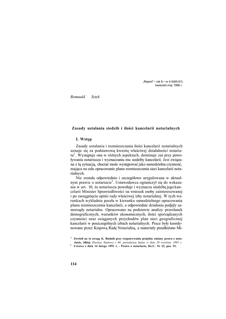 „Rejent" • rok 6 • nr 4-5(60-61) kwiecień-maj 1996 r. Romuald Sztyk Zasady ustalania siedzib i ilości kancelarii notarialnych I. Wstęp Zasady ustalania i rozmieszczania ilości kancelarii notarialnych uznaje się za podstawową kwestię właściwej działalności notariatu 1 . Występuje ona w różnych aspektach, dominuje zaś przy powoływaniu notariusza i wyznaczaniu mu siedziby kancelarii. Jest związana z tą sytuacją, chociaż może występować jako samodzielna czynność, mająca na celu opracowanie planu rozmieszczenia sieci kancelarii notarialnych. Nie została odpowiednio i szczegółowo uregulowana w aktualnym prawie o notariacie2. Ustawodawca ograniczył się do wskazania w art. 10, że notariusza powołuje i wyznacza siedzibę jego kancelarii Minister Sprawiedliwości na wniosek osoby zainteresowanej i po zasięgnięciu opinii rady właściwej izby notarialnej. W tych warunkach wykładnia poszła w kierunku samodzielnego opracowania planu rozmieszczenia kancelarii, a odpowiednie działania podjęły samorządy notarialne. Opracowano na podstawie analizy przesłanek demograficznych, warunków ekonomicznych, ilości sporządzanych czynności oraz osiąganych przychodów plan sieci geograficznej kancelarii w poszczególnych izbach notarialnych. Prace były koordynowane przez Krajową Radę Notarialną, a materiały przedłożono Mi1 2 Zwrócił na to uwagę K. Budnik przy rozpatrywaniu projektu zmiany prawa o notariacie, bliżej: Diariusz Sejmowy z 60. posiedzenia Sejmu w dniu 20 września 1995 r. Ustawa z dnia 14 lutego 1991 r. - Prawo o notariacie, Dz.U. Nr 22, poz. 91. 114 Zasady ustalania siedzib i ilości kancelarii notarialnych nisterstwu Sprawiedliwości. Projekty te spotkały się z krytyczną oceną, jako że nie przedłożono materiałów źródłowych, które były podstawą dokonanych ustaleń. W większości przypadków dotyczyły one najbliższych lat, z możliwością weryfikacji. Uwzględniono istniejące rezerwy kadrowe - asesorów i aplikantów notarialnych. Na podstawie tych badań dokonano naboru aplikantów notarialnych jako naturalnego zaplecza notariuszy. Opracowania te obejmowały zatem wszystkie elementy, które są wykorzystywane przez notariaty Europy Zachodniej przy opracowaniu planu rozmieszczania kancelarii notarialnych. Przy okazji zajmowania stanowiska w zakresie powoływania notariuszy uzasadniono swoje opinie danymi wynikającymi z tego planu. W przypadkach drastycznych, a szczególnie wtedy, gdy argumentacja nie była uwzględniona, samorządy notarialne w imię samoobrony swojej pozycji stosowały środki, które zostały uznane za nie znajdujące oparcia w pozytywnych normach prawnych. Polegały na podejmowaniu uchwał o wstrzymaniu opiniowania kandydatów na notariuszy do czasu opracowania planu sieci kancelarii notarialnych. Inny przypadek omawia art. 22 prawa o notariacie, postanawiając, że w razie zaprzestania prowadzenia kancelarii notarialnej przez notariusza lub zawieszenia go w czynnościach, rada właściwej izby notarialnej wyznacza czasowo do pełnienia obowiązku notariusza zastępcę spośród asesorów danej izby. Powołane przepisy nie regulują szeregów problemów stąd wynikających. Trudno za nie uznać postanowienie § 11 rozporządzenia Ministra Sprawiedliwości3 w sprawie nadzoru, w którym w pkt 4 określa się, że czynności nadzorcze Ministerstwa Sprawiedliwości polegają m.in. na ustalaniu planu siedzib kancelarii notarialnych. Przepis ten nie znajduje uzasadnienia w delegacji ustawowej, jako że został wydany na podstawie art. 42 § 2 prawa o notariacie mówiącego o trybie wykonywania nadzoru nad działalnością notariuszy i organami samorządu notarialnego. 3 Rozporządzenie Ministra Sprawiedliwości z dnia 30 kwietnia 1991 r. w sprawie trybu wykonywania nadzoru nad działalnością notariuszy i organów samorządu notarialnego, Dz.U. Nr 42, poz. 188. 115 Romuald Sztyk Prawodawca całą uwagę skoncentrował w tym przedmiocie na przepisach wprowadzających. Jak można domniemywać, sądził, iż będą one wystarczające, zaś wykładnia przepisów prawa o notariacie wykształci odpowiednią praktykę. Artykuł 7 § 2 przepisów wprowadzających4 przewidywał zasady wyznaczania siedzib kancelarii notarialnych na podstawie wniosków złożonych przez notariuszy zatrudnionych w państwowych biurach notarialnych. Przewidziano także możliwość wyznaczenia notariuszowi siedziby kancelarii notarialnej w innej, pobliskiej miejscowości w tym samym województwie, o ile wniosek taki w tej samej miejscowości złożyło kilku notariuszy. Wyznaczenie siedziby następowało po zasięgnięciu opinii rady właściwej izby notarialnej. Jak z tego wynika, przepisy w sposób ogólnikowy regulują ten problem. W tych warunkach należy przypomnieć, że był on dokładniej omówiony w poprzednich regulacjach prawa o notariacie i w sposób wyczerpujący przewidywał wszystkie sytuacje, które mogą wystąpić w praktyce. II. Poprzednie regulacje prawne Prawo o notariacie z 1933 r.5 w art. 2 stwierdzało, że liczbę notariuszy oraz ich siedziby w okręgu każdego sądu okręgowego określa Minister Sprawiedliwości w drodze rozporządzeń. Notariusz wykonywał swe czynności w okręgu sądu okręgowego, w którym miał siedzibę, bez względu na miejsce zamieszkania stron i położenie miejscowości, których dana czynność dotyczyła. Czynności dokonane przez notariusza poza okręgiem tegoż sądu nie miały mocy notarialnej. Klauzula ta w sposób kategoryczny zakreślała właściwość miejscową i skutki prawne jej przekroczenia. Dotyczyła wszystkich czynności dokonanych przez notariusza w formie notarialnej 6 . 4 5 6 Ustawa z dnia 14 lutego 1991 r. - Przepisy wprowadzające ustawę - Prawo o notariacie oraz o zmianie Kodeksu postępowania cywilnego i ustawy o księgach wieczystych, Dz.U. Nr 22, poz. 92. Rozporządzenie Prezydenta Rzeczypospolitej z dnia 27 października 1933 r. - Prawo o notariacie, Dz.U