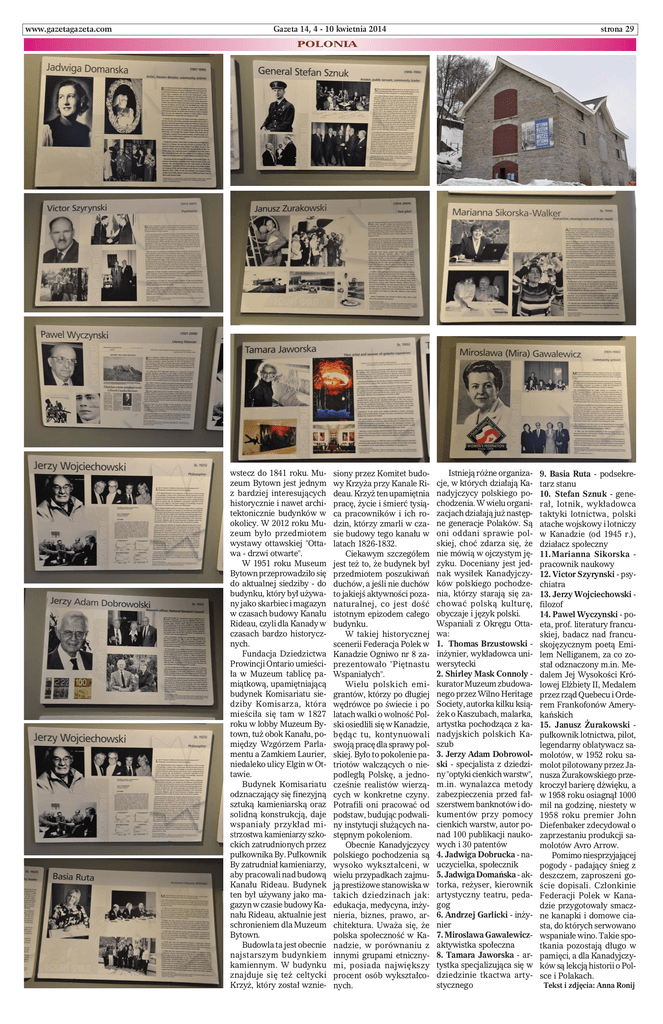 www.gazetagazeta.com Gazeta 14, 4 - 10 kwietnia 2014 strona 29 POLONIA wstecz do 1841 roku. Muzeum Bytown jest jednym z bardziej interesujących historycznie i nawet architektonicznie budynków w okolicy. W 2012 roku Muzeum było przedmiotem wystawy ottawskiej "Ottawa - drzwi otwarte". W 1951 roku Museum Bytown przeprowadziło się do aktualnej siedziby - do budynku, który był używany jako skarbiec i magazyn w czasach budowy Kanału Rideau, czyli dla Kanady w czasach bardzo historycznych. Fundacja Dziedzictwa Prowincji Ontario umieściła w Muzeum tablicę pamiątkową, upamiętniającą budynek Komisariatu siedziby Komisarza, która mieściła się tam w 1827 roku w lobby Muzeum Bytown, tuż obok Kanału, pomiędzy Wzgórzem Parlamentu a Zamkiem Laurier, niedaleko ulicy Elgin w Ottawie. Budynek Komisariatu odznaczający się finezyjną sztuką kamieniarską oraz solidną konstrukcją, daje wspaniały przykład mistrzostwa kamieniarzy szkockich zatrudnionych przez pułkownika By. Pułkownik By zatrudniał kamieniarzy, aby pracowali nad budową Kanału Rideau. Budynek ten był używany jako magazyn w czasie budowy Kanału Rideau, aktualnie jest schronieniem dla Muzeum Bytown. Budowla ta jest obecnie najstarszym budynkiem kamiennym. W budynku znajduje się też celtycki Krzyż, który został wznie- siony przez Komitet budowy Krzyża przy Kanale Rideau. Krzyż ten upamiętnia pracę, życie i śmierć tysiąca pracowników i ich rodzin, którzy zmarli w czasie budowy tego kanału w latach 1826-1832. Ciekawym szczegółem jest też to, że budynek był przedmiotem poszukiwań duchów, a jeśli nie duchów to jakiejś aktywności pozanaturalnej, co jest dość istotnym epizodem całego budynku. W takiej historycznej scenerii Federacja Polek w Kanadzie Ogniwo nr 8 zaprezentowało "Piętnastu Wspaniałych". Wielu polskich emigrantów, którzy po długiej wędrówce po świecie i po latach walki o wolność Polski osiedlili się w Kanadzie, będąc tu, kontynuowali swoją pracę dla sprawy polskiej. Było to pokolenie patriotów walczących o niepodległą Polskę, a jednocześnie realistów wierzących w konkretne czyny. Potrafili oni pracować od podstaw, budując podwaliny instytucji służących następnym pokoleniom. Obecnie Kanadyjczycy polskiego pochodzenia są wysoko wykształceni, w wielu przypadkach zajmują prestiżowe stanowiska w takich dziedzinach jak: edukacja, medycyna, inżynieria, biznes, prawo, architektura. Uważa się, że polska społeczność w Kanadzie, w porównaniu z innymi grupami etnicznymi, posiada największy procent osób wykształconych. Istnieją różne organizacje, w których działają Kanadyjczycy polskiego pochodzenia. W wielu organizacjach działają już następne generacje Polaków. Są oni oddani sprawie polskiej, choć zdarza się, że nie mówią w ojczystym języku. Doceniany jest jednak wysiłek Kanadyjczyków polskiego pochodzenia, którzy starają się zachować polską kulturę, obyczaje i język polski. Wspaniali z Okręgu Ottawa: 1. Thomas Brzustowski inżynier, wykładowca uniwersytecki 2. Shirley Mask Connoly kurator Muzeum zbudowanego przez Wilno Heritage Society, autorka kilku książek o Kaszubach, malarka, artystka pochodząca z kanadyjskich polskich Kaszub 3. Jerzy Adam Dobrowolski - specjalista z dziedziny "optyki cienkich warstw", m.in. wynalazca metody zabezpieczenia przed fałszerstwem banknotów i dokumentów przy pomocy cienkich warstw, autor ponad 100 publikacji naukowych i 30 patentów 4. Jadwiga Dobrucka - nauczycielka, społecznik 5. Jadwiga Domańska - aktorka, reżyser, kierownik artystyczny teatru, pedagog 6. Andrzej Garlicki - inżynier 7. Miroslawa Gawalewiczaktywistka społeczna 8. Tamara Jaworska - artystka specjalizująca się w dziedzinie tkactwa artystycznego 9. Basia Ruta - podsekretarz stanu 10. Stefan Sznuk - generał, lotnik, wykładowca taktyki lotnictwa, polski atache wojskowy i lotniczy w Kanadzie (od 1945 r.), działacz społeczny 11.Marianna Sikorska pracownik naukowy 12. Victor Szyrynski - psychiatra 13. Jerzy Wojciechowski filozof 14. Pawel Wyczynski - poeta, prof. literatury francuskiej, badacz nad francuskojęzycznym poetą Emilem Nelliganem, za co został odznaczony m.in. Medalem Jej Wysokości Królowej Elżbiety II, Medalem przez rząd Quebecu i Orderem Frankofonów Amerykańskich 15. Janusz Żurakowski pułkownik lotnictwa, pilot, legendarny oblatywacz samolotów, w 1952 roku samolot pilotowany przez Janusza Żurakowskiego przekroczył barierę dżwięku, a w 1958 roku osiagnął 1000 mil na godzinę, niestety w 1958 roku premier John Diefenbaker zdecydował o zaprzestaniu produkcji samolotów Avro Arrow. Pomimo niesprzyjającej pogody - padający śnieg z deszczem, zaproszeni goście dopisali. Członkinie Federacji Polek w Kanadzie przygotowały smaczne kanapki i domowe ciasta, do których serwowano wspaniałe wino. Takie spotkania pozostają długo w pamięci, a dla Kanadyjczyków są lekcją historii o Polsce i Polakach. Tekst i zdjęcia: Anna Ronij