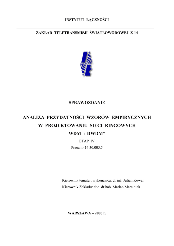 INSTYTUT ŁĄCZNOŚCI ZAKŁAD TELETRANSMISJI ŚWIATŁOWODOWEJ Z-14 SPRAWOZDANIE ANALIZA PRZYDATNOŚCI WZORÓW EMPIRYCZNYCH W PROJEKTOWANIU SIECI RINGOWYCH WDM i DWDM” ETAP IV Praca nr 14.30.005.5 Kierownik tematu i wykonawca: dr inż. Julian Kowar Kierownik Zakładu: doc. dr hab. Marian Marciniak WARSZAWA – 2006 r. SPIS TREŚCI 1. WSTĘP................................................................................................................................... 3 2. WPROWADZENIE ............................................................................................................... 4 2.1. Mechanizm propagacji sygnału optycznego w środowisku dwójłomności. ................... 4 3. MODEL LINII ŚWIATŁOWODOWEJ DLA SYMULACJI KOMPUTEROWEJ.............. 5 3.1. Podsumowanie z przeprowadzonej symulacji komputerowej. ....................................... 6 4. POSTAĆ WZORU EMPIRYCZNEGO I JEGO PRZEZNACZENIE ............................. 8 4.1. Różnicowe opóźnienie grupowe. .................................................................................... 8 5. Wnioski ................................................................................................................................ 11 6. Wykaz literatury................................................................................................................... 12 DOROBEK NAUKOWY dr J. KOWARA Z-14/IL............................................................. 13 1. WSTĘP Zapotrzebowanie na systemy WDM nowej generacji wzrasta w Polsce z każdym dniem. Warto przypomnieć, że w naszym kraju na przestrzeni ostatnich 30 lat zainstalowano w terenie bardzo dużą ilość kabli światłowodowych z dużym zapasem. Podjęcie decyzji o wprowadzeniu w Polsce systemów WDM będzie w pierwszej kolejności wymagało fachowej oceny przydatności zainstalowanych już kabli światłowodowych dla nowych sieci WDM. W związku z tym, przedstawiony materiał w tej pracy będzie przydatny do oceny technicznej zainstalowanych kabli i wskaże kierunek ich weryfikacji. 2. WPROWADZENIE W opracowaniu dokonano analizy wybranych wzorów empirycznych pozwalających na oszacowanie degradacji sygnału użytkowego wywołanej przez PDM oraz oszacowania zasięgu i jakości transmisji wyrażonej przez stopę błędu E-12, korzystając z empirycznych wzorów, co odpowiada stracie mocy (zgodnie z normą ITU-TG691) – 1 dB. Przedstawiony materiał będzie użyteczny przy projektowaniu nowoczesnych struktur optycznych sieci ringowych. 2.1. Mechanizm propagacji sygnału optycznego w środowisku dwójłomności. Zjawisko dyspersji polaryzacyjnej zawdzięczamy dwójłomności współczynnika załamania rdzenia światłowodu. Dwójłomność ta ma charakter niejednorodny wzdłuż światłowodu. To powoduje, że PDM jest również zmienne wzdłuż osi światłowodu. Efektem tego zjawiska jest przypadkowość zmiany PDM wzdłuż światłowodu. W związku z tym w światłowodzie zostają wzbudzone dwa mody poruszające się z różnymi prędkościami (sygnał optyczny, rys. 1). Sygnał optyczny dwóch sprzężonych modów jest znany jako różnica opóźnienia grupowego DGD w [ps] (rys. 1). Opóźnienie grupowe jest więc sposobem najbardziej nadającym się do określenia wywoływanych skutków przez PDM i jest mierzone w [ps] w światłowodzie o długości 1 km. Warto zauważyć, że w światłowodzie w tych warunkach informacja bitowa jest przenoszona przez dwa sprzęgnięte ze sobą mody poruszające się, jeden szybciej, drugi wolniej. W tym czasie część mocy optycznej jest przekazywana przypadkowo z jednego modu do drugiego i odwrotnie, zachowując dowolną przypadkowość. To objawia się w praktyce w postaci skoków sygnału, co zostało uwidocznione na rys. 2 przy symulacji komputerowej i wykonanych pomiarach. 3. MODEL LINII ŚWIATŁOWODOWEJ DLA SYMULACJI KOMPUTEROWEJ Na rysunku 1 przedstawiono model linii światłowodowej dla symulacji komputerowej. W skład modelu tej linii wchodzą dwa światłowody o różnych parametrach wymienionych na rys. 1a i rys. 1b. W obydwu przypadkach „transmitowano” sygnał 10 Gb/s. Przy symulacji komputerowej korzystano z rozkładu prawdopodobieństwa zdarzeń DGD Maxwelliana. 3.1. Podsumowanie z przeprowadzonej symulacji komputerowej. Przeprowadzona została symulacja komputerowa kolejno na obu torach światłowodowych różniących się następującymi parametrami (rys. 1): – Tor „a” DGD = 1 ps nie wprowadził znaczącej degradacji w strukturze sygnału – 10 Gb/s. – W torze „b” Przy DGD = 100 ps wystąpiła znacząca zmiana w kształcie przesyłanych impulsów, począwszy od 0,8 ns do 1,6 ns. Otrzymane wyniki wskazują, że im większe jest DGD, tym większa jest degradacja sygnału użytkowego. Ta degradacja jest przyczyną skoków przedstawionych na wykresie (rys. 2). Wykres na rys. 2 przedstawia wyniki otrzymane z pomiarów eksperymentalnych i symulacji komputerowej i obrazuje częstość straty mocy dB otrzymaną z pomiarów eksperymentalnych Exp. i symulacji komputerowej Sim. w światłowodzie z DGD = 100 ps przy sygnale 10 Gb/s. Rys. 2. Częstość skoków mocy w światłowodzie w funkcji dB z DGD=100 ps przy sygnale 10 Gb/s. Porównanie wyników z symulacji numerycznej z wynikami eksperymentalnymi wykazały wysoką częstość skoków przy danej wartości mocy dla niskich mocy w przedziale od 0,2 dB do 1 dB i niską częstość skoków mocy w przedziale od 1 dB do 1,8 dB. 4. POSTAĆ WZORU EMPIRYCZNEGO I JEGO PRZEZNACZENIE Wraz z rozwojem szerokopasmowych sieci dostępowych WDM obserwuje się tendencje tworzenia w laboratoriach na podstawie wyników badań i przeprowadzonych eksperymentów w ośrodkach badawczych, prostych wzorów w postaci empirycznej (1). Jako kryterium degradacji sygnału przyjęto stratę mocy w danym torze transmisyjnym, odpowiadającej stracie mocy jednego dB. Jest to równoważne stopie błędów 10-12. Przykładem takiego postępowania jest wzór (1) 