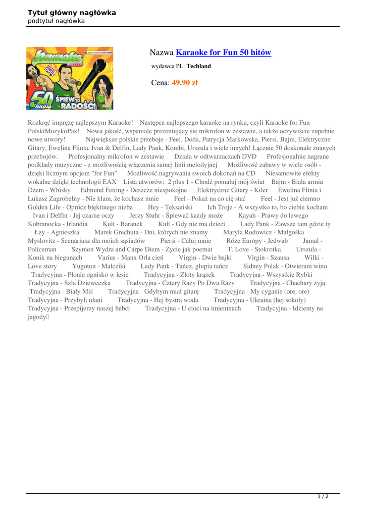 Tytuł główny nagłówka podtytuł nagłówka Nazwa Karaoke for Fun 50 hitów wydawca PL: Techland Cena: 49.90 zł Rozkręć impręzę najlepszym Karaoke! Następca najlepszego karaoke na rynku, czyli Karaoke for Fun PolskiMuzykoPak! Nowa jakość, wspaniale prezentujący się mikrofon w zestawie, a także oczywiście zupełnie nowe utwory! Największe polskie przeboje - Feel, Doda, Patrycja Markowska, Piersi, Bajm, Elektryczne Gitary, Ewelina Flinta, Ivan & Delfin, Lady Pank, Kombi, Urszula i wiele innych! Łącznie 50 doskonale znanych przebojów. Profesjonalny mikrofon w zestawie Działa w odtwarzaczach DVD Profesjonalnie nagrane podkłady muzyczne - z możliwością włączenia samej linii melodyjnej Możliwość zabawy w wiele osób dzięki licznym opcjom "for Fun" Możliwość nagrywania swoich dokonań na CD Niesamowite efekty wokalne dzięki technologii EAX Lista utworów: 2 plus 1 - Chodź pomaluj mój świat Bajm - Biała armia Dżem - Whisky Edmund Fetting - Deszcze niespokojne Elektryczne Gitary - Kiler Ewelina Flinta i Łukasz Zagrobelny - Nie kłam, że kochasz mnie Feel - Pokaż na co cię stać Feel - Jest już ciemno Golden Life - Oprócz błękitnego nieba Hey - Teksański Ich Troje - A wszystko to, bo ciebie kocham Ivan i Delfin - Jej czarne oczy Jerzy Stuhr - Śpiewać każdy może Kayah - Prawy do lewego Kobranocka - Irlandia Kult - Baranek Kult - Gdy nie ma dzieci Lady Pank - Zawsze tam gdzie ty Łzy - Agnieszka Marek Grechuta - Dni, których nie znamy Maryla Rodowicz - Małgośka Myslovitz - Scenariusz dla moich sąsiadów Piersi - Całuj mnie Róże Europy - Jedwab Jamal Policeman Szymon Wydra and Carpe Diem - Życie jak poemat T. Love - Stokrotka Urszula Konik na biegunach Varius - Manx Orła cień Virgin - Dwie bajki Virgin - Szansa Wilki Love story Yugoton - Malcziki Lady Pank - Tańcz, głupia tańcz Sidney Polak - Otwieram wino Tradycyjna - Płonie ognisko w lesie Tradycyjna - Złoty krążek Tradycyjna - Wszystkie Rybki Tradycyjna - Szła Dzieweczka Tradycyjna - Cztery Razy Po Dwa Razy Tradycyjna - Chachary żyją Tradycyjna - Biały Miś Tradycyjna - Gdybym miał gitarę Tradycyjna - My cyganie (ore, ore) Tradycyjna - Przybyli ułani Tradycyjna - Hej bystra woda Tradycyjna - Ukraina (hej sokoły) Tradycyjna - Przepijemy naszej babci Tradycyjna - U cioci na imieninach Tradycyjna - Idziemy na jagody 1/2 Tytuł główny nagłówka podtytuł nagłówka Nazwa Wartość Wydawca PL Techland Data premiery 27 listopada 2009 Producent Tryb gry Kategoria wiekowa Wersja językowa Format Techland Single / Multiplayer Bez ograniczeń PL 1xDVD 2/2