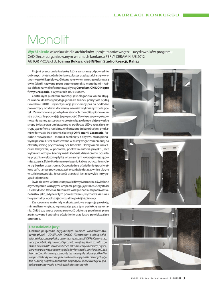 LAUREACI KONKURSU Monolit Wyróżnienie w konkursie dla architektów i projektantów wnętrz – użytkowników programu CAD Decor zorganizowanym w ramach konkursu PERŁY CERAMIKI UE 2012 AUTOR PROJEKTU: Joanna Bukwa, deSIGNum Studio Kreacji, Kalisz Projekt przedstawia łazienkę, która za sprawą odpowiednio dobranych płytek, oświetlenia oraz luster przekształciła się w wytworny pokój kąpielowy. Główną rolę w tym wnętrzu odgrywają dwie ścianki nazwane przez autorkę projektu monolitami – każda obłożona wielkoformatową płytką Coverlam OXIDO Negro firmy Grespania, o wymiarach 100 x 300 cm. Centralnym punktem aranżacji jest elegancka wolno stojąca wanna, do której przylega jedna ze ścianek pokrytych płytką Coverlam OXIDO. Jej kontynuacją jest ciemny pas na podłodze prowadzący od drzwi do wanny, również wykonany z tych płytek. Zamontowane po obydwu stronach monolitu pionowe lustra optycznie podwajają jego grubość. Do większego wyeksponowania wanny zastosowano proste wiszące lampy, dające wąskie snopy światła oraz umieszczono w podłodze LED-y rzucające intrygujące refleksy na ściany, wykończone śnieżnobiałymi płytkami (w formacie 30 x 60 cm) z kolekcji OPP! marki Ceramstic. Podobne rozwiązanie – monolit zamknięty z obydwu stron pionowymi pasami luster zastosowano w dużej wnęce zamienionej na otwartą kabinę prysznicową bez brodzika. Odpływu nie umieściłam klasycznie, w podłodze, podkreśla autorka projektu, lecz wybrałam odpływ ścienny marki Geberit, dzięki czemu posadzkę prysznica wyłożono płytką w tym samym kolorze jak resztę pomieszczenia. Dzięki takiemu rozwiązaniu kabina optycznie wydaje się bardzo przestronna. Odpowiednie oświetlenie (podświetlony sufit, lampy przy posadzce) oraz dwie deszczownice ukryte w suficie powodują, że ta część aranżacji jest niezwykle intrygująca i tajemnicza. Dwie ciekawe w formie umywalki firmy Marmorin, oświetlone asymetrycznie wiszącymi lampami, potęgują wrażenie czystości i niezwykłości łazienki. Natomiast wiszące nad nimi podświetlone lustro, jako jedyne w tym pomieszczeniu, wyznacza kierunek horyzontalny, wydłużając wizualnie pokój kąpielowy. Zastosowane materiały wykończeniowe sugerują prostotę, minimalizm wnętrza, wymuszając przy tym perfekcję wykonania. Chłód czy wręcz pewną surowość udało się przełamać przez zróżnicowane i subtelne oświetlenie oraz lustra powiększające optycznie. Uzasadnienie jury: Ciekawe połączenie oryginalnych cienkich wielkoformatowych płytek COVERLAM OXIDO (Grespania) z białą szkliwioną błyszczącą płytką ceramiczną z kolekcji OPP! (Ceramstic). Jury spodobała się surowość i prostota wnętrza, która została uzyskana dzięki zastosowaniu dwóch tak odmiennych kolekcji płytek, zarówno pod względem wyglądu (wykończenia powierzchni), jak i formatów. Na uwagę zasługuje też niezwykle udane podkreślenie prostej bryły wanny, przez ustawienie jej na tle ciemnych płytek. Autorkę projektu doceniono za pomysł i konsekwencję w sposobie eksponowania płytek wielkoformatowych. Wokół Płytek Ceramicznych 2-2013 3 LAUREACI KONKURSU Romantyczna łazienka w fiolecie Wyróżnienie w konkursie dla architektów i projektantów wnętrz – użytkowników programu CAD Decor zorganizowanym w ramach konkursu PERŁY CERAMIKI UE 2012 AUTOR PROJEKTU: Renata Modrzyńska-Kasiak i Anna Maria Szulińska, ARTDOM Pracownia Projektowa, Mława Ta romantyczna i przytulna łazienka znajduje się przy sypialni małżonków na poddaszu domu jednorodzinnego. W pomieszczeniu udało się zmieścić przestronną kabinę prysznicową, owalną wannę, WC, bidet oraz dużą umywalkę. Dodatkowo, w specjalnej zabudowie za wanną ukryto dwie szafki na ręczniki, kosmetyki, środki czystości itp. Wszystkie elementy wyposażenia mają miękkie obłe formy, podkreślone dodatkowo zaokrąglonymi liniami sufitu podwieszonego, szafki pod umywalką oraz obudowy wanny. W projekcie zastosowano kolekcję SORENTA / SORRO Ceramiki Paradyż – mówi jedna z autorek projektu – która urzeka kolorystyką i niezwykłymi dekoracjami. W jej skład, oprócz płytek podstawowych na ściany i podłogę, wchodzą piękne szklane mozaiki z kostek 2,3 x 2,3 cm oraz subtelne dekoracje z fotograficznym motywem kwiatowym. Mozaikę zastosowano do obudowania wanny, ścianki instalacyjnej pod WC i bidet oraz ramy luster nad umywalką i przy kabinie prysznicowej. Trzy dekoracyjne płytki umieszczone w specjalnie oświetlonej niszy do złudzenia przypominają powiększone fotografie prawdziwych kwiatów. Istotnym elementem aranżacji jest oświetlenie nadające wnętrzu elegancji i tajemniczości. Nastrojową atmosferę tworzą sufit oraz wanna podświetlone ledami w liliowym kolorze, a także lampki z kryształkami nad umywalką. Ciekawym, przykuwającym wzrok detalem łazienki są świetlne refleksy na skosie nad wanną, rzucane przez niewielkie, ukryte w ścianie lampki. Całość prezentuje się bardzo wytwornie i zaprasza do pozostania w niej dłużej. Może na relaksującą kąpiel przy świecach? Uzasadnienie jury: Projekt doceniono przede wszystkim za konsekwencję w wykorzystaniu koloru i obłych form. Kolorystyka płytek oraz mozaiki została podkreślona subtelną jasnofioletową barwą światła. Obłości wyposażenia uwypuklają prostotę i zagęszczenie linii mozaiki. Doskonały przykład eleganckiej i funkcjonalnej łazienki na poddaszu. Zdaniem jury, uniwersalność zastosowanych rozwiązań pozwoli dostosować projekt do pomieszczeń w wielu domach. 4 Wokół Płytek Ceramicznych 2-2013