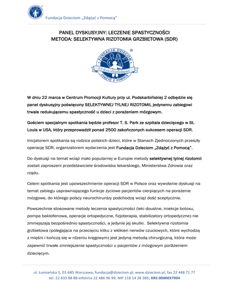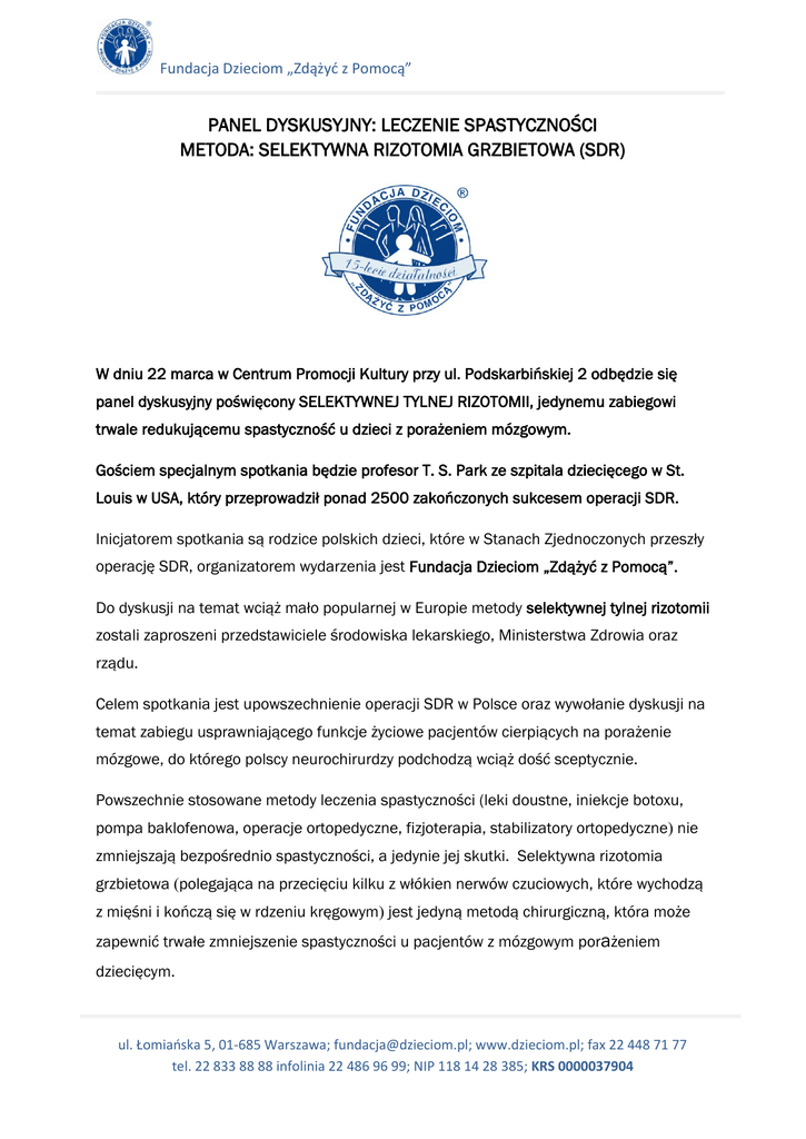 Fundacja Dzieciom „Zdążyć z Pomocą” PANEL DYSKUSYJNY: LECZENIE SPASTYCZNOŚCI METODA: SELEKTYWNA RIZOTOMIA GRZBIETOWA (SDR) W dniu 22 marca w Centrum Promocji Kultury przy ul. Podskarbińskiej 2 odbędzie się panel dyskusyjny poświęcony SELEKTYWNEJ TYLNEJ RIZOTOMII, jedynemu zabiegowi trwale redukującemu spastyczność u dzieci z porażeniem mózgowym. Gościem specjalnym spotkania będzie profesor T. S. Park ze szpitala dziecięcego w St. Louis w USA, który przeprowadził ponad 2500 zakończonych sukcesem operacji SDR. Inicjatorem spotkania są rodzice polskich dzieci, które w Stanach Zjednoczonych przeszły operację SDR, organizatorem wydarzenia jest Fundacja Dzieciom „Zdążyć z Pomocą”. Do dyskusji na temat wciąż mało popularnej w Europie metody selektywnej tylnej rizotomii zostali zaproszeni przedstawiciele środowiska lekarskiego, Ministerstwa Zdrowia oraz rządu. Celem spotkania jest upowszechnienie operacji SDR w Polsce oraz wywołanie dyskusji na temat zabiegu usprawniającego funkcje życiowe pacjentów cierpiących na porażenie mózgowe, do którego polscy neurochirurdzy podchodzą wciąż dość sceptycznie. Powszechnie stosowane metody leczenia spastyczności (leki doustne, iniekcje botoxu, pompa baklofenowa, operacje ortopedyczne, fizjoterapia, stabilizatory ortopedyczne) nie zmniejszają bezpośrednio spastyczności, a jedynie jej skutki. Selektywna rizotomia grzbietowa (polegająca na przecięciu kilku z włókien nerwów czuciowych, które wychodzą z mięśni i kończą się w rdzeniu kręgowym) jest jedyną metodą chirurgiczną, która może zapewnić trwałe zmniejszenie spastyczności u pacjentów z mózgowym porażeniem dziecięcym. ul. Łomiaoska 5, 01-685 Warszawa; [email protected]; www.dzieciom.pl; fax 22 448 71 77 tel. 22 833 88 88 infolinia 22 486 96 99; NIP 118 14 28 385; KRS 0000037904 Fundacja Dzieciom „Zdążyć z Pomocą” SDR nie leczy porażenia mózgowego, ale wraz z rehabilitacją może trwale poprawić życie pacjenta. Zabieg daje bowiem możliwość funkcjonowania na innym poziomie, co w przypadku niepełnosprawnego dziecka jest bardzo dużym osiągnięciem. Po operacji SDR poprawia się siedzenie, stanie, chodzenie, kontrola równowagi, mowa, wzrok, a niejednokrotnie funkcje emocjonalne pacjentów. Największe zmiany widoczne są w ciągu pierwszych 6 miesięcy po operacji. Wśród kilku tysięcy przeprowadzonych w St. Louis operacji, wszystkie (w tym 20 polskich pacjentów) przebiegły pomyślnie i nie miały skutków ubocznych. U żadnego pacjenta od roku 1987 nie zanotowano też długoterminowych komplikacji pooperacyjnych. Rodzice zoperowanych dzieci deklarują zdecydowaną poprawę ich stanu oraz zadowolenie z podjęcia decyzji o operacji. Dlaczego zatem zabieg nie jest popularny w Polsce? Spotkanie rozpocznie się o godz. 13.00 prelekcją profesora T.S. Parka. Następnie odbędą się prezentacje autorstwa fizjoterapeutów i rehabilitantów. Kontakt dla mediów: Monika Sadowa Rzecznik prasowy e-mail: [email protected] tel. 882 174 171 ul. Łomiaoska 5, 01-685 Warszawa; [email protected]; www.dzieciom.pl; fax 22 448 71 77 tel. 22 833 88 88 infolinia 22 486 96 99; NIP 118 14 28 385; KRS 0000037904