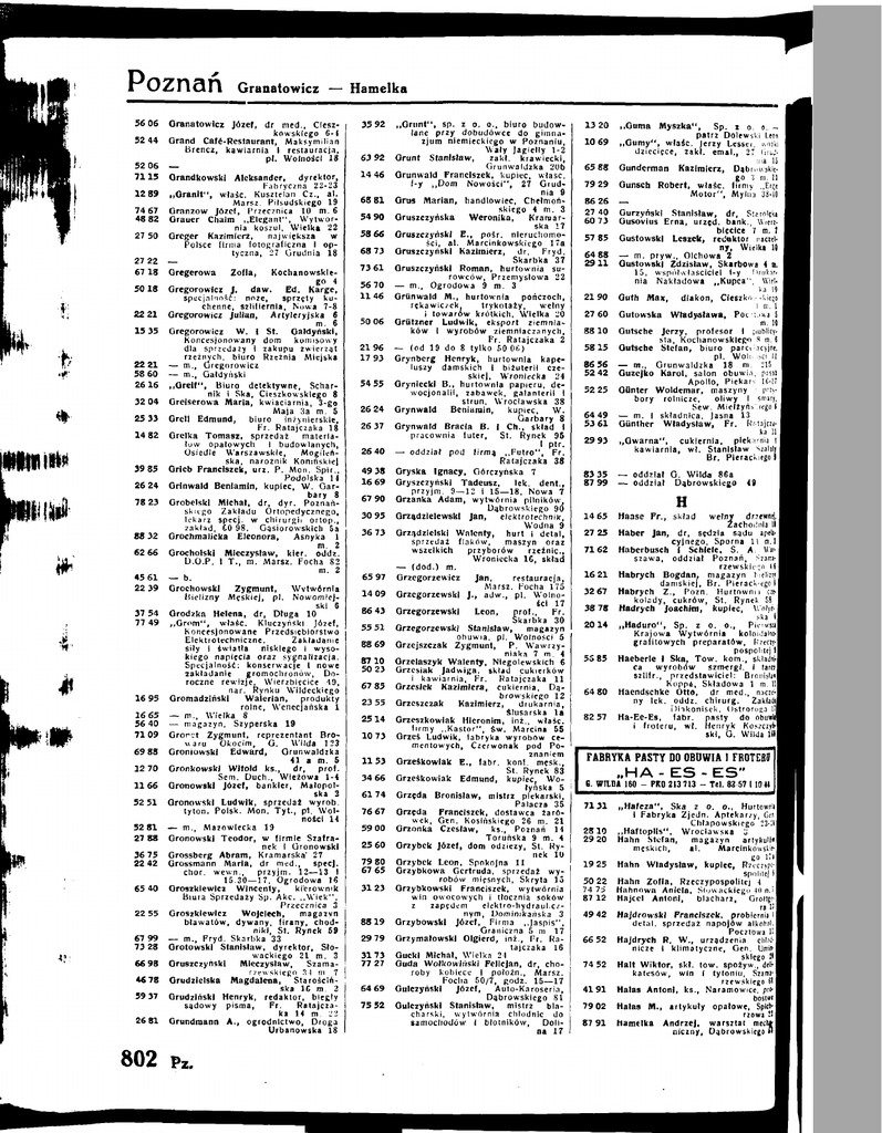 Poznań 56 06 52 44 52 06 7115 12 89 7 4 67 48 82 27 50 27 2 2 6718 5018 22 2 1 15 35 22 2 1 58 60 2616 32 04 25 33 14 82 39 85 26 24 78 23 88 32 62 66 45 6 1 22 39 37 54 77 49 16 95 16 65 56 40 7109 69 88 12 7 0 1166 52 5 1 52 8 1 27 88 3675 22 4 2 65 40 2 2 55 67 99 73 28 66 98 46 78 59 37 26 8 1 802 Granatowieć — Hamelka Oranatowicz J ó z e f , dr m e d . . Ciesz kowskiego 6-4 O rand Cafe-Restaurant, M a k s y m i l i a n Brencz, k a w i a r n i a I restauracja, p l . Wolności 18 — Orandkowskl Aleksander, dyrektor. Fabryczna 22-23 „ G r a n i t " , w l a ś c . Kusztelan Ca., a l . Marsz. Piłsudskiego 19 Oranzow J ó z e f , Przecznica 10 m . 6 Orauer Chalm „ E l e g a n t " , W y t w ó r nia koszul. W i e l k a 22 Oreger Kazimierz, największa w Polsce firma fotograficzna I o p tyczna, 27 Grudnia 18 — Oregerowa Zofia, Kochanowskie go 4 Gregorowlcz J. daw. Ed. Karge, specjalność: noże, sprzęty k u chenne, szlifiernla. Nowa 7-8 Gregorowlcz Julian, Artyleryjska 6 m. 6 Gregorowicz W . I St. Galdyńskl, Koncesjonowany dom komisowy dla sprzedaży i zakupu zwierząt rzeźnych, b i u r o Rzeźnia Miejska — m . , Gregorowicz — m., Galdyński „ G r e i f " , B i u r o detektywne, Schar nik i Ska, Cieszkowskiego 8 Oreiserowa M a r l a , k w i a c i a r n i a , 3-go Maja 3a m . 5 Orell E d m u n d , biuro inżynierskie, F r . Ratajczaka 18 Grelka T o m a s z , Sprzedaż materia łów opałowych i budowlanych, Osiedle Warszawskie, Mogileń ska, narożnik Konińskiej Orleb Franciszek, u r z . P. M o n . Spir., Podolska 14 O r l n w a l d B e n i a m i n , kupiec, W . G a r bary 8 Orobelskl M i c h a ł , d r , d y r . P o z n a ń skiego Z a k ł a d u Ortopedycznego, lekarz specj. w c h i r u r g i i o r t o p . , z a k ł a d , CO 9 8 , G ą s i o r o w s k i c h Sa Grochmalicka Eleonora, Asnyka 1 m. 2 Grocholski M i e c z y s ł a w , k l e r . o d d z . D . O . P . I T . , m . Marsz. Focha 82 m. 2 — b. Grochowski Zygmunt, Wytwórnia Bielizny M ę s k i e j , p l . N o w o m l e j skl 6 Orodzka Helena, d r , D ł u g a 10 „ G r o m " , w l a ś c . Kluczyńskl J ó z e f , Koncesjonowane Przedsiębiorstwo Elektrotechniczne. Zakładanie siły I światła niskiego I w y s o kiego napięcia oraz sygnalizacja. S p e c j a l n o ś ć : konserwacje I nowe zakładanie gromochronów, Do roczne r e w i z j e , Wlerzbieclce 4 9 , n a r . Rynku Wlldeckiego Oromadzlńskl Walerian, produkty rolne, W e n e c j a ń s k a 1 — m . . Wielka 8 — magazyn, Szyperska 19 Oronet Z y g m u n t , reprezentant B r o waru Okocim, G. W i l d a 123 Oroniowskl Edward, Orunwaldzka 41 a m . 5 Oronkowski Witold k s . , - dr, prof. Sem. D u c h . , W i e ż o w a 1-4 O r o n o w s k l J ó z e f , bankier, M a ł o p o l ska 2 Oronowskl L u d w i k , sprzedał w y r ó b . t y t o a . Polsk. M o n . T y t . , p l . W o l ności 14 — m . , Mazowiecka 19 Oronowskl T e o d o r , w f i r m i e Szafranek I O r o n o w s k l Grossberg A b r a m , Kramarska' 27 Orossmann M a r i a , d r m e d . , specj. chor. w e w n . , p r z y j m . 12—13 I 15.30—17, Ogrodowa 16 Oroszklewlcz Wincenty, kierownik Biura Sprzedaży Sp. A k c . „ W i e k " , Przecznica 3 Oroszklewlcz Wojciech, magazyn bławatów, dywany, firany, chod n i k i , St. Rynek 59 — m . , F r y d . Skarbka 33 Orotowskl Stanisław, dyrektor. S ł o wackiego 21 m . 3 Oruszczyńskl Mieczysław, Szama rzewskiego 34 m 7 Orudzielska Magdalena, Starościń ska 16 m . 2 Grudziński H e n r y k , r e d a k t o r , biegły sadowy p i s m a , Fr. Ratajcza ka 14 m . 22 Qrundmann A . , o g r o d n i c t w o , Droga Urbanowska 18 Px. 35 92 63 92 14 46 68 8 1 54 90 58 66 68 73 73 6 1 56 70 1146 50 06 2 1 96 17 9 3 54 55 26 24 26 37 26 40 49 38 16 69 67 90 30 95 3 6 73 65 97 14 09 86 43 55 5 1 88 69 87 10 5 0 23 67 85 23 55 2514 1073 1153 34 66 6174 7 6 67 59 0 0 25 60 79 8 0 67 65 3123 8819 29 79 3173 77 87 64 69 75 52 „ G r u n t " , sp. z o. o., b i u r o b u d o w lane p r z y d o b u d ó w c e do g i m n a z j u m * niemieckiego w Poznaniu, W a ł y Jagiełły 1-2 Grunt Stanisław, zakł. k r a w i e c k i . Grunwaldzka 20b G r u n w a l d Franciszek, kupiec, w ł a ś c . f - y „ D o m N o w o ś c i " , 27 G r u d nia 9 Grus M a r i a n , handlowiec, C h e ł m o ń skiego 4 m . 3 Gruszczyńska Weronika, Kramar ska 17 G r u s z c z y ń s k i E., p o s r . nieruchomo* ści, a l . Marcinkowskiego 17a Oruszczyńskl Kazimierz, dr. Fryd. Skarbka 37 Gruszczyński Roman, h u r t o w n i a su r o w c ó w . Przemysłowa 22 — m . , Ogrodowa 9 m . 3 Grunwald M . , hartownia pończoch, rękawiczek, trykotaży, wełny I t o w a r ó w krótkich. Wielka 20 Griitzner L u d w i k , eksport ziemnia k ó w I w y r o b ó w ziemniaczanych, F r . Ratajczaka 2 —- ( o d 19 do 8 t y l k o 60 06) Grynberg H e n r y k , h u r t o w n i a kape luszy damskich I biżuterii cze s k i e j , Wronlecka 24 Orynieckl B . , h u r t o w n i a p a p i e r u , dew o c j o n a l i i , zabawek, galanterii I s t r u n , W r o c ł a w s k a 38 Grynwald Beniamin, kupiec, W. Garbary 8 G r y n w a l d Bracia B . 1 C h . , skład I pracownia f u t e r , St. Rynek 96 I ptr. — oddział p o d f i r m a „ F u t r o " , F r . Ratajczaka 38 Oryska I g n a c y , G o r c z y ń s k a 7 Gryszczyński Tadeusz, lek. d e n t . , p r z y j m . 9—12 i 15—18, Nowa 7 Grzanka A d a m , wytwórnia pilników. D ą b r o w s k i e g o 90 Grządzlelewskl Jan, elektrotechnik. Wodna 9 Orządzielskl W a l e n t y , h u r t I detal, sprzedaż f l a k ó w , maszyn oraz wszelkich przyborów rzeźnie., Wronlecka 1 6 , skład — (dod.) m. Grzegorzewicz Jan, restauracja, Marsz. Focha 175 Grzegorzewski J., a d w . , p l . W o l n o ści 17 Grzegorzewski Leon, prof., Fr. Skarbka 30 Grzegorzewski S t a n i s ł a w , magazyn o b u w i a , p l . Wolności 5 Orzejszczak Z y g m u n t , P. W a w r z y niaka 7 m . 4 Orzelaszyk W a l e n t y , Nlegolewskich 6 Grzesiak Jadwiga, skład cukierków I kawiarni