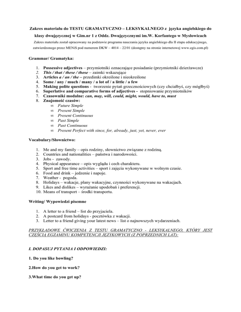 Zakres materiału do TESTU GRAMATYCZNO – LEKSYKALNEGO z języka angielskiego do klasy dwujęzycznej w Gim.nr 1 z Oddz. Dwujęzycznymi im.W. Korfantego w Mysłowicach Zakres materiału został opracowany na podstawie programu nauczania języka angielskiego dla II etapu edukacyjnego, zatwierdzonego przez MENiS pod numerem DKW – 4014 – 22/01 (dostępny na stronie internetowej www.egis.com.pl) Grammar/ Gramatyka: 1. 2. 3. 4. 5. 6. 7. 8. Possessive adjectives – przymiotniki oznaczające posiadanie (przymiotniki dzierżawcze) This / that / these / those – zaimki wskazujące Articles a / an / the – przedimki określone i nieokreślone Some / any / much / many / a lot of / a little / a few Making polite questions - tworzenie pytań grzecznościowych (czy chciałbyś, czy mógłbyś) Superlative and comparative forms of adjectives - stopniowanie przymiotników Czasowniki modalne: can, may, will, could, might, would, have to, must Znajomość czasów: • Future Simple • Present Simple • Present Continuous • Past Simple • Past Continuous • Present Perfect with since, for, already, just, yet, never, ever Vocabulary/Słownictwo: 1. 2. 3. 4. 5. 6. 7. 8. 9. 10. Me and my family – opis rodziny, słownictwo związane z rodziną. Countries and nationalities – państwa i narodowości. Jobs - zawody. Physical appearance – opis wyglądu i cech charakteru. Sport and free time activities – sport i zajęcia wykonywane w wolnym czasie. Food and drink – jedzenie i napoje. Weather - pogoda. Holidays – wakacje, plany wakacyjne, czynności wykonywane na wakacjach. Likes and dislikes – wyrażanie upodobań i preferencji. Means of transport – środki transportu. Writing/ Wypowiedzi pisemne 1. A letter to a friend – list do przyjaciela. 2. A postcard from holidays - pocztówka z wakacji. 3. Letter to a friend giving your latest news – list o najnowszych wydarzeniach. PRZYKŁADOWE ĆWICZENIA Z TESTU GRAMATYCZNO - LEKSYKALNEGO, KTÓRY JEST CZĘŚCIĄ EGZAMINU KOMPETENCJI JĘZYKOWYCH (Z POPRZEDNICH LAT): I. DOPASUJ PYTANIA I ODPOWIEDZI: 1. Do you like bowling? 2.How do you get to work? 3.What time do you get up? 4.Can you juggle? 5.Where did you spend your last holiday? a) No, I can’t. It is too difficult for me. b) In San Giminiano, Italy. c) Usually by train, sometimes by car, too. d) At 7.30. e) Yes, I do. I think it’s great fun ! odp. 1. e 2. c 3. d 4. a 5. b II. NAPISZ DO KOLEGI/KOLEŻANKI KRÓTKĄ KARTKĘ Z WAKACJI, W KTÓREJ INFORMUJESZ, GDZIE JESTEŚ, JAKA JEST POGODA I CO ROBISZ. PRZYKŁADOWE ĆWICZENIE Z TESTU PREDYSPOZYCJI JĘZYKOWYCH: I. Do słów w tabelce dopisz antonimy (wyrazy o przeciwnym znaczeniu), wybierając je z podanych przykładów od A do F. Nie wszystkie podane słowa nadają się do wykorzystania w tym zadaniu. uroczysty B ponury D szlachetny C uproszczony E A B C D E F – – – – – – zacny pospolity niecny pocieszny skomplikowany posępny