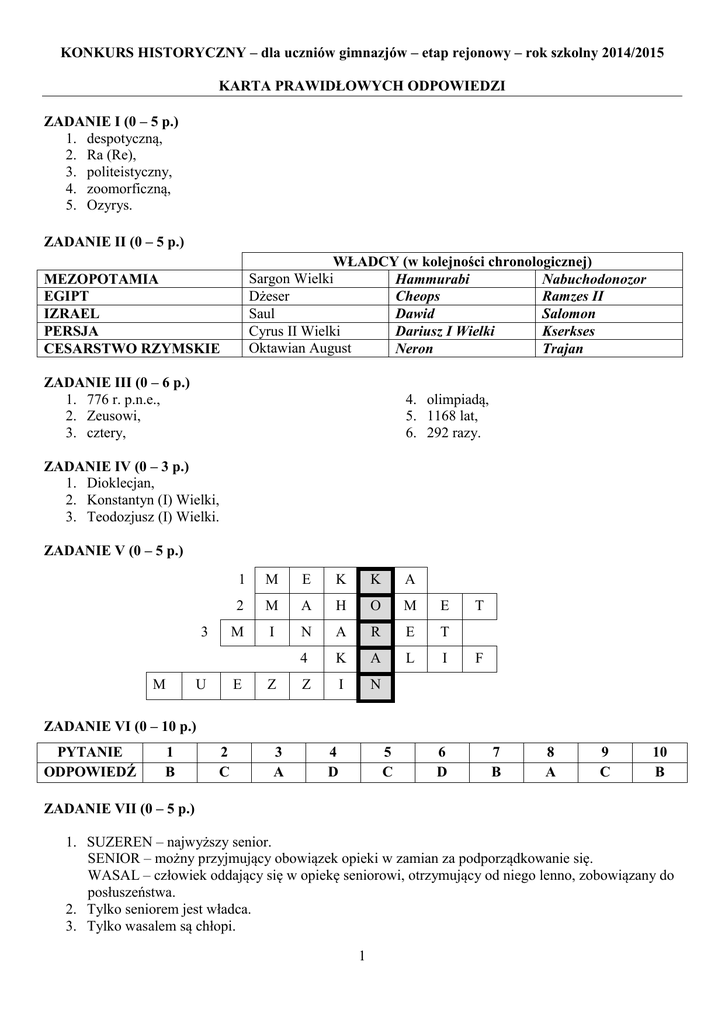 KONKURS HISTORYCZNY – dla uczniów gimnazjów – etap rejonowy – rok szkolny 2014/2015 KARTA PRAWIDŁOWYCH ODPOWIEDZI ZADANIE I (0 – 5 p.) 1. despotyczną, 2. Ra (Re), 3. politeistyczny, 4. zoomorficzną, 5. Ozyrys. ZADANIE II (0 – 5 p.) WŁADCY (w kolejności chronologicznej) Sargon Wielki Hammurabi Nabuchodonozor Dżeser Cheops Ramzes II Saul Dawid Salomon Cyrus II Wielki Dariusz I Wielki Kserkses Oktawian August Neron Trajan MEZOPOTAMIA EGIPT IZRAEL PERSJA CESARSTWO RZYMSKIE ZADANIE III (0 – 6 p.) 1. 776 r. p.n.e., 2. Zeusowi, 3. cztery, 4. olimpiadą, 5. 1168 lat, 6. 292 razy. ZADANIE IV (0 – 3 p.) 1. Dioklecjan, 2. Konstantyn (I) Wielki, 3. Teodozjusz (I) Wielki. ZADANIE V (0 – 5 p.) 3 M U 1 M E K K A 2 M A H O M E M I N A R E T 4 K A L I Z I N E Z T F ZADANIE VI (0 – 10 p.) PYTANIE ODPOWIEDŹ 1 B 2 C 3 A 4 D 5 C 6 D 7 B 8 A 9 C 10 B ZADANIE VII (0 – 5 p.) 1. SUZEREN – najwyższy senior. SENIOR – możny przyjmujący obowiązek opieki w zamian za podporządkowanie się. WASAL – człowiek oddający się w opiekę seniorowi, otrzymujący od niego lenno, zobowiązany do posłuszeństwa. 2. Tylko seniorem jest władca. 3. Tylko wasalem są chłopi. 1 ZADANIE VIII (0 – 3 p.) 1. Aztekowie, 2. Majowie, 3. Inkowie. ZADANIE IX (0 – 3 p.) Michał Anioł A Leonardo da Vinci C Rafael Santi D ZADANIE X (0 – 5 p.) 1. prawda, 2. fałsz, 3. prawda, 4. prawda, 5. fałsz. ZADANIE XI (0 – 10 p.) WYDARZENIE PIERWSZE OSTATNIE rewolucja w Anglii C D wojna o niepodległość A C rewolucja francuska B D epoka napoleońska B C Wiosna Ludów A B ZADANIE XII (0 – 5 p.) 1. Bolesław Chrobry, 2. Bolesław Śmiały (Szczodry), 3. Bolesław Krzywousty, 4. Władysław Wygnaniec, 5. Henryk Brodaty. ZADANIE XIII (0 – 6 p.) PANOWANIE WŁADYSŁAWA ŁOKIETKA bunt kierowany przez wójta Alberta zbrojne zajęcie Wielkopolski bitwa pod Płowcami KAZIMIERZA WIELKIEGO zjazd władców w Wyszehradzie przyłączenie do Polski Rusi Halicko – Włodzimierskiej kodyfikacja prawa zwyczajowego ZADANIE XIV (0 – 5 p.) 1. prawda, 2. prawda, 3. fałsz, 4. prawda, 5. fałsz. ZADANIE XV (0 – 8 p.) 1. Władysław (Warneńczyk), 2. 1444, 3. Kazimierz Jagiellończyk, 4. Władysława II, 5. Wiedniu, 6. Zygmunta I Starego, 7. Habsburgowie, 8. Ludwik. 2 ZADANIE XVI (0 – 5 p.) 1. Mikołaj Trąba, 2. Paweł Włodkowic, 3. Stanisław Hozjusz, 4. Jakub Wujek, 5. Piotr Skarga. ZADANIE XVII (0 – 5 p.) 1. Dokument został spisany w 1573 roku. 2. Cztery spośród poniższych odpowiedzi: - król akceptuje wolną elekcję, - nie będzie osadzać na tron sukcesora, - nie będzie używać tytułu dziedzica, - w sprawach państwowych będzie współpracował z radami koronnymi, - nie będzie decydował o wojnie i pospolitym ruszeniu bez zgody sejmu, - nie będzie nakładał nowych podatków i ceł bez zezwolenia sejmu. ZADANIE XVIII (0 – 7 p.) 1. Lwów, 2. Połaniec, 3. Grodno, 4. Petersburg, 5. Sicz, 6. Warszawa, 7. Buczacz. ZADANIE XIX (0 – 8 p.) NUMER FOTOGRAFII 1 2 3 4 MIASTO Baranów Warszawa (Łazienki) Wilanów (Warszawa) Malbork STYL ARCHITEKTONICZNY renesans klasycyzm barok gotyk ZADANIE XX (0 – 6 p.) MAPA 1 NAZWA OBSZARU Księstwo Warszawskie ROK UTWORZENIA 1807 Fryderyk August I WŁADCA MAPA 2 Królestwo Polskie 1815 Aleksander I ZADANIE XXI (0 – 5 p.) POSTAĆ INFORMACJA 1 D 2 A 3 F 3 4 B 5 C