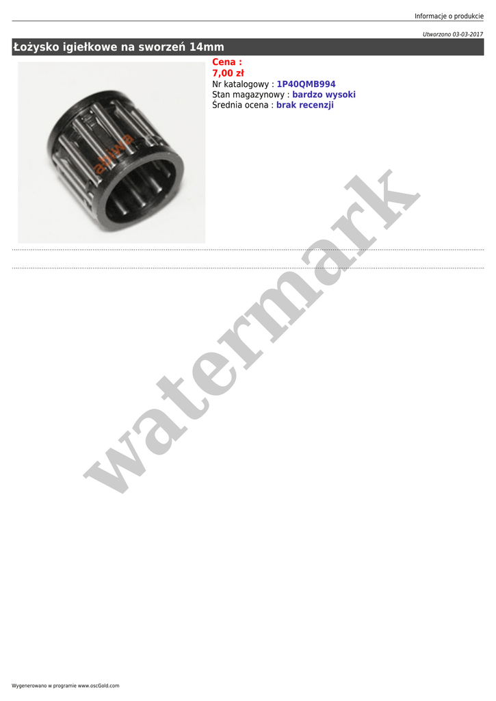 Informacje o produkcie Utworzono 03-03-2017 Łożysko igiełkowe na sworzeń 14mm Cena : 7,00 zł w at er m ar k Nr katalogowy : 1P40QMB994 Stan magazynowy : bardzo wysoki Średnia ocena : brak recenzji Wygenerowano w programie www.oscGold.com