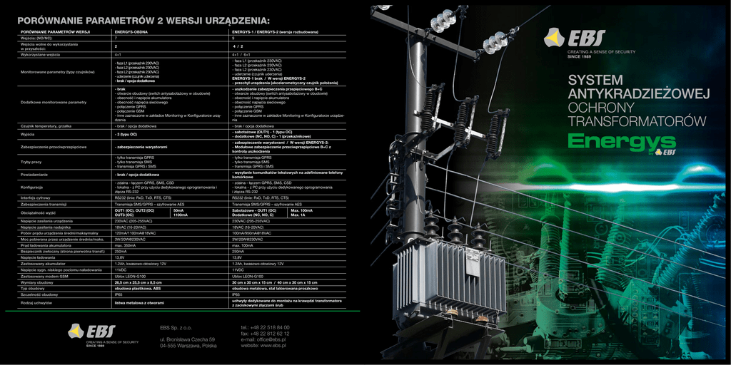 PORÓWNANIE PARAMETRÓW 2 WERSJI URZĄDZENIA: PORÓWNANIE PARAMETRÓW WERSJI ENERGYS-OBDNA ENERGYS-1 / ENERGYS-2 (wersja rozbudowana) Wejścia: (NO/NC): 7 9 Wejścia wolne do wykorzystania w przyszłości: 2 4 / 2 Wykorzystane wejścia 4+1 4+1 / 6+1 Monitorowane parametry (typy czujników) - faza L1 (przekaźnik 230VAC) - faza L2 (przekaźnik 230VAC) - faza L2 (przekaźnik 230VAC) - uderzenie (czujnik uderzenia) - brak / opcja dodatkowa - faza L1 (przekaźnik 230VAC) - faza L2 (przekaźnik 230VAC) - faza L2 (przekaźnik 230VAC) - uderzenie (czujnik uderzenia) ENERGYS-1 brak / W wersji ENERGYS-2 - przechył urządzenia (akcelerometryczny czujnik położenia) - brak - otwarcie obudowy (switch antysabotażowy w obudowie) - obecność i napięcie akumulatora - obecność napięcia sieciowego - połączenie GPRS - połączenie GSM - inne zaznaczone w zakładce Monitoring w Konfiguratorze urządzenia - uszkodzenie zabezpieczenia przepięciowego B+C - otwarcie obudowy (switch antysabotażowy w obudowie) - obecność i napięcie akumulatora - obecność napięcia sieciowego - połączenie GPRS - połączenie GSM - inne zaznaczone w zakładce Monitoring w Konfiguratorze urządzenia Czujnik temperatury, grzałka - brak / opcja dodatkowa - brak / opcja dodatkowa Wyjścia - 3 (typu OC) - sabotażowe (OUT1) - 1 (typu OC) - dodatkowe (NC, NO, C) - 1 (przekaźnikowe) Zabezpieczenie przeciwprzepięciowe - zabezpieczenie warystorami - zabezpieczenie warystorami / W wersji ENERGYS-2: - Modułowe zabezpieczenie przeciwprzepięciowe B+C z kontrolą uszkodzenia Tryby pracy - tylko transmisja GPRS - tylko transmisja SMS - transmisja GPRS i SMS - tylko transmisja GPRS - tylko transmisja SMS - transmisja GPRS i SMS Powiadamianie - brak / opcja dodatkowa - wysyłanie komunikatów tekstowych na zdefiniowane telefony komórkowe Konfiguracja - zdalna - łączem GPRS, SMS, CSD - lokalna - z PC przy użyciu dedykowanego oprogramowania i złącza RS-232 - zdalna - łączem GPRS, SMS, CSD - lokalna - z PC przy użyciu dedykowanego oprogramowania i złącza RS-232 Interfejs cyfrowy RS232 (linie: RxD, TxD, RTS, CTS) RS232 (linie: RxD, TxD, RTS, CTS) Zabezpieczenia transmisji Transmisja SMS/GPRS – szyfrowanie AES Transmisja SMS/GPRS – szyfrowanie AES Obciążalność wyjść OUT1 (OC), OUT2 (OC) OUT3 (OC) Sabotażowe - OUT1 (OC) Dodatkowe (NC, NO, C) Napięcie zasilania urządzenia 230VAC (205-255VAC) 230VAC (205-255VAC) Napięcie zasilania nadajnika 18VAC (16-20VAC) 18VAC (16-20VAC) Pobór prądu urządzenia średni/maksymalny 120mA/1100mA@18VAC 100mA/950mA@18VAC Moc pobierana przez urządzenie średnia/maks. 3W/20W@230VAC 3W/20W@230VAC Prąd ładowania akumulatora max. 350mA max. 100mA Bezpiecznik zwłoczny (strona pierwotna transf.) 250mA 250mA Napięcie ładowania 13,8V 13,8V Zastosowany akumulator 1.2Ah, kwasowo-ołowiowy 12V 1.2Ah, kwasowo-ołowiowy 12V Napięcie sygn. niskiego poziomu naładowania 11VDC 11VDC Zastosowany modem GSM Ublox LEON-G100 Ublox LEON-G100 Wymiary obudowy 26,5 cm x 25,5 cm x 8,5 cm 30 cm x 30 cm x 15 cm / 40 cm x 30 cm x 15 cm Typ obudowy obudowa plastikowa, ABS obudowa metalowa, stal lakierowana proszkowo Szczelność obudowy IP65 IP65 Rodzaj uchwytów listwa metalowa z otworami uchwyty dedykowane do montażu na krawędzi transformatora z zaciskowymi złączami śrubowymi Dodatkowe monitorowane parametry 50mA 1100mA EBS Sp. z o.o. ul. Bronisława Czecha 59 04-555 Warszawa, Polska tel.: +48 22 518 84 00 fax: +48 22 812 62 12 e-mail: [email protected] website: www.ebs.pl Max. 100mA Max. 1A System antykradzieżowej ochrony transformatorów Transformatory energetyczne są obecnie elementami o małej awaryjności. Według statystyk jedynie dwa na sto urządzeń w skali roku ulega jakimkolwiek awariom. Największym zagrożeniem jest wandalizm oraz kradzieże. Zniszczenia z nimi związane wycenia się na setki tysięcy złotych. Zabezpieczenie antykradzieżowe transformatorów oferowane przez EBS pozwoli na uniknięcie strat związanych z kradzieżami i zniszczeniami urządzeń oraz całej sieci. Oferujemy 2 wersje systemu ENERGYS: PX200N-2GV oraz bardziej rozbudowaną wersję LX10-3GV. RDR Rejonowa Dyspozycja Ruchu BAZA DANYCH PostgreSQL KONSOLA do konfiguracji urządzenia i APLIKACJA POWIADAMIAJĄCA o alarmach i zdarzeniach RDR Rejonowa Dyspozycja Ruchu KONSOLA do konfiguracji urządzenia i APLIKACJA POWIADAMIAJĄCA o alarmach i zdarzeniach Transformator chroniony przez GPRS / SMS SERWER ODBIORCZY RDR Rejonowa Dyspozycja Ruchu ETHERNET KONSOLA do konfiguracji urządzenia i APLIKACJA POWIADAMIAJĄCA o alarmach i zdarzeniach Podstawowymi funkcjami zabezpieczenia ENERGYS jest przesyłanie informacji w czasie rzeczywistym o: awarii sieci lub transformatora (zanik, powrót napięcia – L1, L2, L3) próbach sabotażu / kradzieży (wstrząs lub przechył transformatora, otwarcie obudowy) DZIAŁANIE SYSTEMU ENERGYS Na system ENERGYS składa się wiele elementów sprawiających, że jest on wytrzymały na wszelkie próby zniszczenia i zmienne warunki atmosferyczne. Możliwość podłączenia kilku czujek pozwala wykryć i zweryfikować najmniejsze nieprawidłowości, zaś rozbudowany moduł komunikacyjny zapewnia niezawodność w przesyłaniu komunikatów alarmowych oraz sygnałów testowych. PODSTAWOWE CECHY SYSTEMU: Szczelna obudowa (IP65), odporna na warunki atmosferyczne, przystosowana do zamocowania do kadzi transformatora. Możliwość podłączenia 8 czujników pomiarowych lub różnych źródeł alarmu. Jedno wyjście typu załącz / wyłącz realizujące funkcję przerwania lub zwarcia obwodu elektrycznego. Interfejs RS232/RS485 pozwalający na późniejszą rozbudowę urządzenia nadawczego o cyfrowe czujniki pomiarowe. Regularne i częste sygnały testowe pozwalające na pewne monitorowanie obiektu. Zdalna zmiana ustawień za pomocą GPRS/SMS/CSD pozwalająca bez dodatkowych kosztów modyfikować funkcjonowanie systemu. Jasne, natychmiastowe komunikaty wyświetlane na ekranie komputera dys