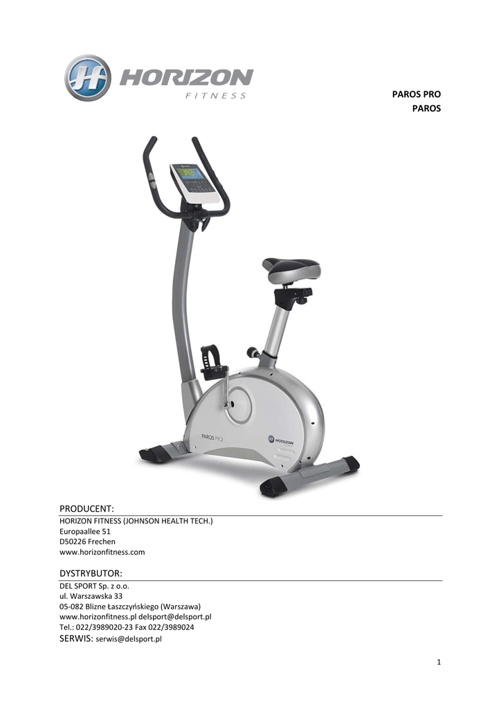 PAROS PRO PAROS PRODUCENT: HORIZON FITNESS (JOHNSON HEALTH TECH.) Europaallee 51 D50226 Frechen www.horizonfitness.com DYSTRYBUTOR: DEL SPORT Sp. z o.o. ul. Warszawska 33 05‐082 Blizne Łaszczyńskiego (Warszawa) www.horizonfitness.pl [email protected] Tel.: 022/3989020‐23 Fax 022/3989024 SERWIS: [email protected] 1 MONTAŻ KROK 1 UWAGA! Do kroku 1 nie ma torebki ze śrubami. A. Przymocuj tylną podstawę do korpusu urządzenia używając do tego śrub wkręconych w urządzenie. B. Przymocuj przednią podstawę do korpusu urządzenia używając do tego śrub wkręconych w urządzenie. 2 KROK 2 A. Zsuń osłonę kolumny. B. Połącz przewody i schowaj je w kolumnie. C. Wsuń kolumnę na sztycę wychodzącą z korpusu urządzenia i przymocuj ją 4 śrubami (68), 4 podkładkami (67), 4 podkładkami (66) z obu stron, 2 śrubami (68), 2 podkładkami (67), 2 podkładkami (69) z obu stron. D. Zsuń osłonę, tak by oparła się na korpusie urządzenia. E. UWAGA! Podczas dokręcania śrub nie uszkodź przewodów. 3 KROK 3 UWAGA! Do kroku 1 nie ma torebki ze śrubami. A. Przymocuj siodełko do sztycy siodełka. B. Wyciągnij pokrętło regulacji wysokości siodełka i wsuń sztycę siodełka w otwór znajdujący się w korpusie urządzenia. 4 KROK 4 UWAGA! Do kroku 1 nie ma torebki ze śrubami. A. Przymocuj prawy pedał do prawej korby pedału. Pedał wkręć zgodnie z ruchem wskazówek zegara. B. Przymocuj lewy pedał do lewej korby pedału. Pedał wkręć przeciwnie do ruchu wskazówek zegara. 5 KROK 5 A. Przełóż przewody przez otwór znajdujący się na szczycie kolumny. B. Przymocuj kierownicę na szczycie kolumny używając do tego tulei (21) i pokrętła (22). 6 KROK 6 UWAGA! Do kroku 1 nie ma torebki ze śrubami. A. Połącz przewody wyświetlacza i włóż je do otworu znajdującego się w kolumnie. B. Przymocuj wyświetlacz na szczycie kolumny używając do tego wkręconych śrub. UWAGA! Podczas dokręcania śrub uważaj by nie uszkodzić przewodów. 7 KROK 7 UWAGA! Do tego kroku nie ma torebki z częściami. A. Przymocuj prawą i lewą osłonę kolumny używając do tego 4 wcześniej wkręconych sworzni i 1 śruby. B. Podłącz zasilacz. PAROS / PAROS PRO PAROS / PAROS PRO Max. waga Użytkownika: 136kg Waga: 31kg Wymiary:103x60x135cm 8 UWAGA! Przeczytaj uważnie instrukcję obsługi. Zawiera ważne wskazówki dotyczące bezpieczeństwa, użytkowania oraz konserwacji urządzenia. UWAGA! By zmniejszyć ryzyko poparzenia, ogniem, porażenia prądem lub innych obrażeń: • Korzystaj z urządzenia zgodnie z jego przeznaczeniem. • Nie wkładaj żadnych przedmiotów w otwory znajdujące się w urządzeniu. • Napraw powinien dokonywać jedynie autoryzowany serwis Horizon Fitness. • Nie korzystaj z urządzenia, jeśli ma uszkodzony przewód lub wtyczkę, urządzenie nie działa poprawnie. Zgłoś się do autoryzowanego przedstawiciela Horizon Fitness. • Przewód elektryczny trzymaj z dala od gorących powierzchni. • Nie korzystaj z urządzenia na zewnątrz, poza budynkiem. • Zanim odłączysz urządzenie od gniazdka elektrycznego wyłącz je głównym przełącznikiem i dopiero wtedy wyciągnij wtyczkę z kontaktu. • Ustawiając urządzenie zwróć uwagę by nie przygnieść przewodu elektrycznego. • Odłącz urządzenie od gniazdka elektrycznego zanim je zaczniesz przestawiać. • Dzieciom nie wolno korzystać z urządzenia. • Uważaj na zwierzęta, nie powinny zbliżać się do urządzenia. • Jeśli poczujesz nagły ból w klatce piersiowej, nudności, zawroty głowy, nie możesz złapać tchu przerwij natychmiast ćwiczenie i skonsultuj się z lekarzem. • Do ćwiczenia zakładaj ubrania sportowe oraz takie, które nie mogą zaczepić się o urządzenie. • Pij dużo podczas treningu. • Urządzenie przeznaczone jest do użytku domowego. • Urządzenie spełnia wymagania normy EN957‐1‐5, klasa HA. • Czyszczenie: urządzenie powinno być przecierane wilgotną szmatką. Nie stosuj rozpuszczalników! • Z urządzenia należy korzystać jedynie wewnątrz budynku. Jeśli urządzenie znajdowało się w pomieszczeniu o niskiej temperaturze i dużej wilgotności to zanim zostanie włączone należy je wpierw ogrzać. W przeciwnym wypadku można doprowadzić do uszkodzenia elektroniki. UWAGA! Jeśli poczujesz nagły ból w klatce piersiowej, nudności, zawroty głowy, nie możesz złapać tchu przerwij natychmiast ćwiczenie i skonsultuj się z lekarzem. Przy użytkowaniu urządzenia kieruj się wskazówkami zawartymi w instrukcji obsługi. Zanim zaczniesz korzystanie z urządzenia upewnij się czy wszystkie elementy zostały prawidłowo dokręcone. Urządzenie powinno być ustawione w pomieszczeniu o niskiej wilgotności i niewielkich wahaniach temperatury. Powinno być ustawione w pewnej odległości od ścian oraz od mebli. PRZESTAWIANIE Urządzenie zostało wyposażone w kółka transportowe wbudowane w podstawę. Przechyl urządzenie (przytrzymując od spodu stopą) i przestaw rower. UWAGA! Urządzenie jest ciężkie! Poproś o pomoc. 9 WYŚWIETLACZ PAROS PAROS PRO A. UP/DOWN 1. Przyciski zwiększające/zmniejszające wartości funkcji. 2. Przyciski służące do przeglądania i wyboru funkcji. 3. Przyciski zwiększające/zmniejszające opór. B. MODE 1. Przycisk zatwierdzający wprowadzone dane i zmieniający wyświetlaną funkcję. 2. Po programie Body Fat przycisk MODE służy do zmiany wyświetlanej informacji. C. START / STOP 1. Przycisk służący do rozpoczęcia lub pauzy treningu. D. RECOVERY Jeśli w trakcie treningu zmierzony został puls to możesz rozpocząć test Recovery. E. RESET Przy ustawianiu funkcji przycisk RESET służy do powrotu do ustawień początkowych. Naciśnij i przytrzymaj RESET przez 3 sekundy by zresetować system. F. BODY FAT Program służy do określenia wskaźników BMI i zawartości tkanki tłuszczowej w organizmie. WPROWADZANIE DANYCH UŻYTKOWNIKA Można wprowadzić do urządzenia dane Użytkownika takie jak: imię, p