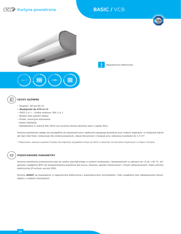 Kurtyna powietrzna BASIC / VCB Nagrzewnica elektryczna CECHY GŁÓWNE – Długości: 60 lub 90 cm – Wydajność do 475 m3/h – FACE 2 in 1 – kratka wlotowa i filtr 2 w 1 – Bardzo niski poziom hałasu – Proste, intuicyjne sterowanie – Łatwa instalacja – Standardowo w kolorze RAL 9010 (na życzenie klienta dowolny kolor z palety RAL) Kurtyna powietrzna nadaje się szczególnie do stosowania przy nadmuchu gorącego powietrza przy małych wejściach, w miejscach takich jak bary fast-food, restauracje dla zmotoryzowanych, stacje benzynowe i recepcje przy zalecanej wysokości do 1,5 m*. * Maksymalna, zalecana wysokość montażu dla większości przypadków (może się różnić w zależności od warunków miejscowych w miejscu montażu) PODSTAWOWE PARAMETRY Kurtyna powietrzna przeznaczona jest do użytku wewnętrznego w suchym środowisku i temperaturach w zakresie od +5 do +40 °C, wilgotności względnej 80% do transportowania powietrza bez kurzu, tłuszczy, oparów chemicznych i innych zanieczyszczeń. Klasa ochrony elektrycznej IP kurtyny wynosi IP20. Kurtyny BASIC są wyposażone w nagrzewnicę elektryczną z automatycznym termostatem. Całe urządzenie jest zabezpieczone termostatem z resetem manualnym. 20 BASIC / VCB Wydajność [m3/h] Typ 2 bieg 1 bieg Głośność [dB(A)]* 3m 5m Kurtyna powietrzna Napęcie/ Częstotliwość [V/Hz] Prąd wentylatora [A] Moc wentylatora [W] Moc nagrzewnicy [kW] Całkowity pobór mocy [A] Całkowita moc [кW] Przyrost temperatury Δt [°C] Waga [kg] VCB-A-060-E-RF-0-0 315 285 46,5 42,1 230 / 50 0,4 57,0 2,4 11 2,5 22,0 6 VCB-A-090-E-RF-0-0 475 410 48,5 44,0 230 / 50 0,7 87,0 3,1 14 3,2 19,0 8 * Wartość ciśnienia akustycznego mierzona w odległości 3 i 5m od urządzenia, na najwyższym biegu wentylatora. Współczynnik kierunkowości Q:2 BASIC 600 612 17,5 70 176 152 35 17,5 30 161 190 46 10 636 647 BASIC 900 17,5 21 BASIC / VCB Kurtyna powietrzna INSTALACJA I MONTAŻ – Kurtyna powietrzna może być montowana jedynie w pozycji poziomej! – Kurtyna powinna być zamontowana nad drzwiami wejściowymi w miarę możliwości blisko górnej krawędzi drzwi, zobacz schemat – Aby uzyskać najwyższą wydajność kurtyny powietrznej BASIC zaleca się aby długość kurtyny była większa od otworu, nad którym będzie zamontowana – W celu zapewnienia poprawnej pracy urządzenia, należy zachować określoną odległość od pobliskich obiektów, zobacz schemat – Podczas montażu, należy przewidzieć podłączenie przewodu elektrycznego do kurtyny – W celu zawieszenia kurtyny, użyć uchwytów dołączonych do zestawu Projekt kurtyny zawsze powinien być wykonany przez projektanta HVAC. min 50 mm min 150 mm max 1800 mm STEROWANIE Kurtyny BASIC są sterowane za pomocą bezprzewodowego pilota, dołączonego do zestawu. Podstawowa charakterystyka sterownika została przedstawiona poniżej. PRZEGLĄD FUNKCJI STEROWNIKA Rodzaj sterowania Regulacja wydajności Regulacja nagrzewnicy elektrycznej 22 Manualny 2 biegi TAK (ON/OFF) Możliwość podłączenia wyłącznika drzwiowego NIE Pomiar temperatury NIE Sterowanie zewnętrzne NIE Chłodzenie nagrzewnicy elektrycznej TAK Możliwość łączenia kurtyn TAK Lampka kontrolna dla wybranych funkcji TAK BASIC / VCB Kurtyna powietrzna Po wyłączeniu kurtyny, automatycznie uruchamia się system chłodzenia, poprzez wentylatory, które działają jeszcze przez 30 sekund. Funkcja chłodzenia jest sygnalizowana poprzez miganie diody LED znajdującej się na obudowie kurtyny. AKCESORIA Do prawidłowej pracy kurtyn BASIC nie są wymagane żadne dodatkowe akcesoria. SCHEMATY POŁĄCZEŃ Kurtyna powietrzna BASIC jest wyposażona jest w przewód zasilający z wtyczką (długość 3 m). OZNACZENIA VCB-A-060-E-RF-0-0 0 – wersja 2VV 0 – Standardowy kolor RAL 9 – Niestandardowy kolor RAL RF – Pilot zdalnego sterowania o czestotliwości radiowej E – Nagrzewnica elektryczna 060 – 060 – Długość nominalna 600 mm – 090 – Długość nominalna 900 mm A – Oznaczenie serii VCB – kurtyna BASIC 23