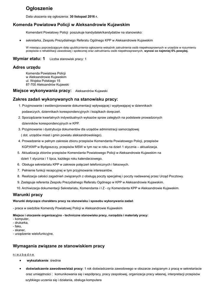 Ogłoszenie Data ukazania się ogłoszenia: 30 listopad 2016 r. Komenda Powiatowa Policji w Aleksandrowie Kujawskim Komendant Powiatowy Policji poszukuje kandydatek/kandydatów na stanowisko: sekretarka, Zespołu Prezydialnego Referatu Ogólnego KPP w Aleksandrowie Kujawskim W miesiącu poprzedzającym datę upublicznienia ogłoszenia wskaźnik zatrudnienia osób niepełnosprawnych w urzędzie w rozumieniu przepisów o rehabilitacji zawodowej i społecznej oraz zatrudnianiu osób niepełnosprawnych, wynosi co najmniej 6% powyżej. Wymiar etatu: 1 Liczba stanowisk pracy: 1 Adres urzędu Komenda Powiatowa Policji w Aleksandrowie Kujawskim ul. Wojska Polskiego 15 87-700 Aleksandrów Kujawski Miejsce wykonywania pracy: Aleksandrów Kujawski Zakres zadań wykonywanych na stanowisku pracy: 1. Przyjmowanie i ewidencjonowanie dokumentacji wpływającej i wypływającej w dziennikach podawczych, dziennikach korespondencyjnych i książkach doręczeń. 2. Sporządzanie kwartalnych indywidualnych wykazów spraw zaległych na podstawie prowadzonych dzienników korespondencyjnych w KPP. 3. Przyjmowanie i dystrybucja dokumentów dla urzędów administracji samorządowej ( dot. urzędów miast i gmin powiatu aleksandrowskiego). 4. Prowadzenie w pełnym zakresie zbioru przepisów Komendanta Powiatowego Policji, przepisów KGP,KWP w Bydgoszczy, przepisów MSW w tym raz w roku na dzień 1 stycznia – aktualizacja. 5. Aktualizacja zbiorów przepisów Komendanta Powiatowego Policji w Aleksandrowie Kujawskim na dzień 1 stycznia i 1 lipca, każdego roku kalendarzowego. 6. Obsługa sekretariatu KPP w zakresie połączeń telefonicznych i faksowych. 7. Pełnienie funkcji recepcyjnej w tym przyjmowanie interesantów. 8. Realizacja całości zagadnień związanych z obsługą poczty specjalnej i poczty nadawanej przez Urząd Pocztowy. 9. Zastępuje referenta Zespołu Prezydialnego Referatu Ogólnego w KPP w Aleksandrowie Kujawskim. 10. Archiwizacja dokumentacji Sekretariatu, Komendanta i I Z - cy Komendanta KPP w Aleksandrowie Kujawskim. Warunki pracy Warunki dotyczące charakteru pracy na stanowisku i sposobu wykonywania zadań - praca w siedzibie Komendy Powiatowej Policji w Aleksandrowie Kujawskim Miejsce i otoczenie organizacyjno - techniczne stanowiska pracy, narzędzia i materiały pracy: - komputer, - drukarka, - faks, - skaner, - urządzenie wielofunkcyjne, Wymagania związane ze stanowiskiem pracy niezbędne wykształcenie: średnie doświadczenie zawodowe/staż pracy: 1 rok doświadczenia zawodowego w obszarze związanym z pracą w sekretariacie oraz umiejętności : komunikowania się i współpracy, pracy zespołowej, organizacja pracy własnej, interpretacji przepisów szybkiego uczenia się i działania, obsługa komputera wymagania dodatkowe znajomość zagadnień związanych z przetwarzaniem danych osobowych, doświadczenie pracy na podobnym stanowisku dyspozycyjność, samodzielność, komunikatywność Wymagane dokumenty i oświadczenia: życiorys i list motywacyjny oświadczenie o wyrażeniu zgody na przetwarzanie danych osobowych do celów rekrutacji oświadczenie o korzystaniu z pełni praw publicznych oświadczenie o nieskazaniu prawomocnym wyrokiem za umyślne przestępstwo lub umyślne przestępstwo skarbowe kopie dokumentów potwierdzających wykształcenie kopia dokumentu potwierdzającego posiadanie polskiego obywatelstwa lub oświadczenie o posiadaniu obywatelstwa polskiego kopia poświadczenia bezpieczeństwa uprawniającego do dostępu do informacji niejawnych oznaczonych klauzulą "poufne" lub oświadczenie o wyrażeniu zgody na przeprowadzenie postępowania sprawdzającego zgodnie z ustawą z dnia 5 sierpnia 2010 r. o ochronie informacji niejawnych (Dz. U. Nr 182, poz. 1228 ze zm.), kopia dowodu osobistego, wskazane jest aby osoby niepełnosprawne złożyły kopię orzeczenia o niepełnosprawności Termin składania dokumentów: 05-12-2016 Miejsce składania dokumentów: Komenda Powiatowa Policji Wojska Polskiego 15 87-700 Aleksandrów Kujawski Oferty należy składać w zamkniętych kopertach z dopiskiem " Oferta zatrudnienia na stanowisko - sekretarka " Inne informacje: Praca w godzinach 07.30.-15.30. Zakwalifikowani kandydaci zostaną powiadomieni o dalszej procedurze kwalifikacyjnej. Osoby niepełnosprawne również mogą ubiegać się o stanowiska objęte niemnożnikowym systemem wynagradzania. Oferty nie zawierające wszystkich wymaganych dokumentów, nie podpisane własnoręcznie oraz oferty przesłane po terminie, nie będą rozpatrywane. Oferty odrzucone, zostaną komisyjnie zniszczone. Proponowane wynagrodzenie brutto, wynosi 2300 zł. Wytworzył/Odpowiada: Jednostka organizacyjna: Udostępniła/udostępnił: Komórka organizacyjna: Komendant Powiatowy Policji Komenda Powiatowa Policji w Aleksandrowie Kujawskim Sylwia Karpińska, kierownik Referatu Ogólnego KPP KPP Aleksandrów Kujawski